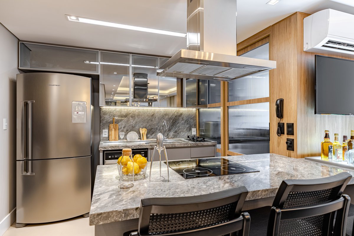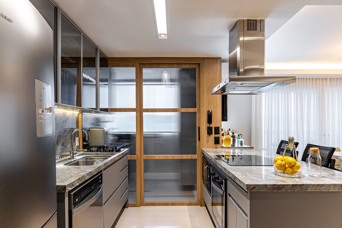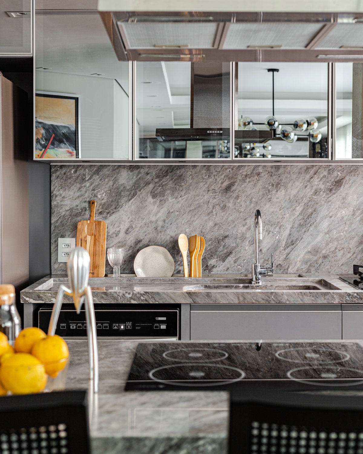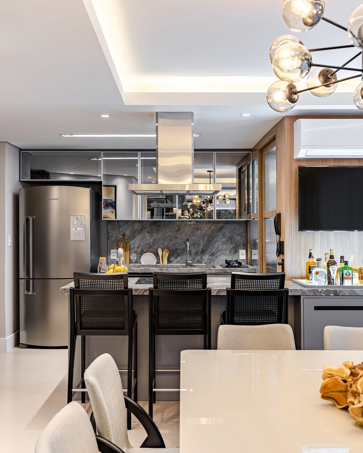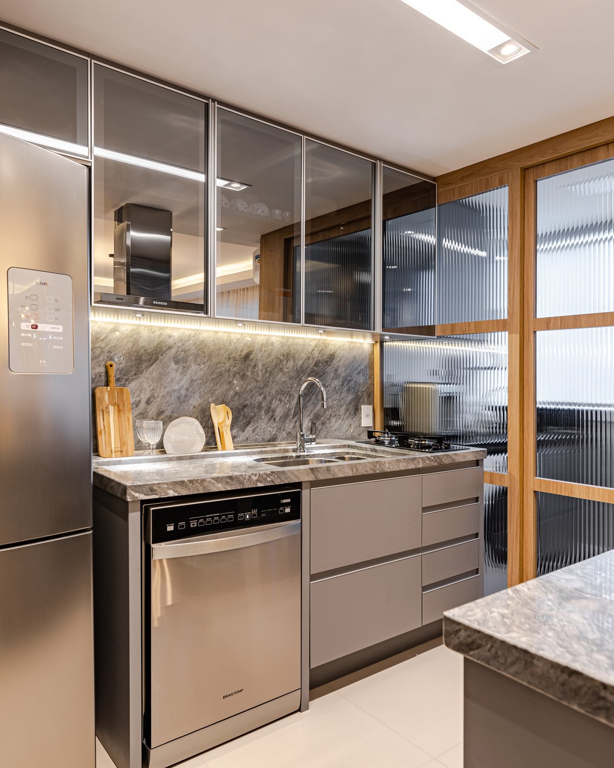 O charme da cozinha ficou por conta da pedra escolhida, um mármore cinza arabescato que harmonizou perfeitamente com os armários em mdf melamínico cinza.