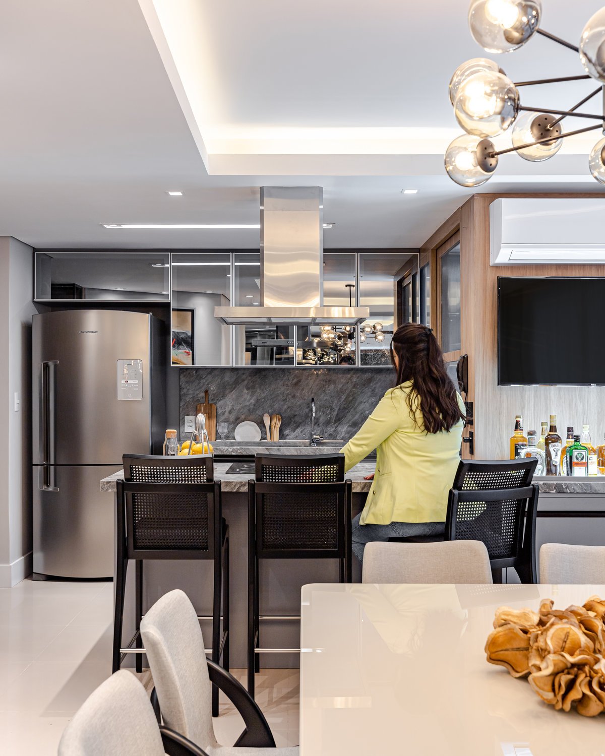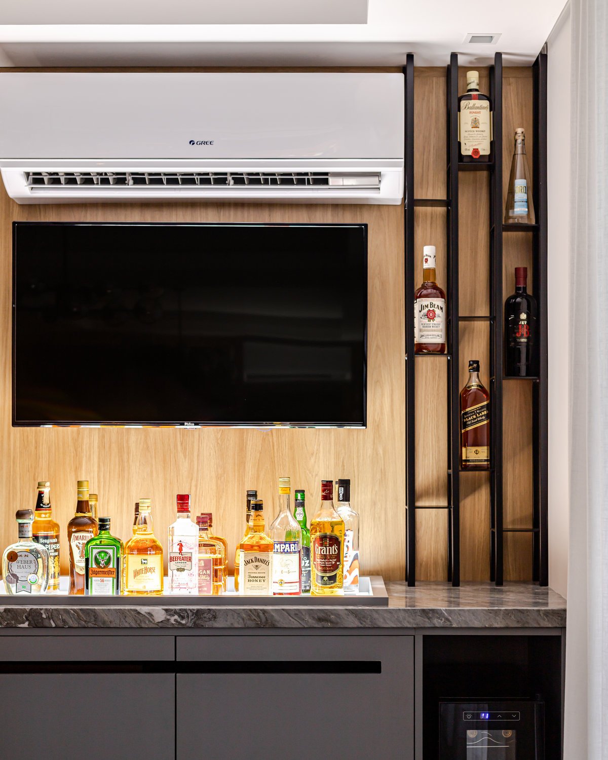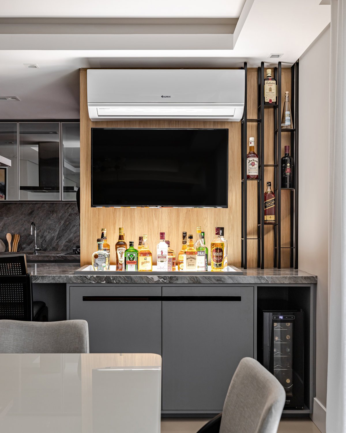 O bar também não passa despercebido: as garrafas foram dispostas sobre uma espécie de bandeja retroiluminada, embutida no tampo, trazendo um ar descontraído para os momentos em que recebem os amigos.