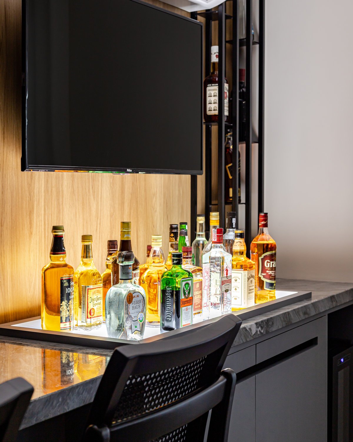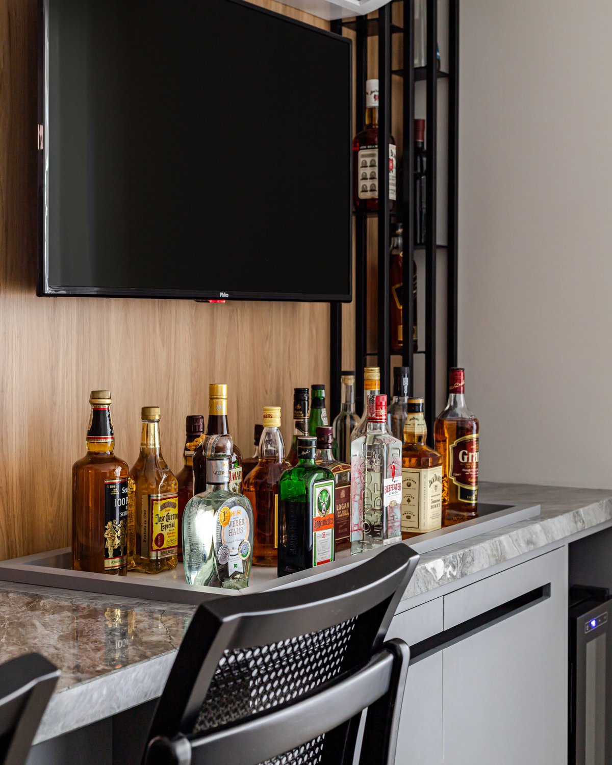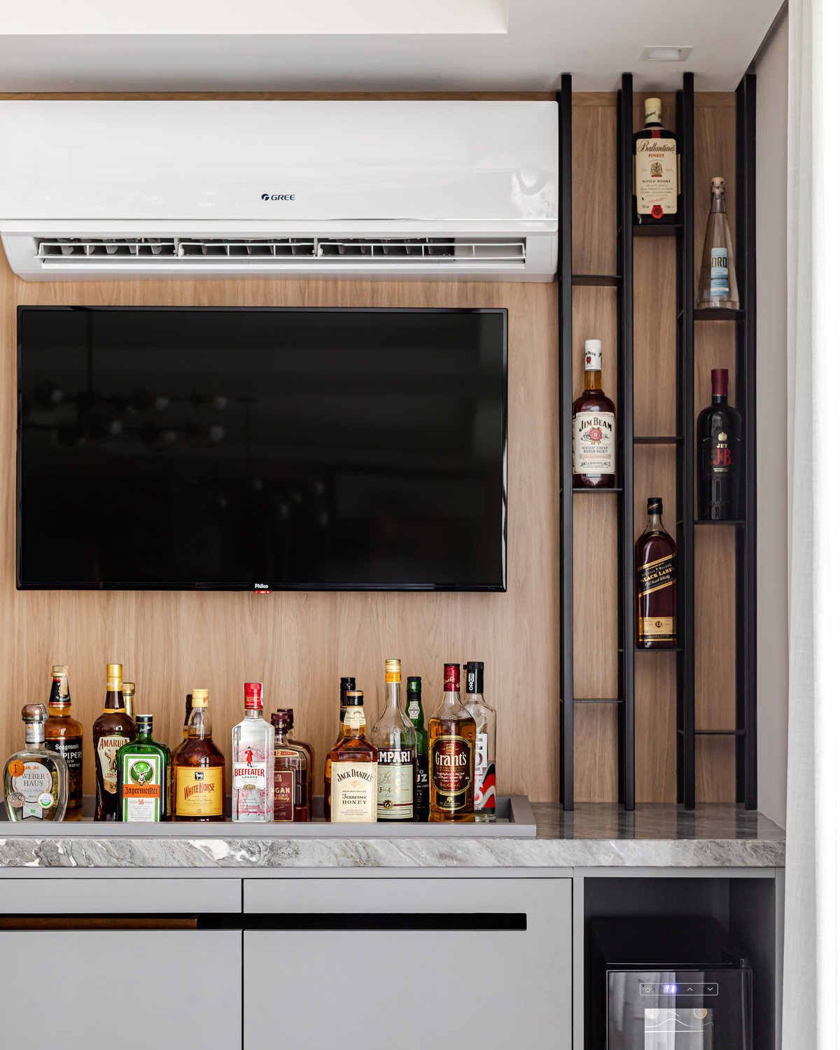 O bar também não passa despercebido: as garrafas foram dispostas sobre uma espécie de bandeja retroiluminada, embutida no tampo, trazendo um ar descontraído para os momentos em que recebem os amigos.