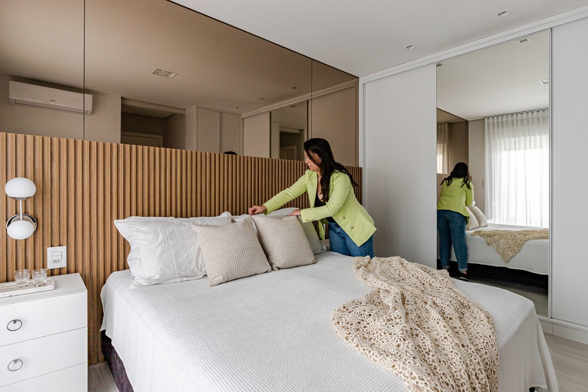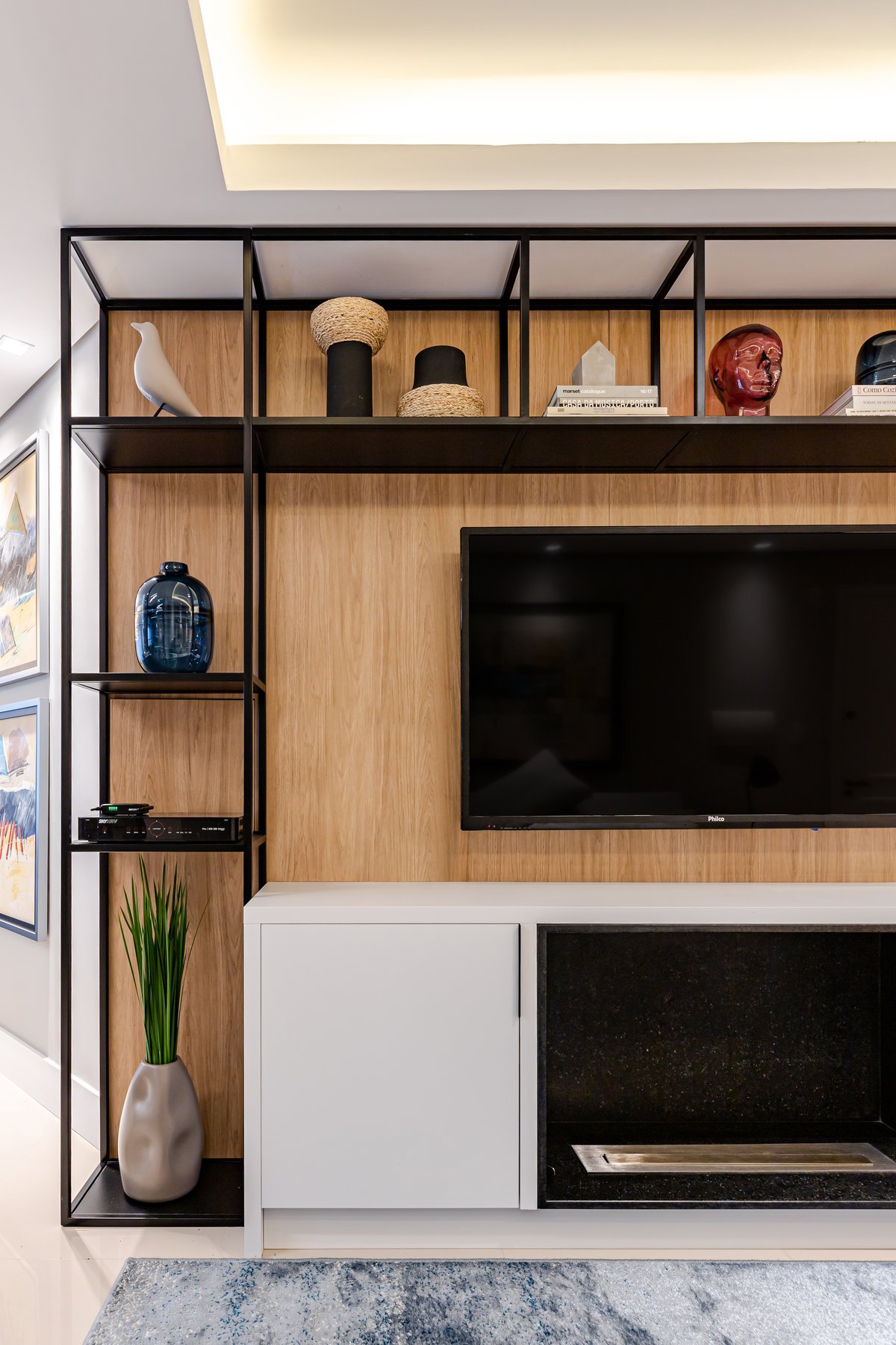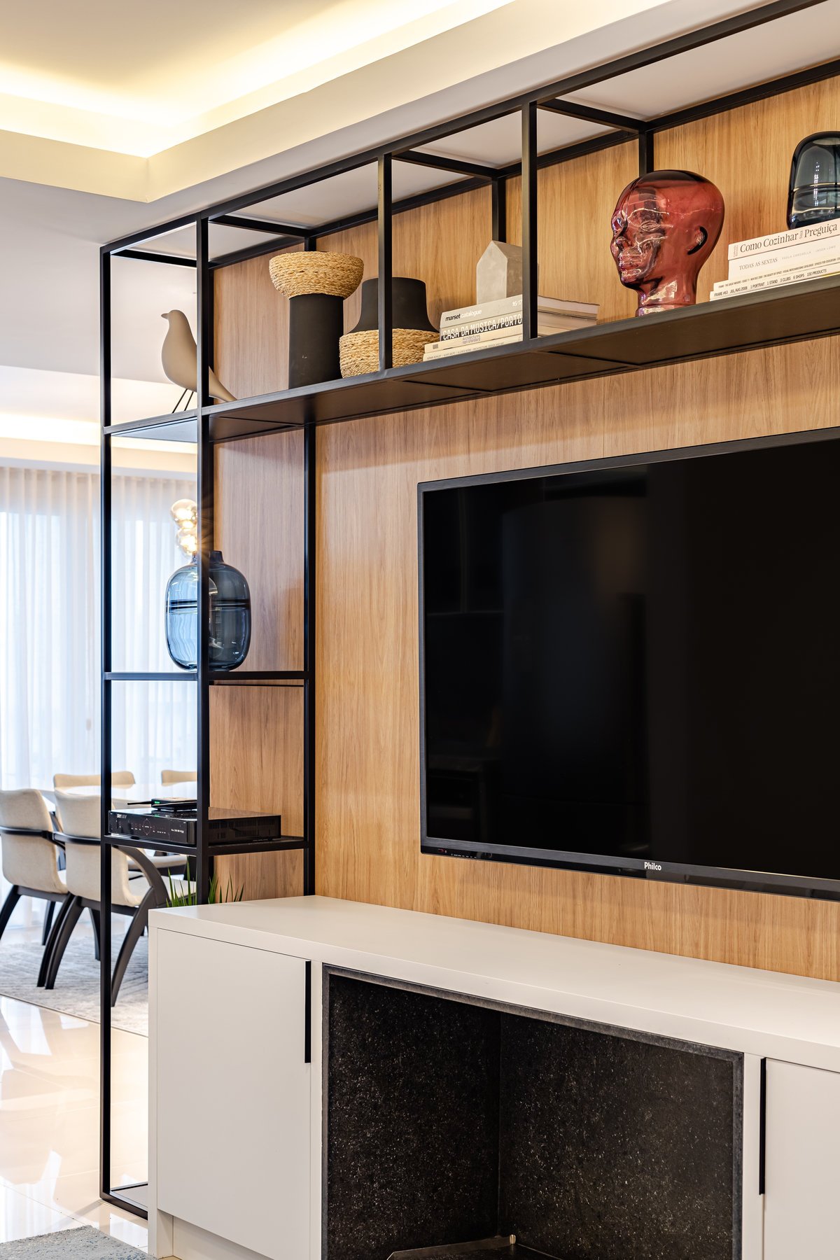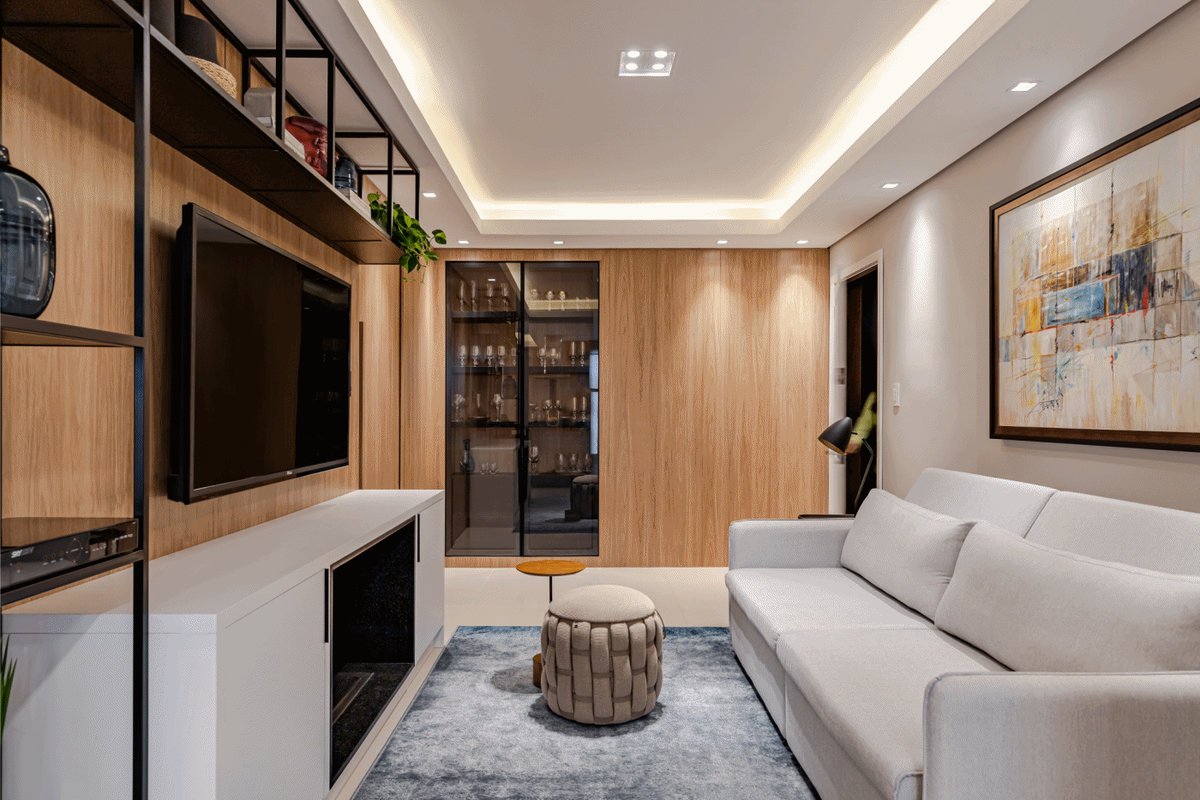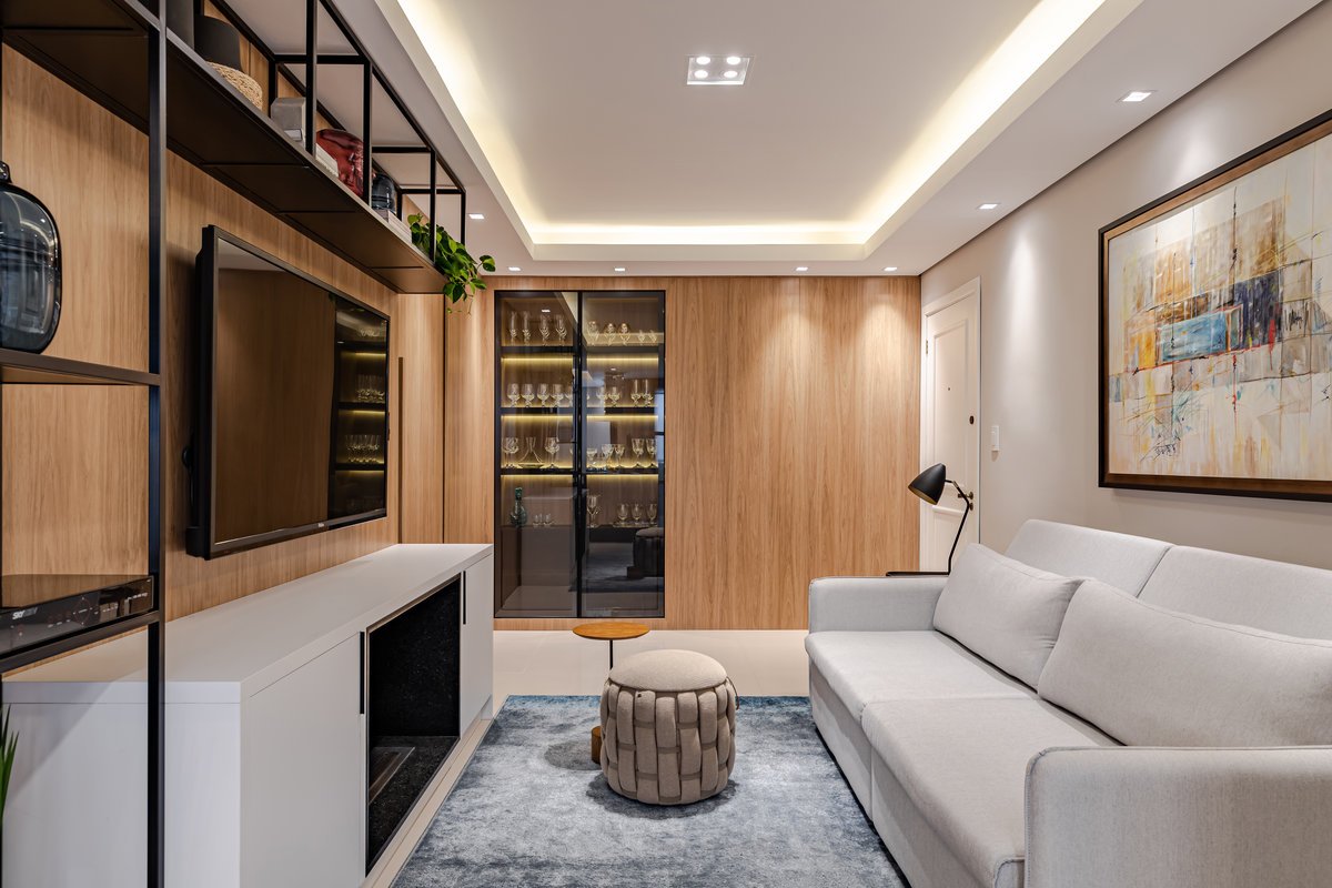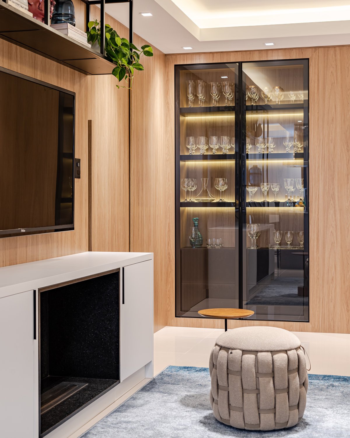 Para equilibrar a sensação fria do piso em porcelanato, entregue pela construtora, as paredes foram revestidas com painéis amadeirados, tornando o ambiente mais acolhedor. Nesse mesmo painel, a porta para a área íntima foi camuflada e, a pedido dos clientes, a cristaleira foi embutida em um vão já existente na parede — um local que, desde o início, o cliente afirmou ser o lugar perfeito para ela.