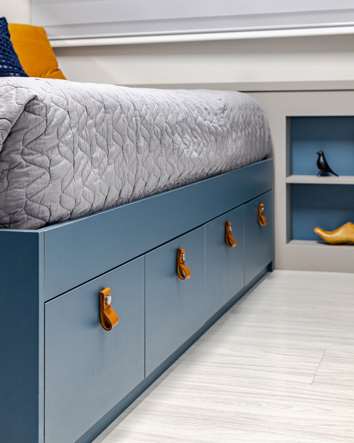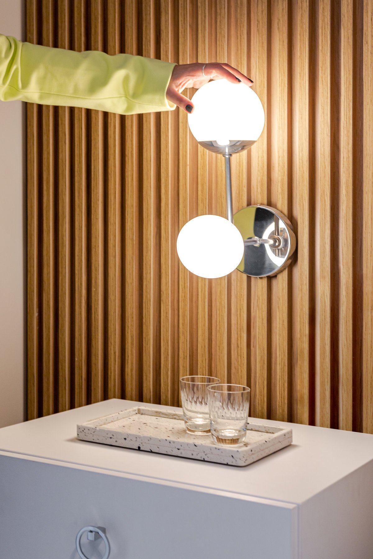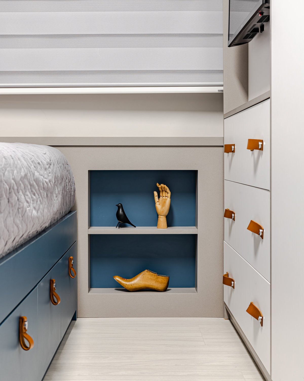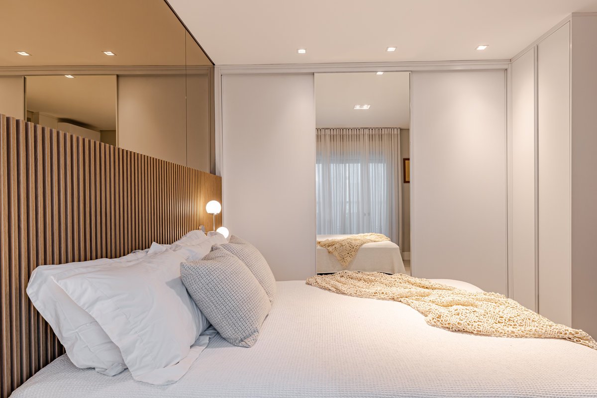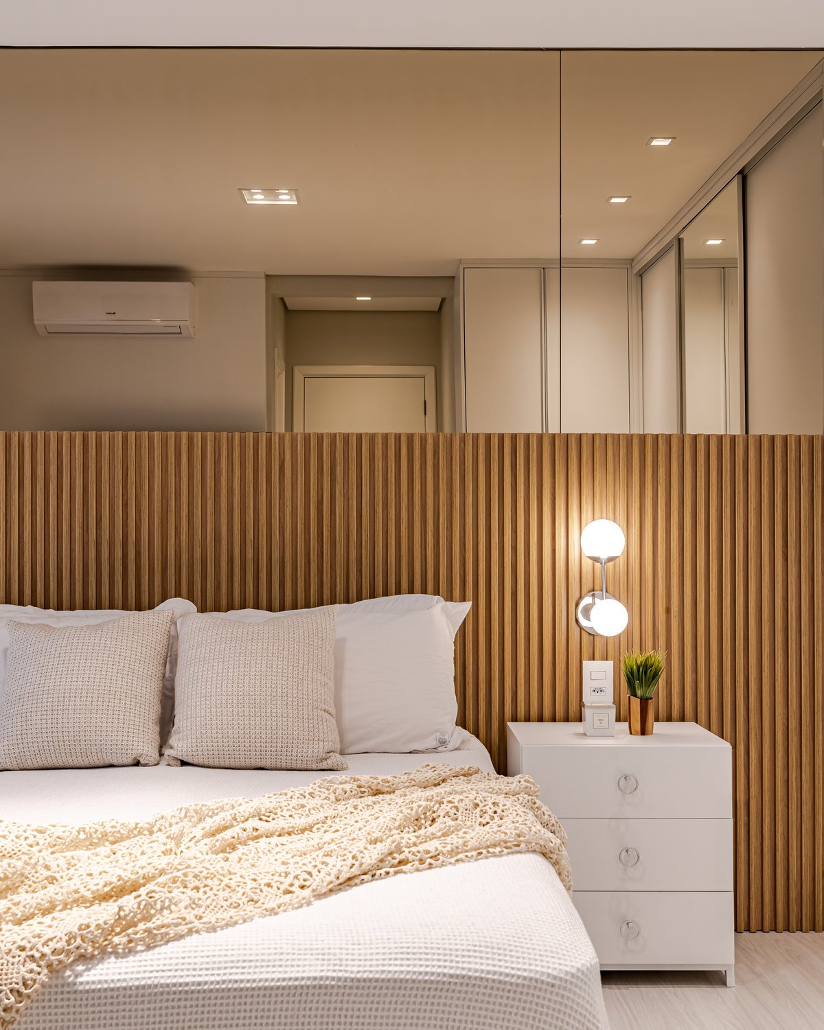 Para equilibrar a sensação fria do piso em porcelanato, entregue pela construtora, as paredes foram revestidas com painéis amadeirados, tornando o ambiente mais acolhedor. Nesse mesmo painel, a porta para a área íntima foi camuflada e, a pedido dos clientes, a cristaleira foi embutida em um vão já existente na parede — um local que, desde o início, o cliente afirmou ser o lugar perfeito para ela.
