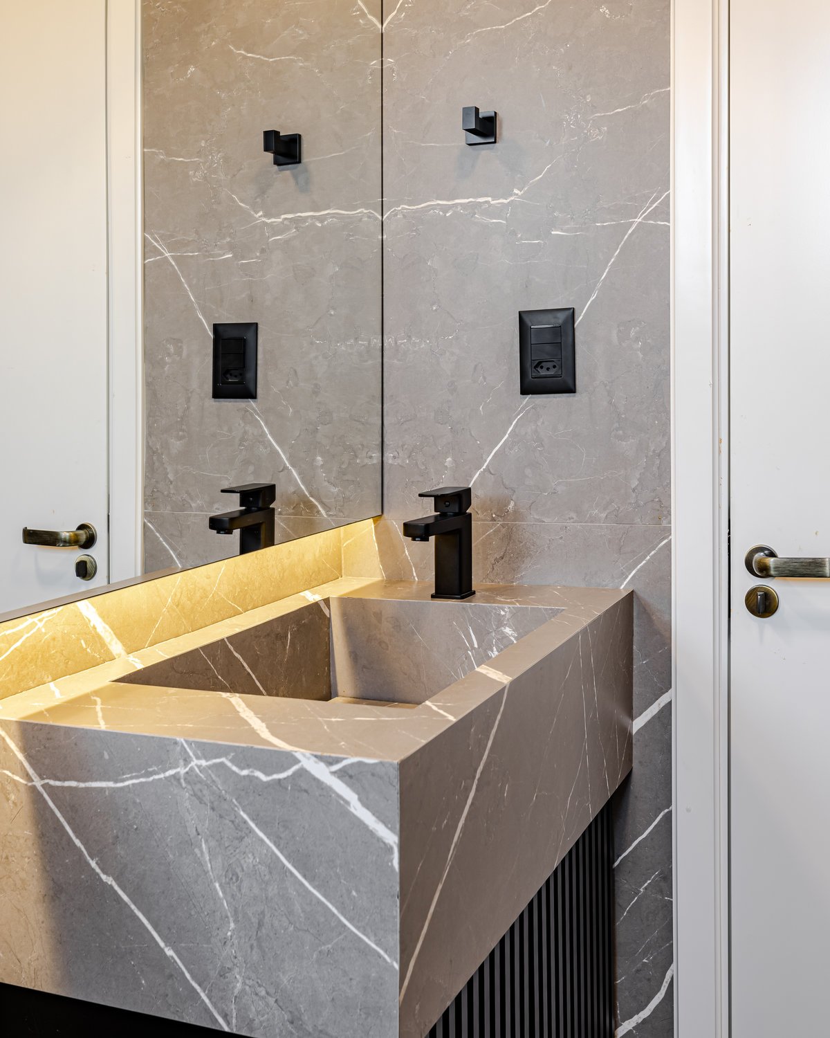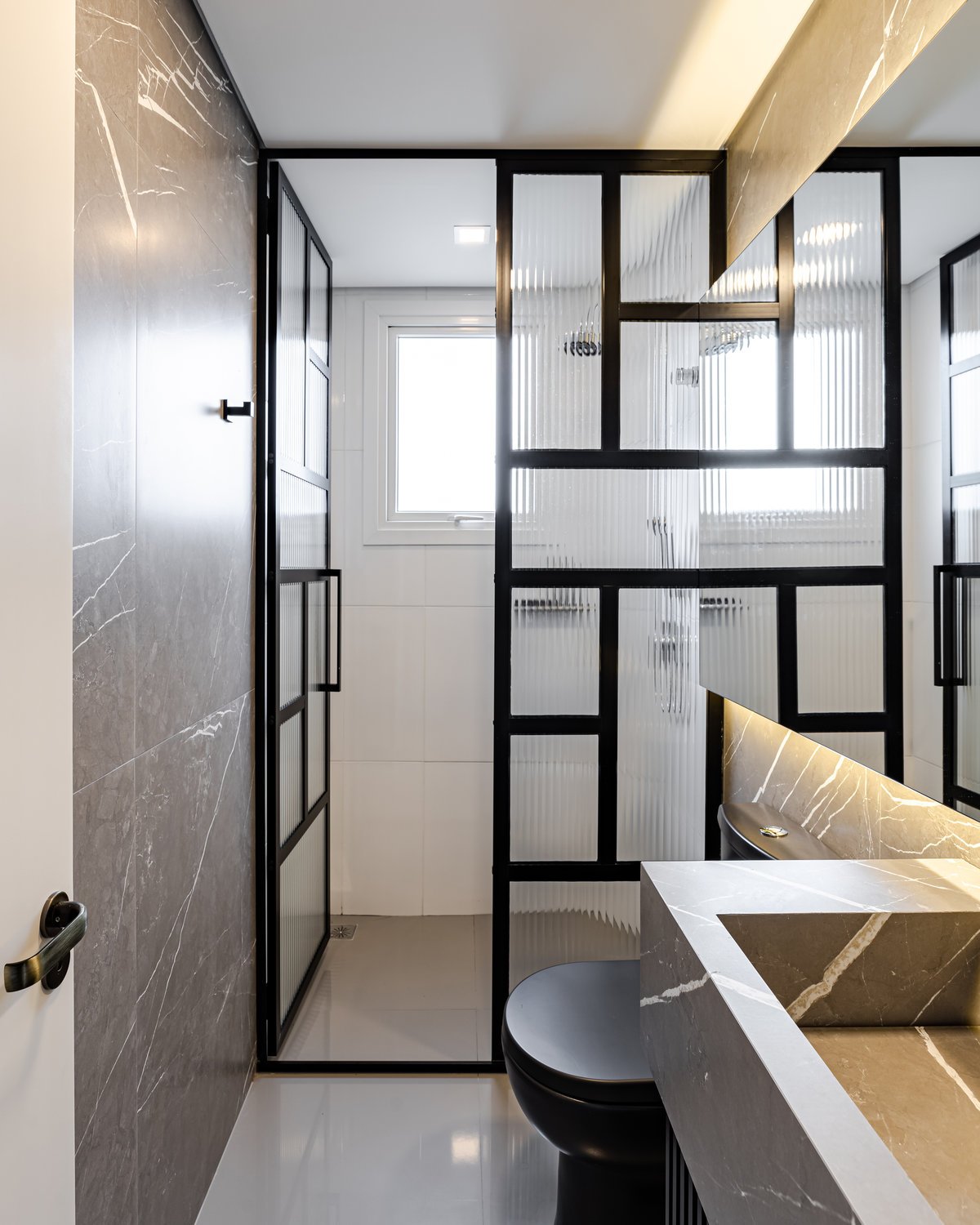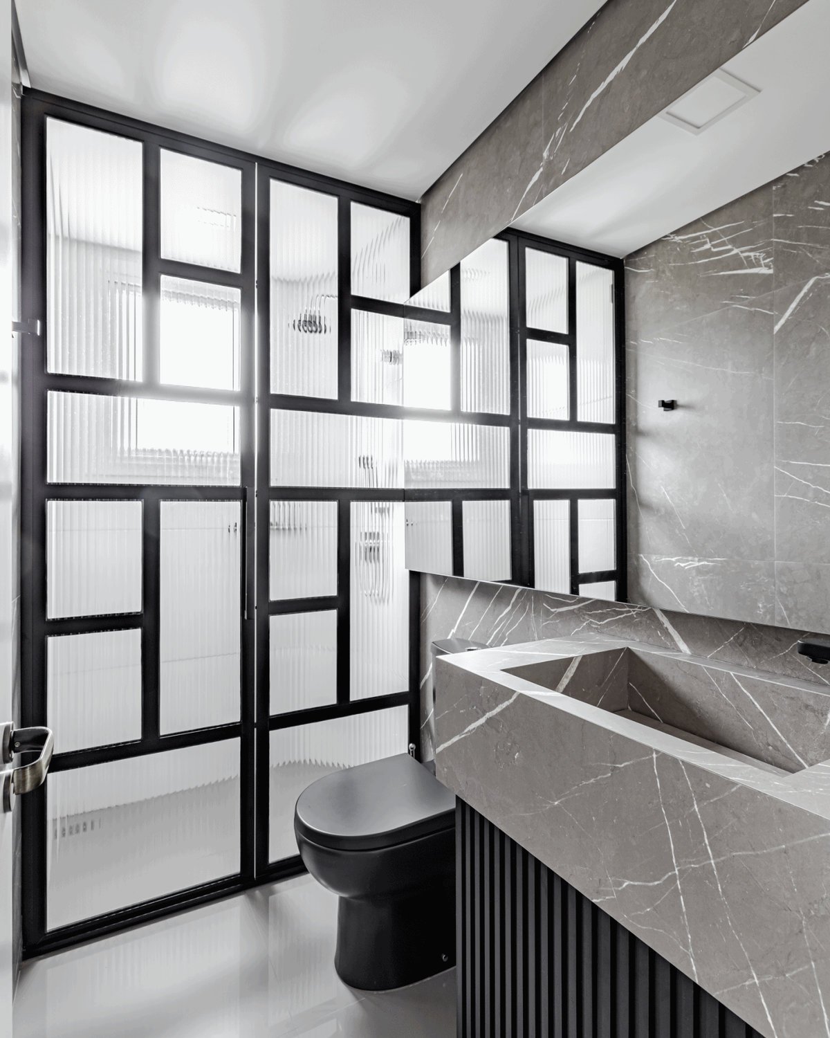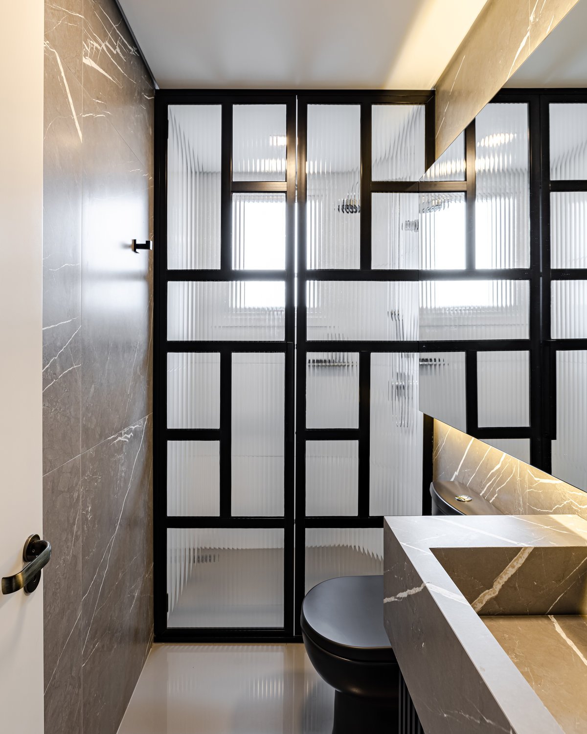 Vale destacar o banheiro social, que visualmente se transformou em um lavabo. Isso graças à porta do box, feita sob medida em alumínio preto com vidro canelado e um desenho pensado especialmente para o ambiente. Com esse recurso, a área de banho se integra ao conjunto sem chamar atenção. ‘