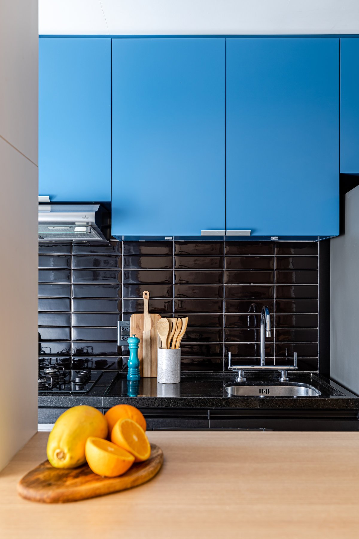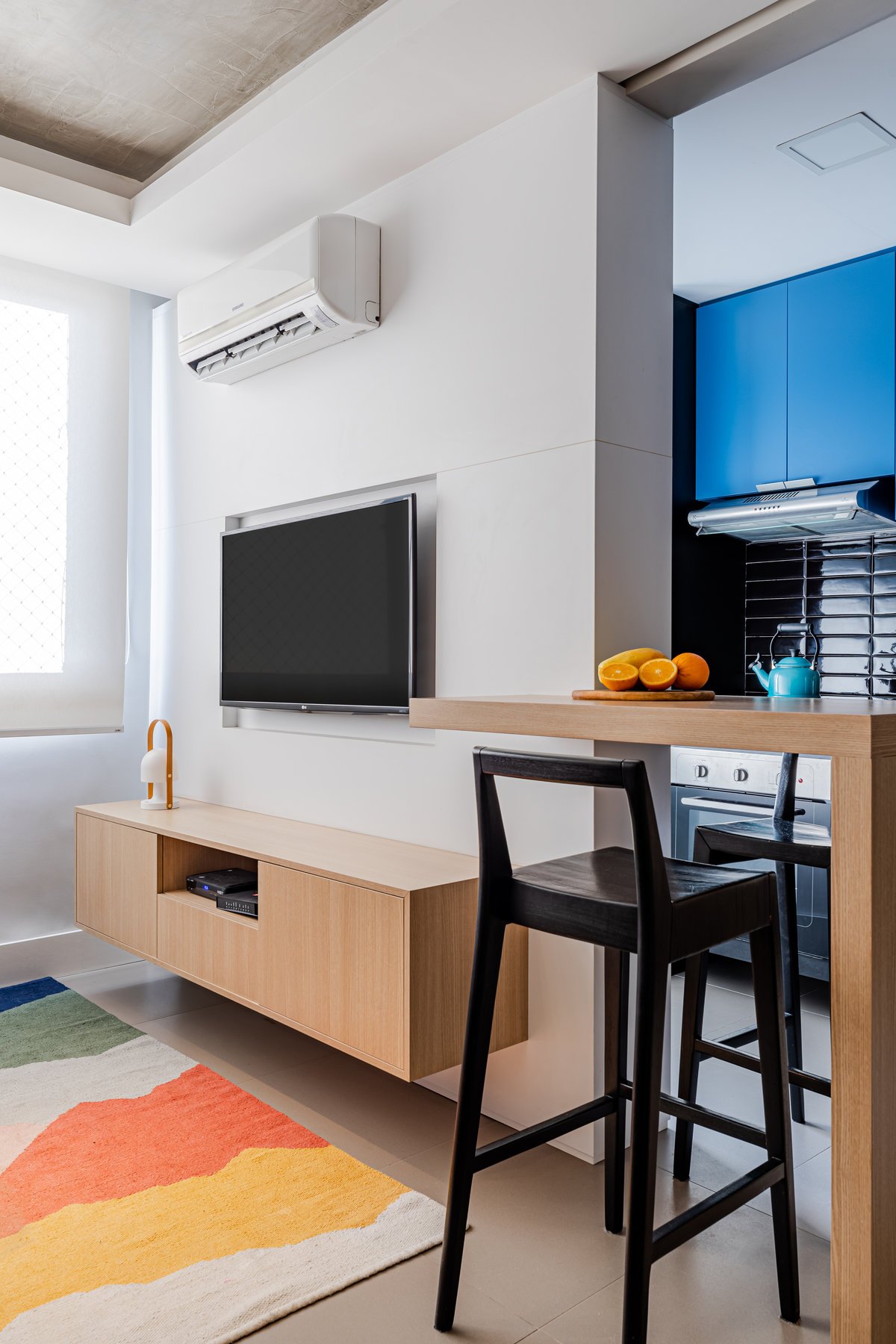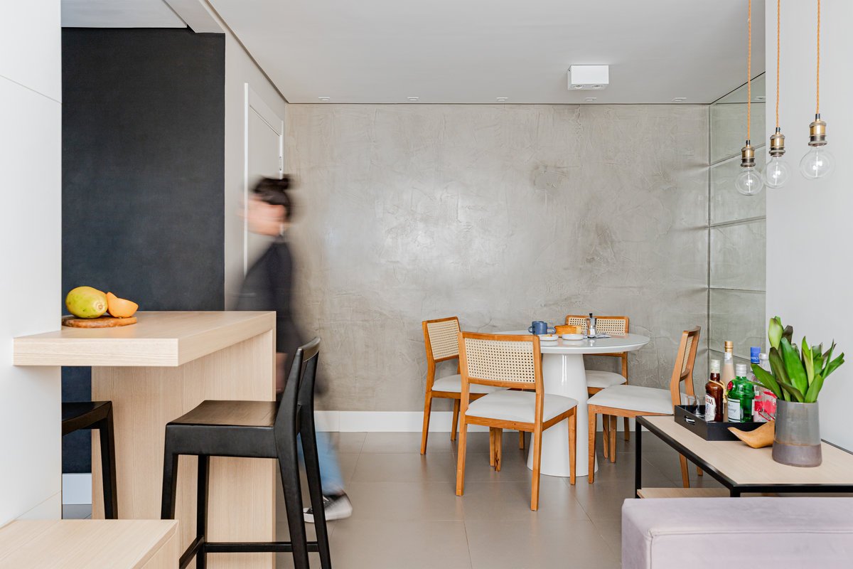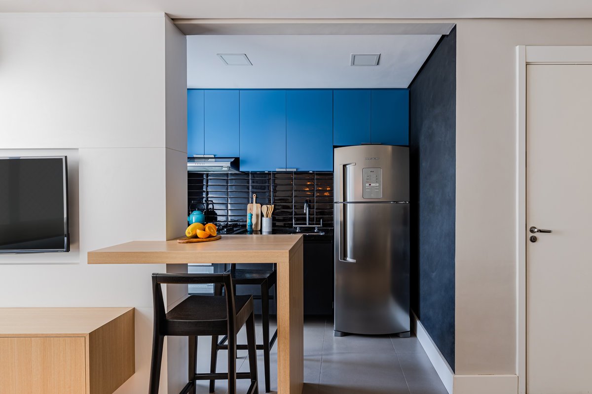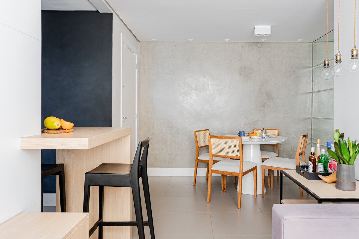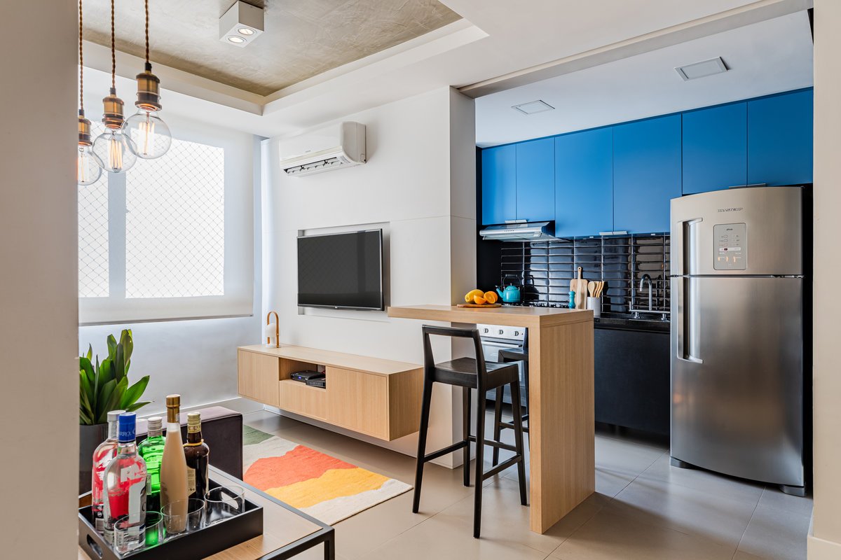 Além da parede que recebeu textura de cimento queimado, um rasgo no forro de gesso também foi revestido com a mesma textura, criando continuidade e profundidade ao ambiente. Com uma base neutra, as cores surgiram nos detalhes: o azul vibrante do armário aéreo da cozinha foi escolhido com cuidado para equilibrar com o tampo e o balcão pretos.