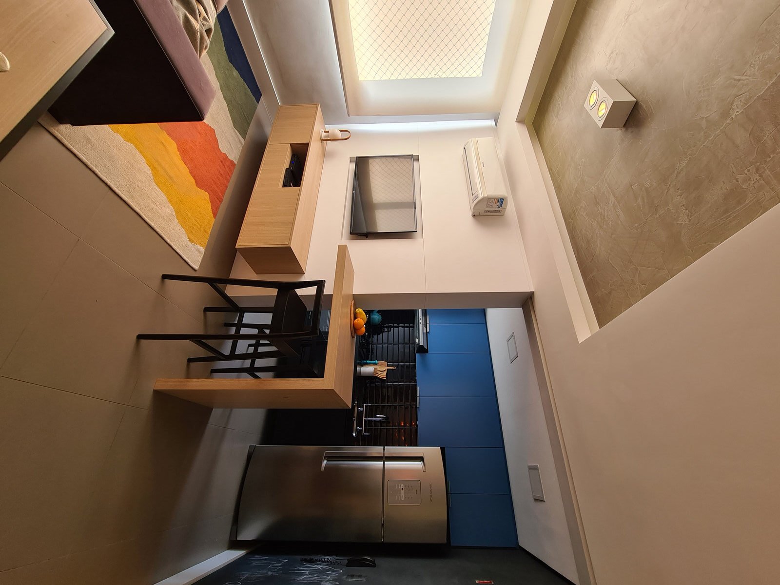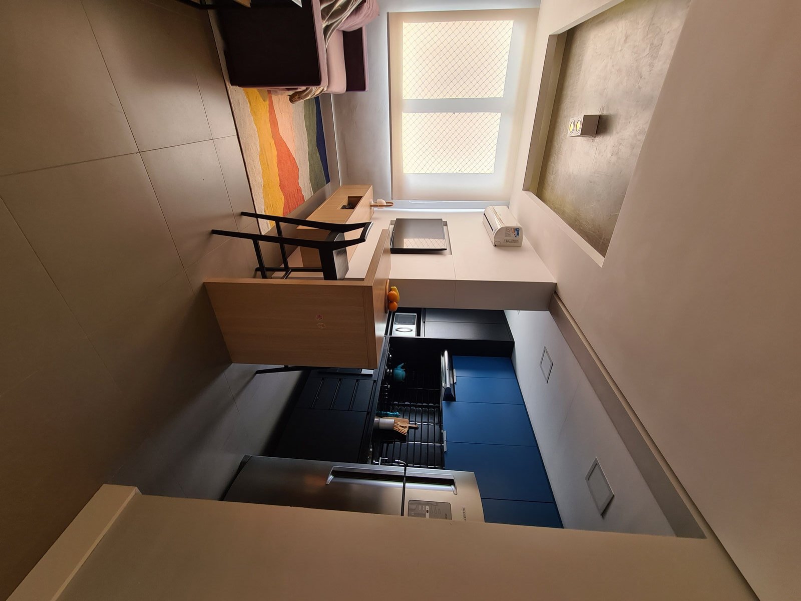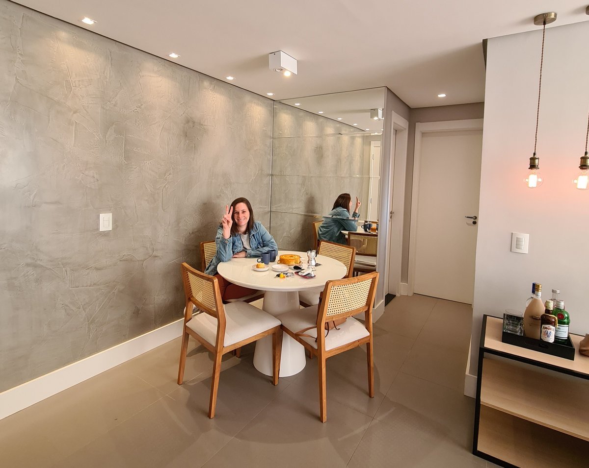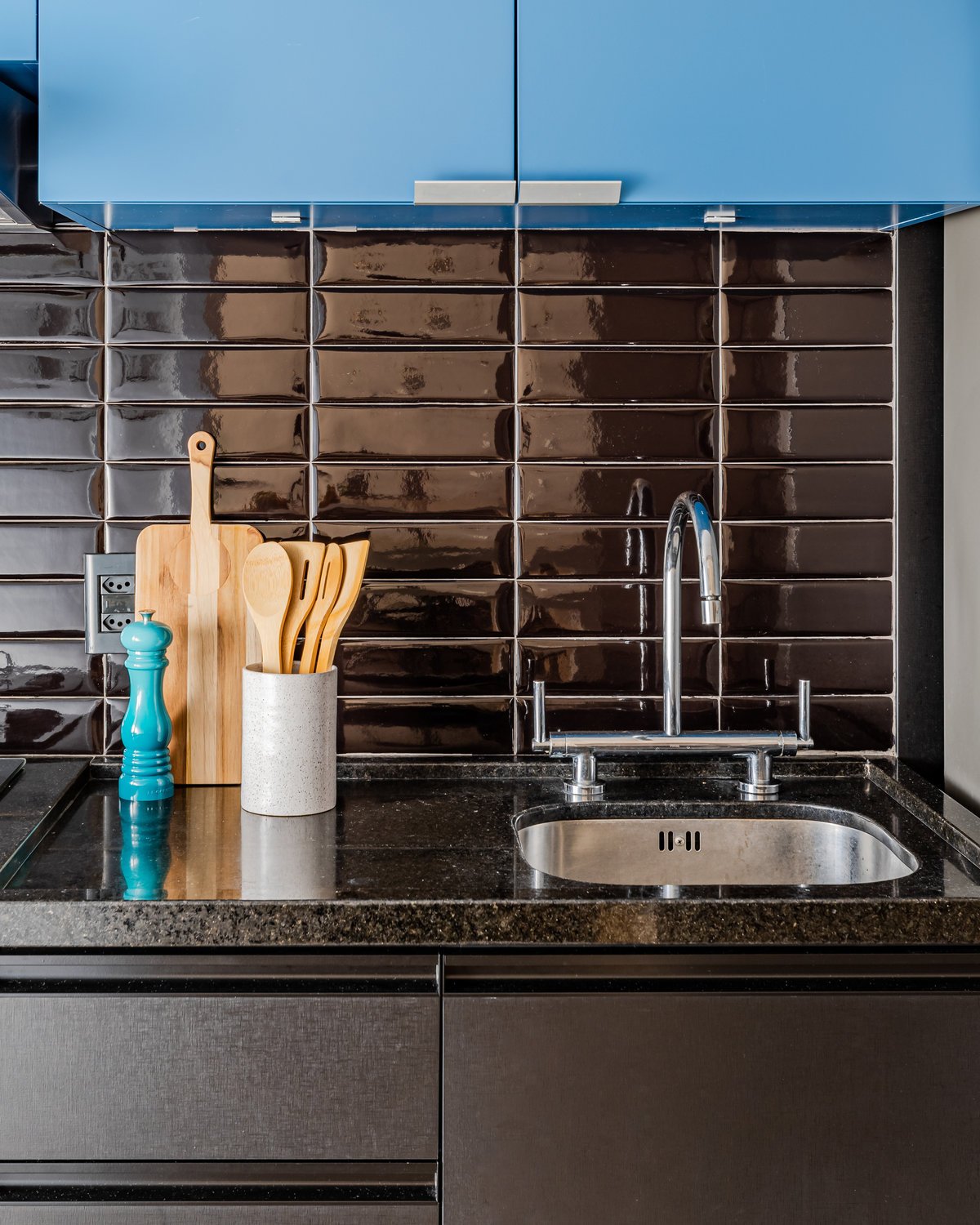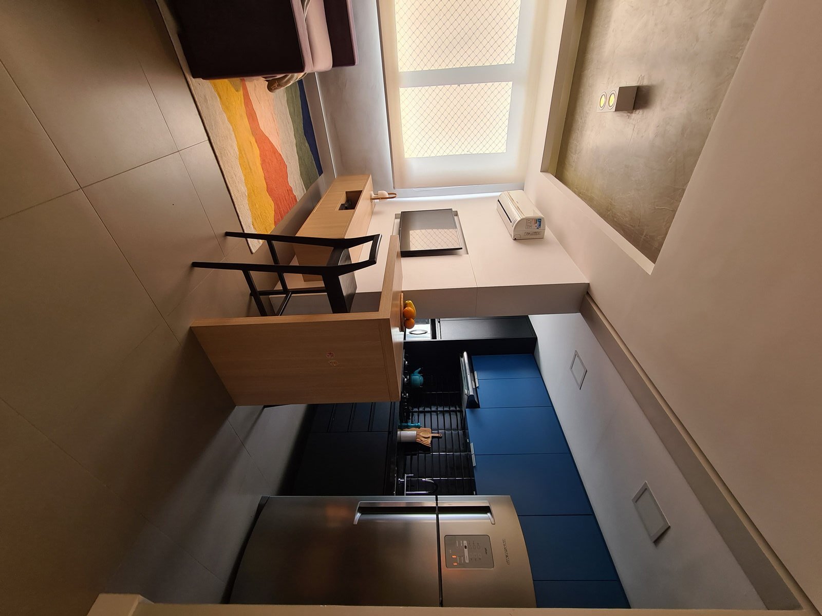 Além da parede que recebeu textura de cimento queimado, um rasgo no forro de gesso também foi revestido com a mesma textura, criando continuidade e profundidade ao ambiente. Com uma base neutra, as cores surgiram nos detalhes: o azul vibrante do armário aéreo da cozinha foi escolhido com cuidado para equilibrar com o tampo e o balcão pretos.