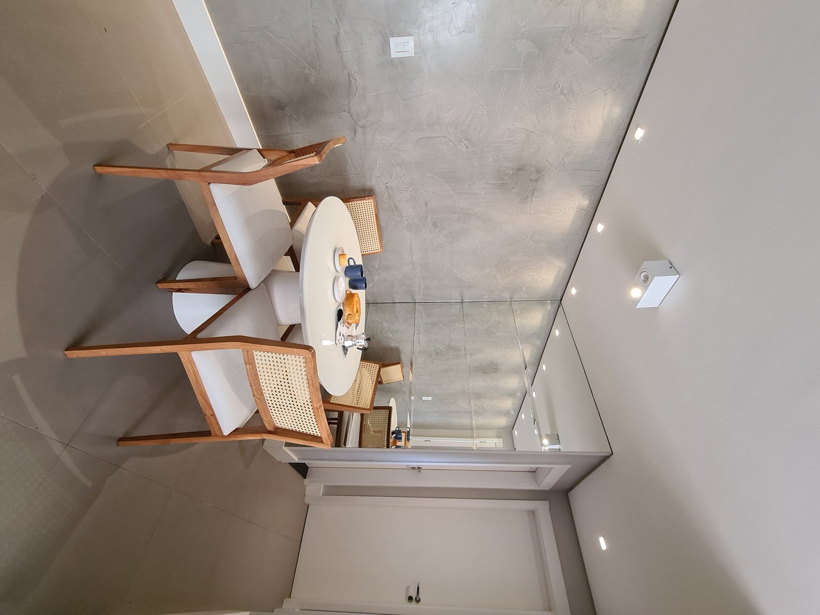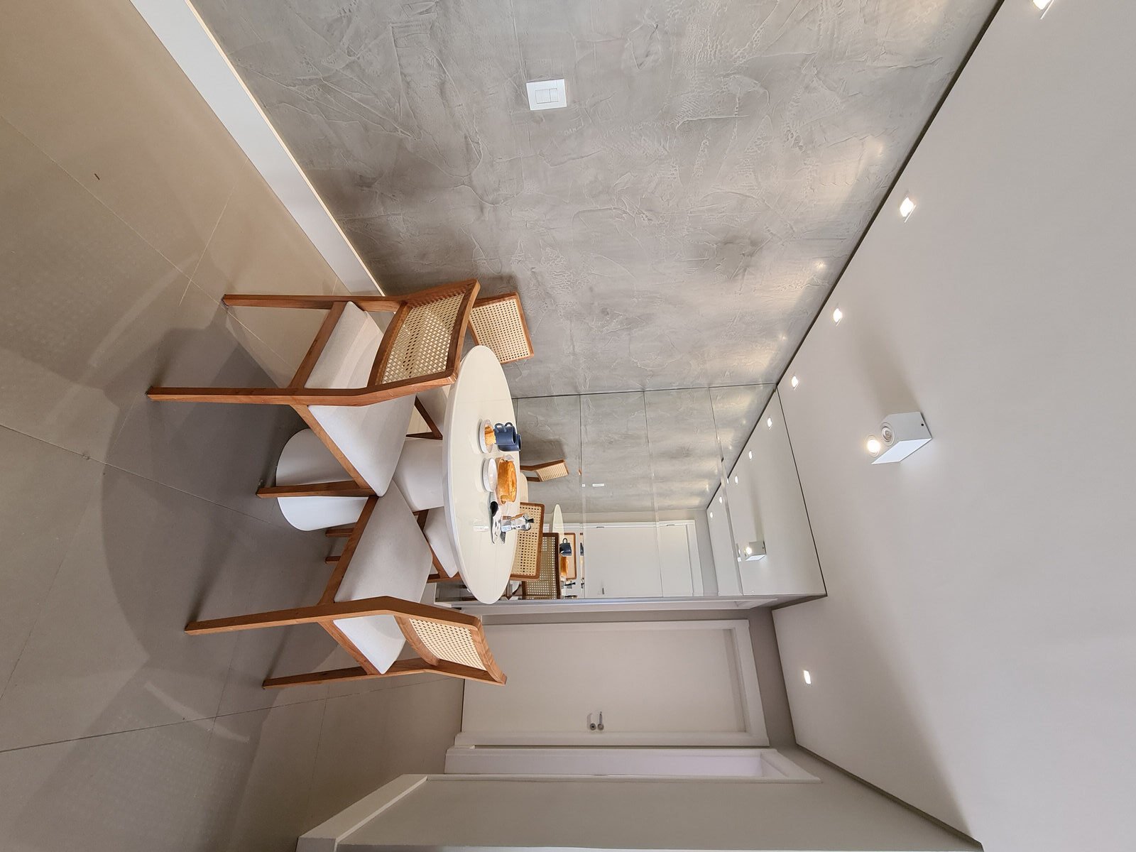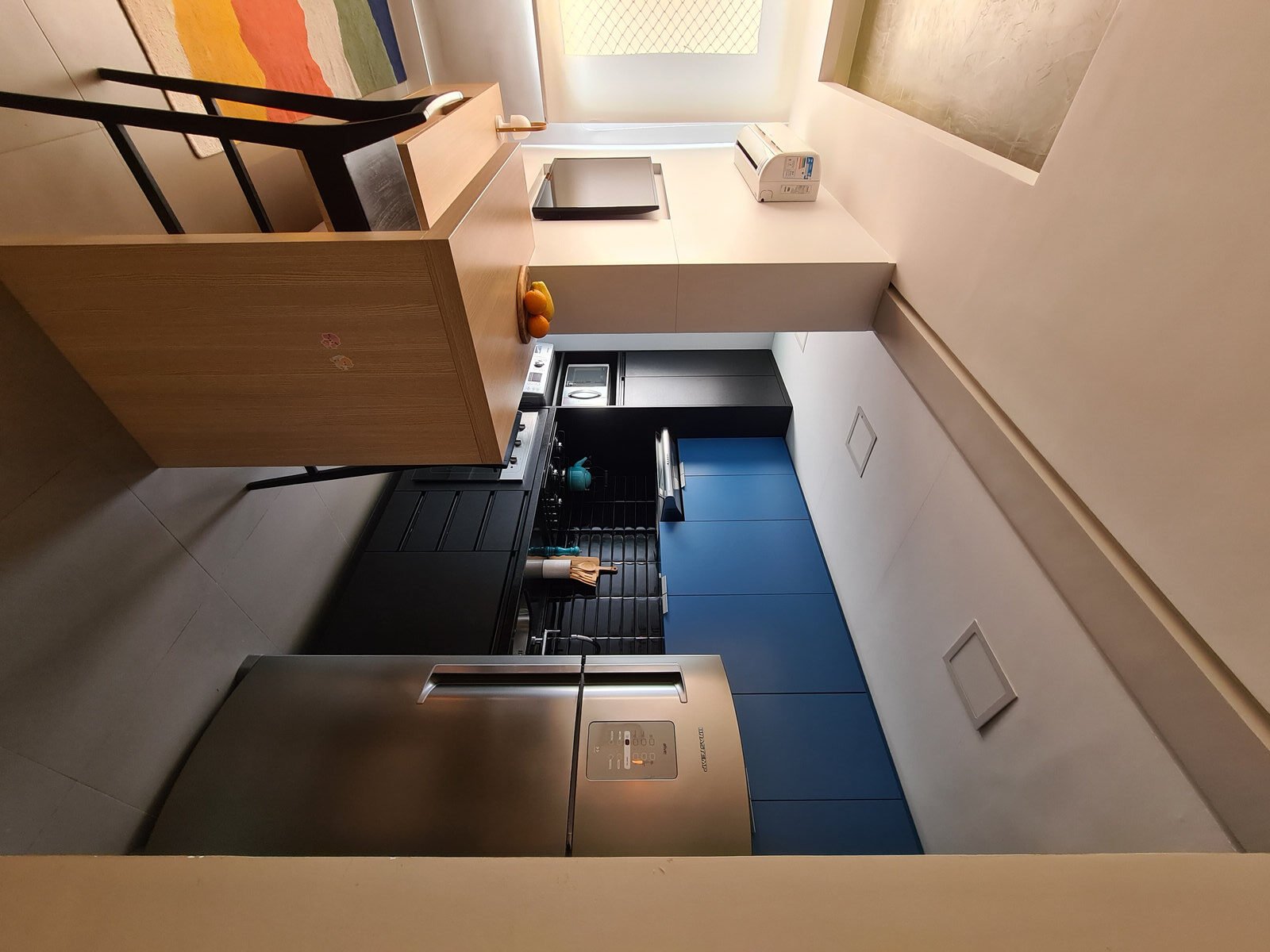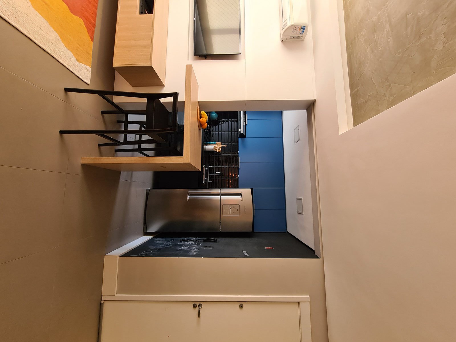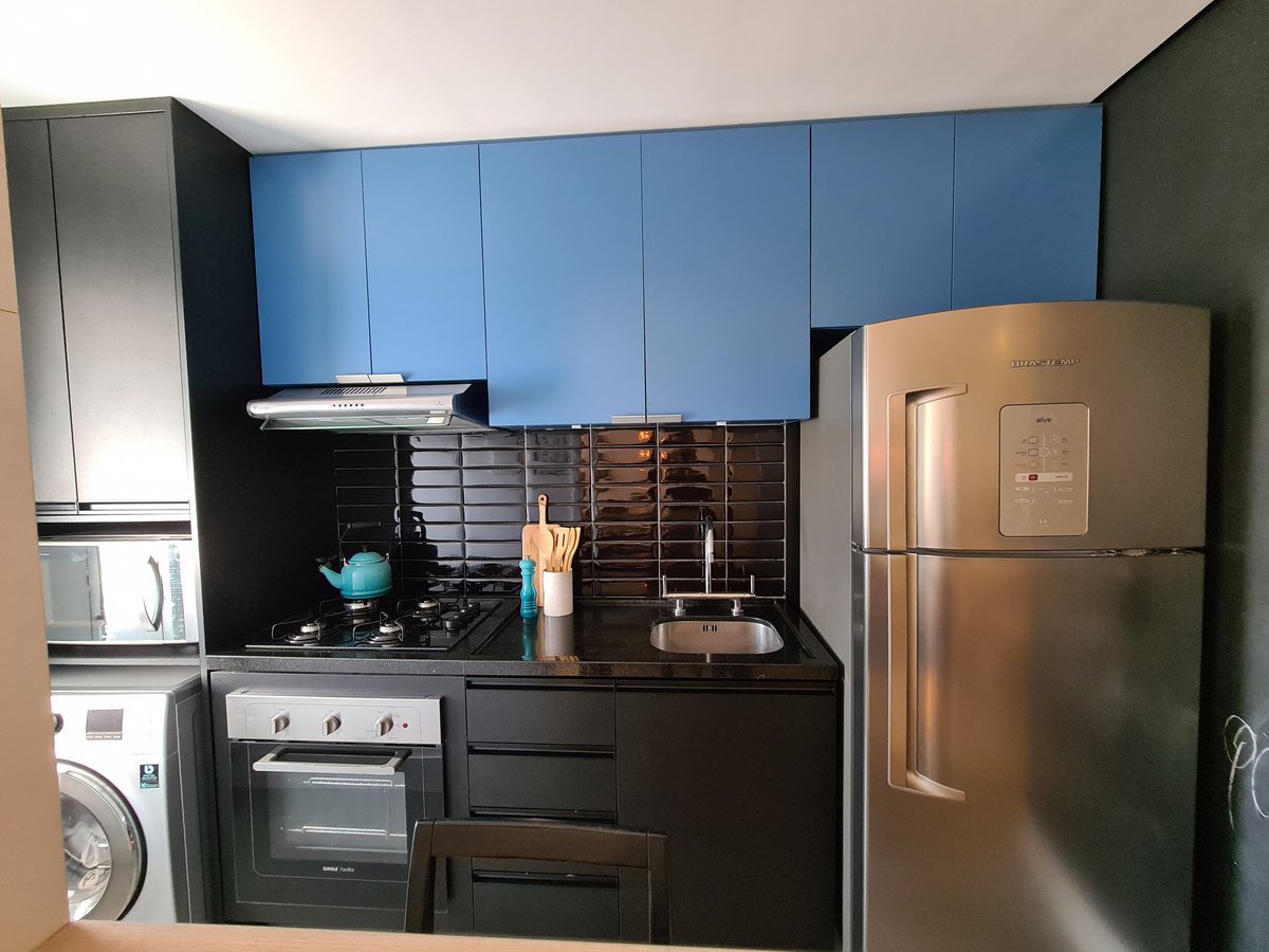 Além da parede que recebeu textura de cimento queimado, um rasgo no forro de gesso também foi revestido com a mesma textura, criando continuidade e profundidade ao ambiente. Com uma base neutra, as cores surgiram nos detalhes: o azul vibrante do armário aéreo da cozinha foi escolhido com cuidado para equilibrar com o tampo e o balcão pretos.