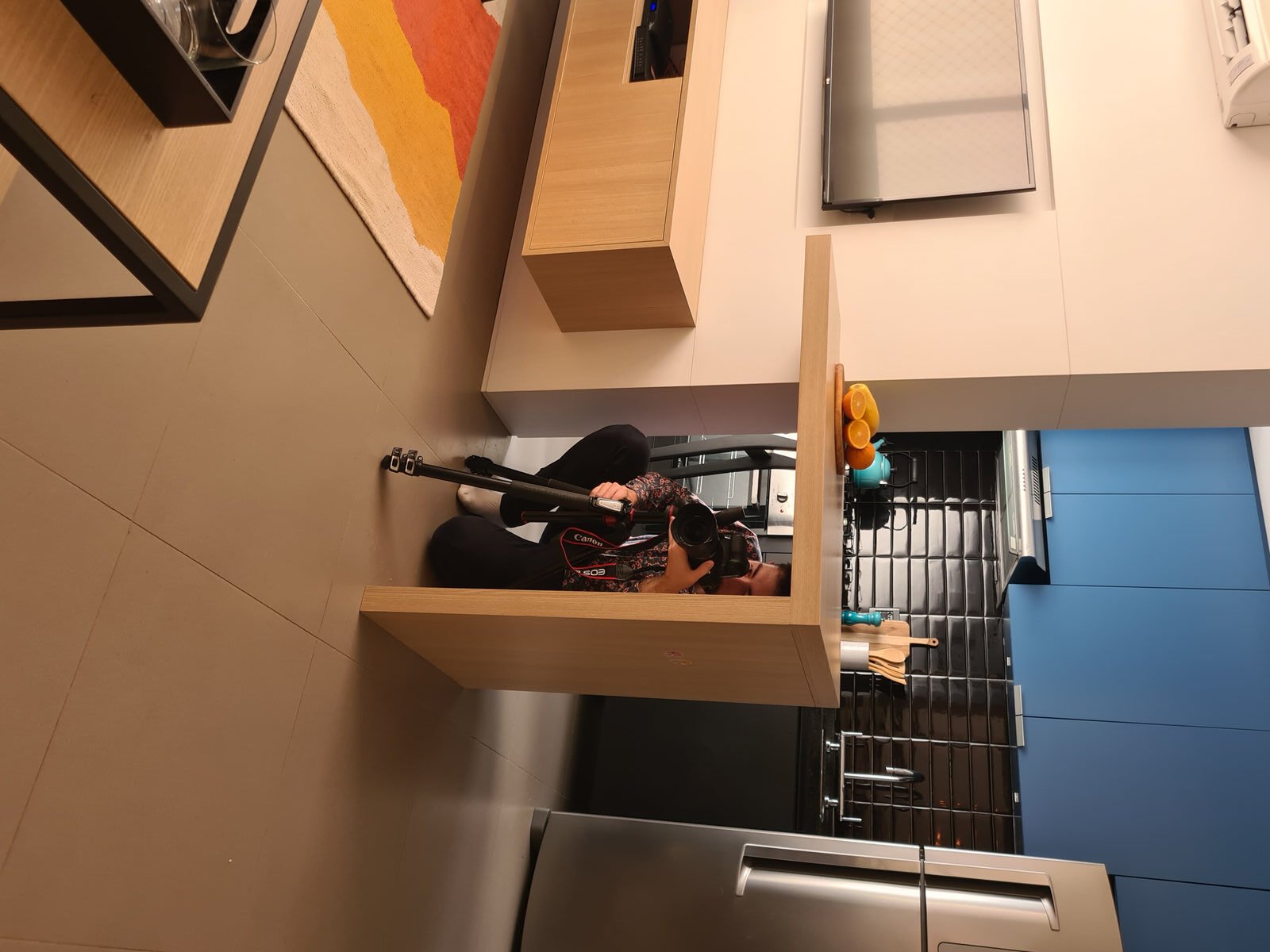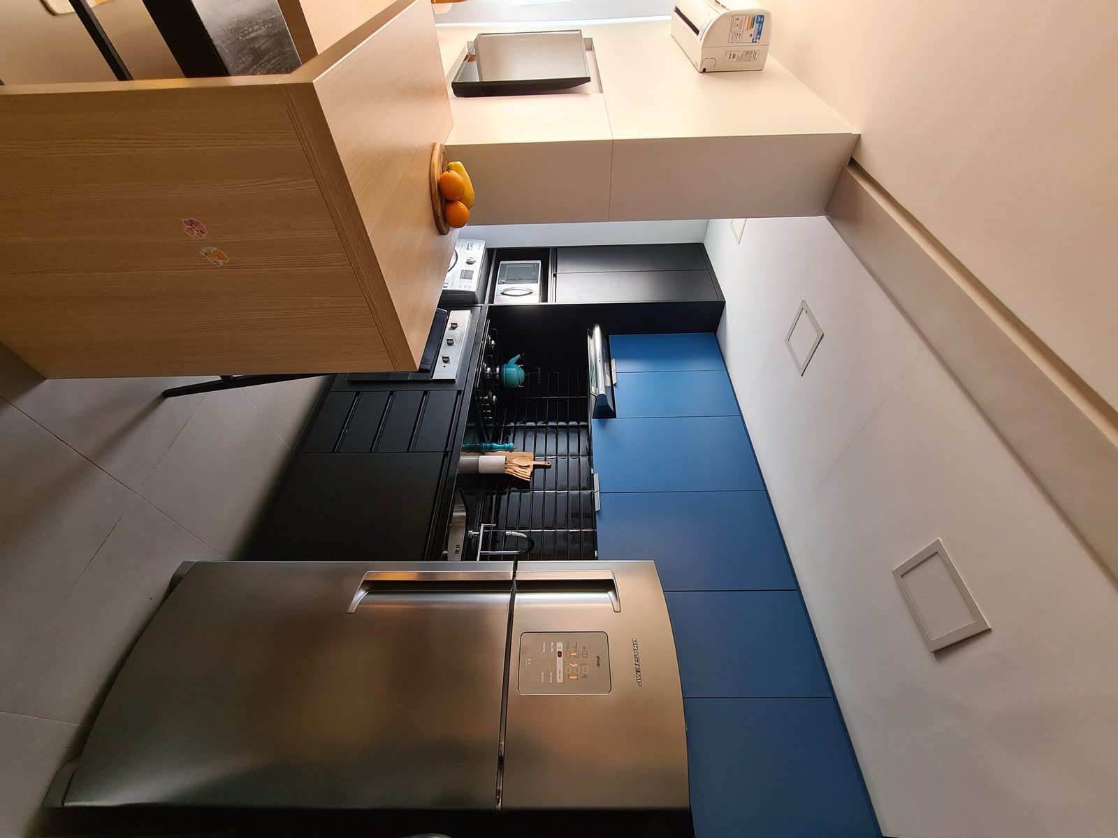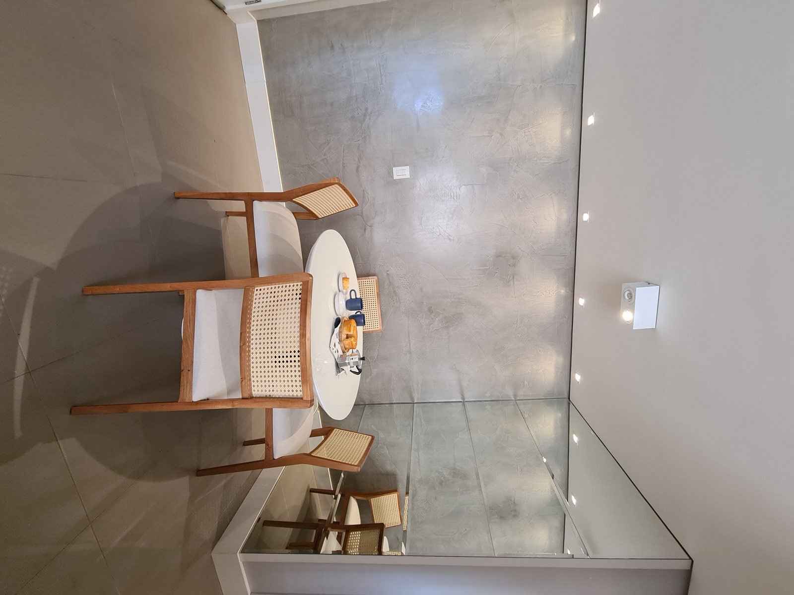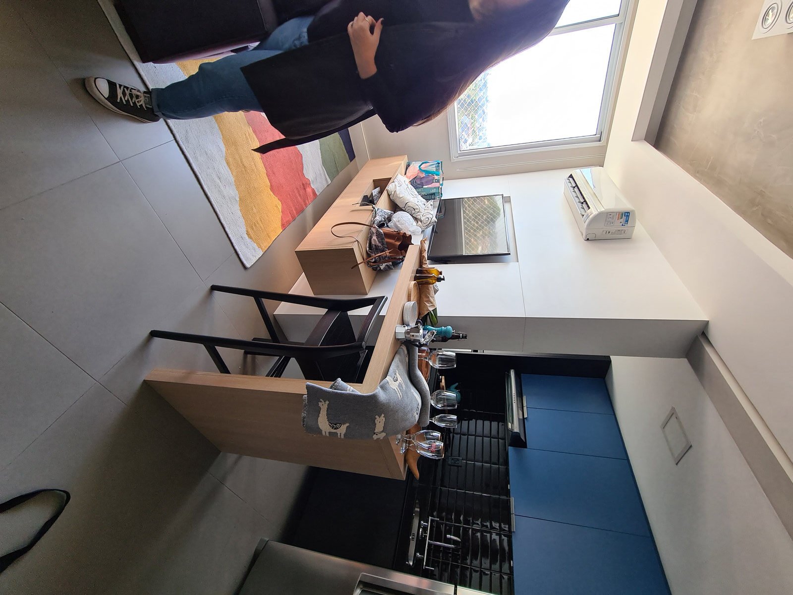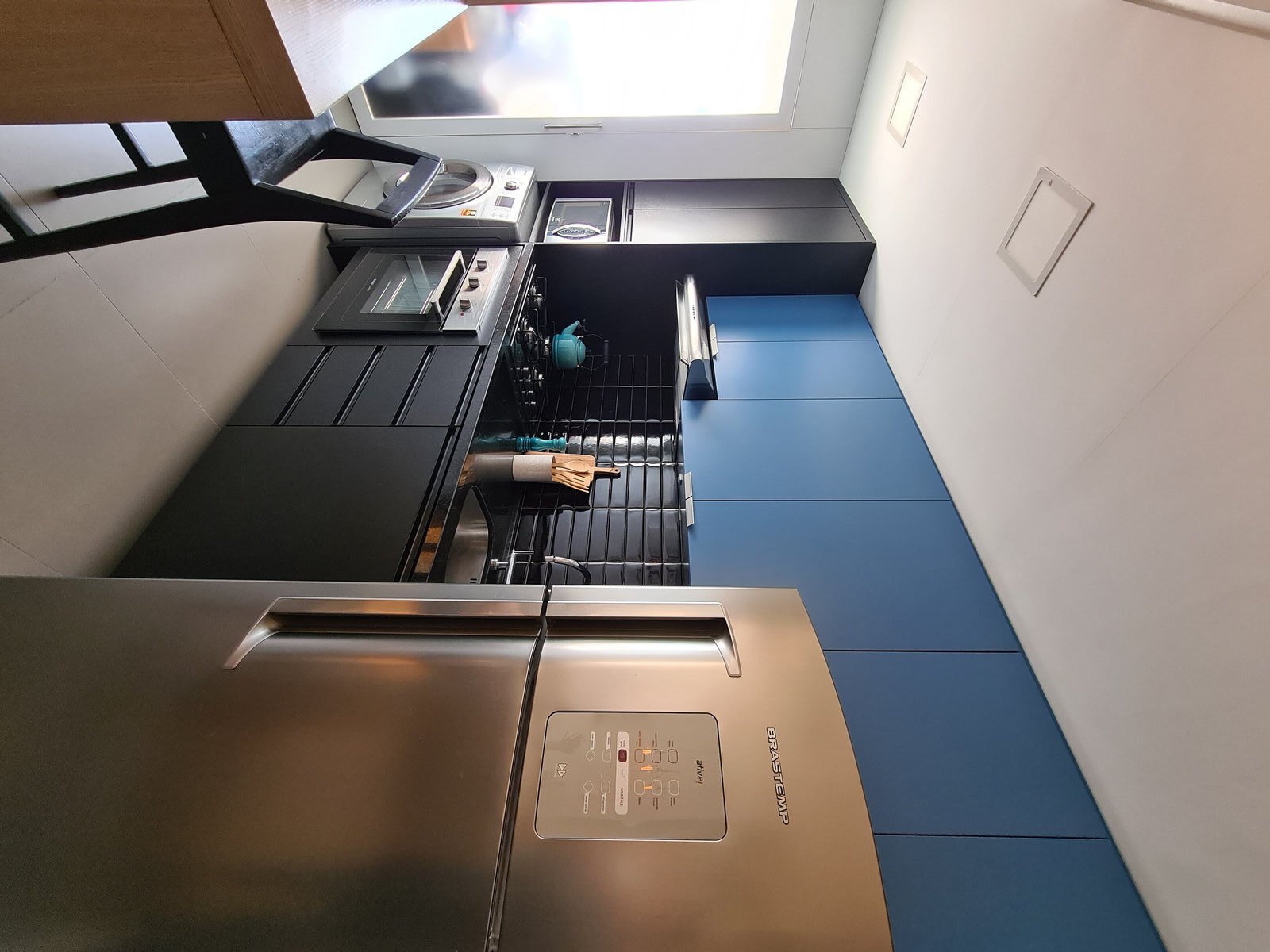 Além da parede que recebeu textura de cimento queimado, um rasgo no forro de gesso também foi revestido com a mesma textura, criando continuidade e profundidade ao ambiente. Com uma base neutra, as cores surgiram nos detalhes: o azul vibrante do armário aéreo da cozinha foi escolhido com cuidado para equilibrar com o tampo e o balcão pretos.