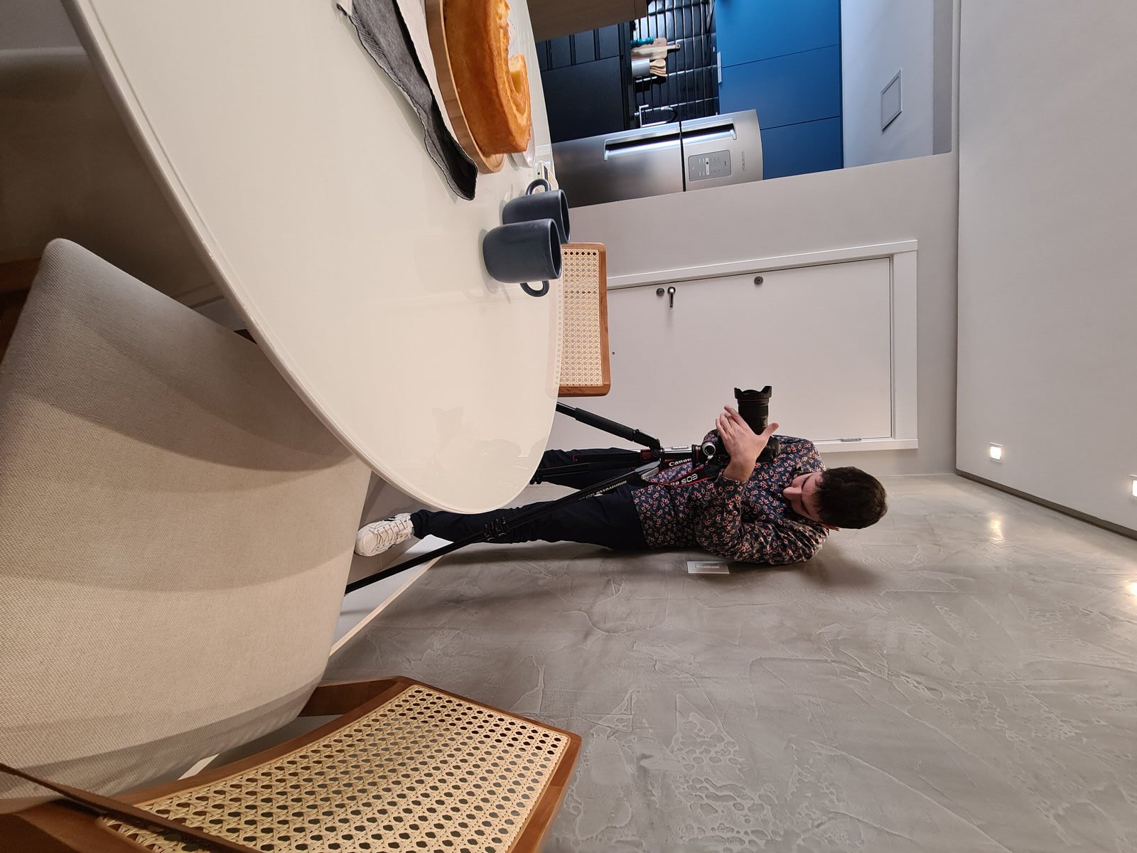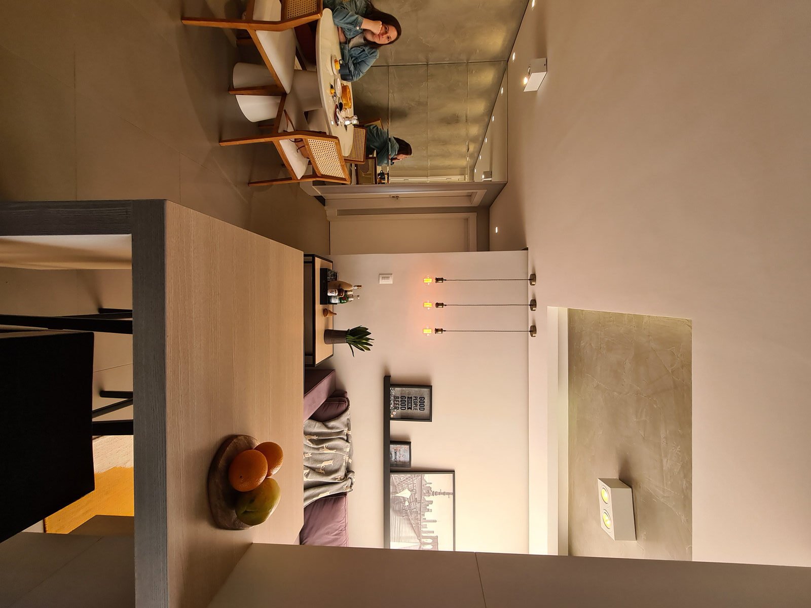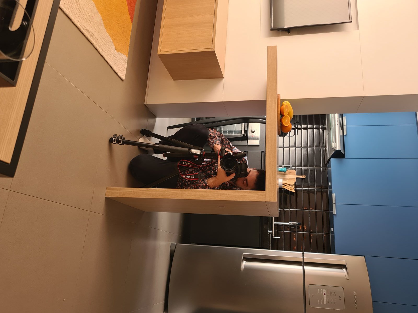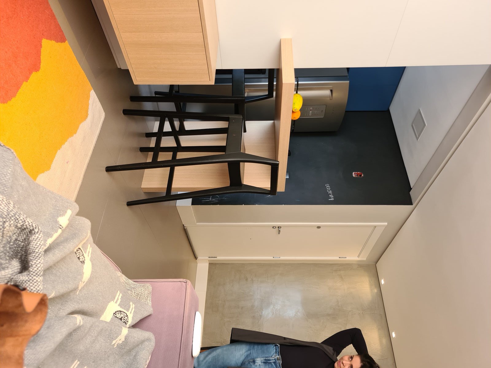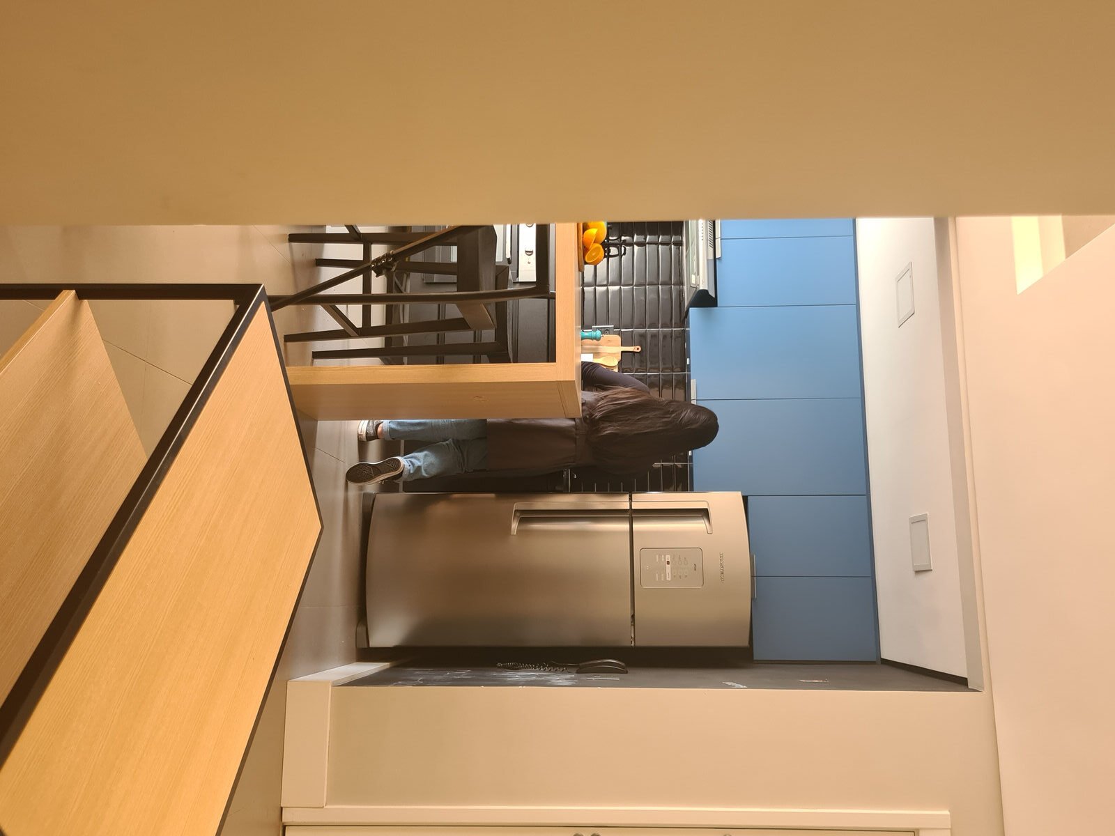 Além da parede que recebeu textura de cimento queimado, um rasgo no forro de gesso também foi revestido com a mesma textura, criando continuidade e profundidade ao ambiente. Com uma base neutra, as cores surgiram nos detalhes: o azul vibrante do armário aéreo da cozinha foi escolhido com cuidado para equilibrar com o tampo e o balcão pretos.