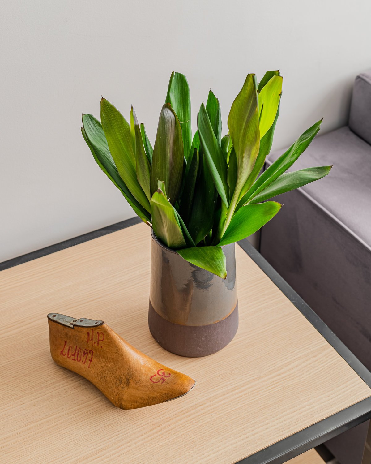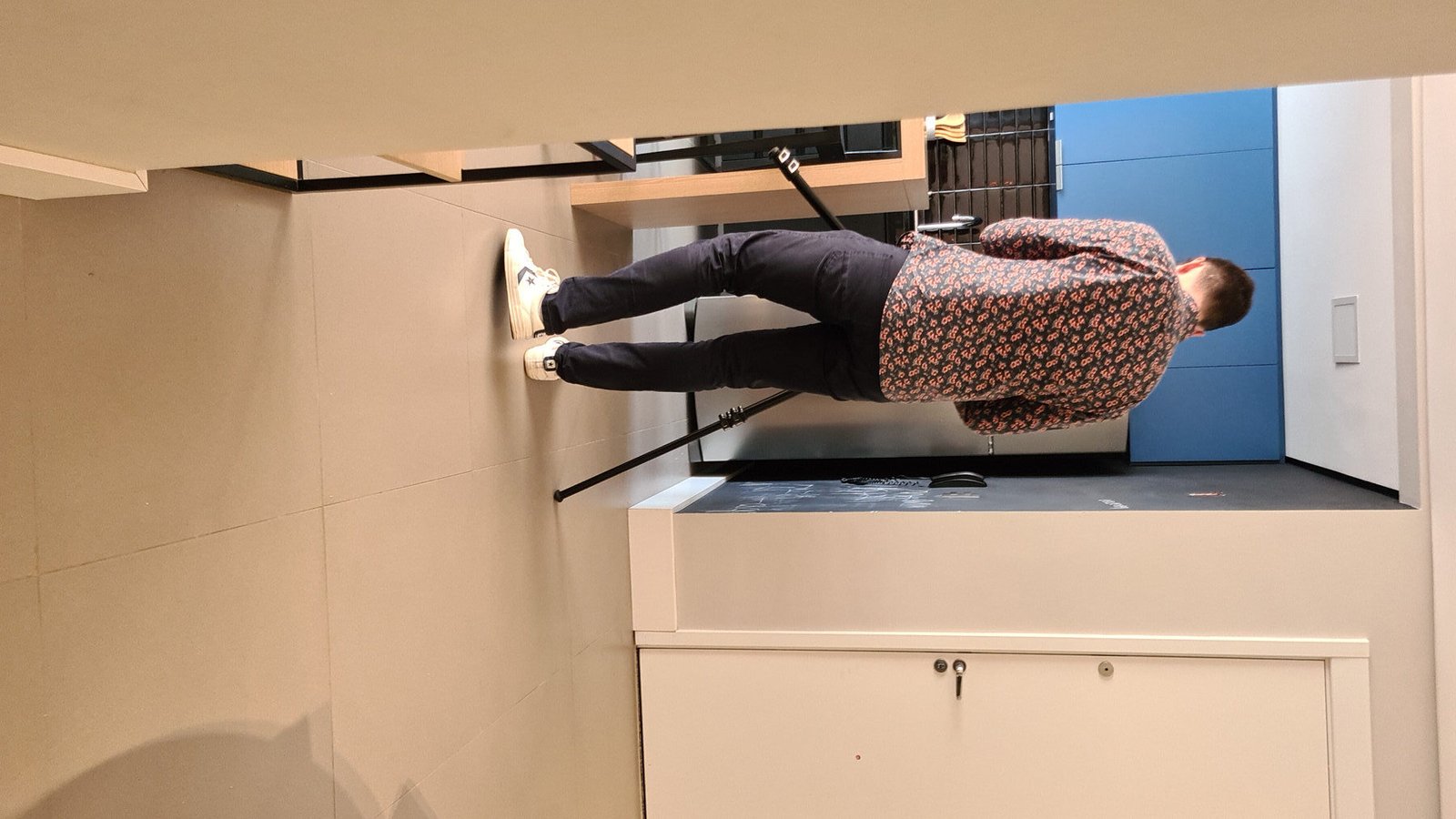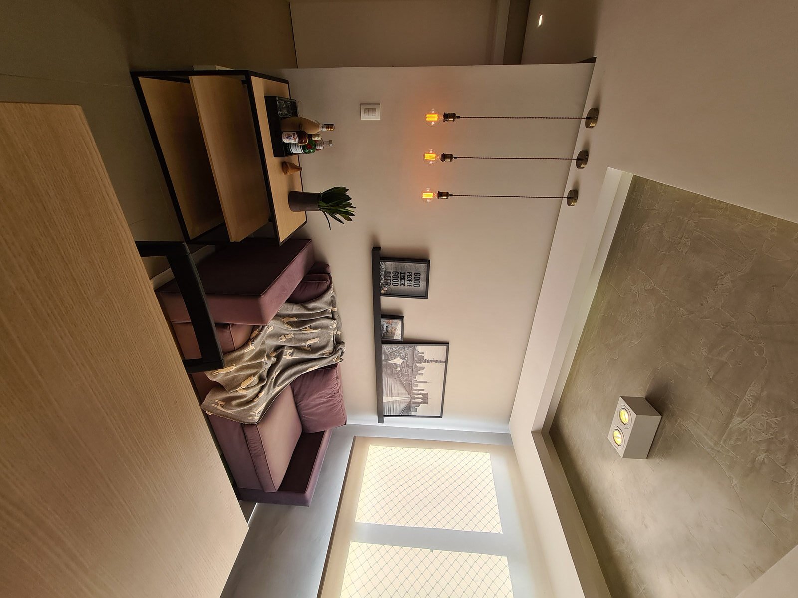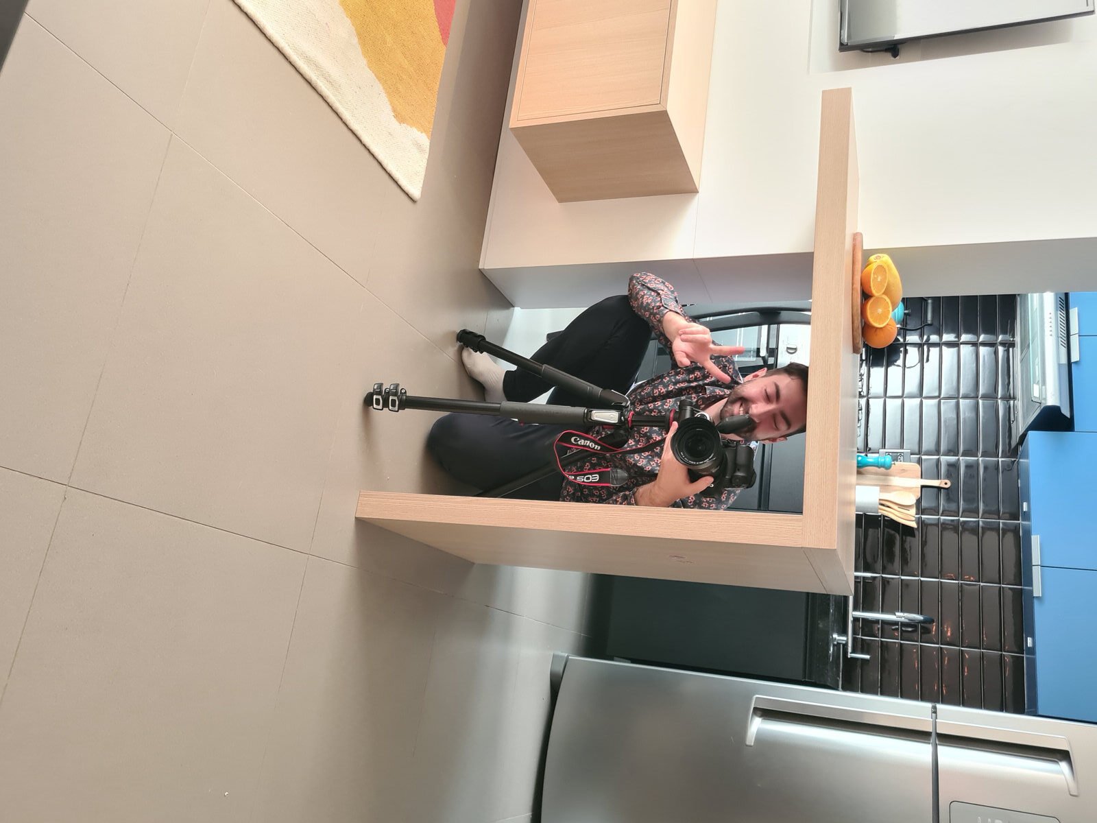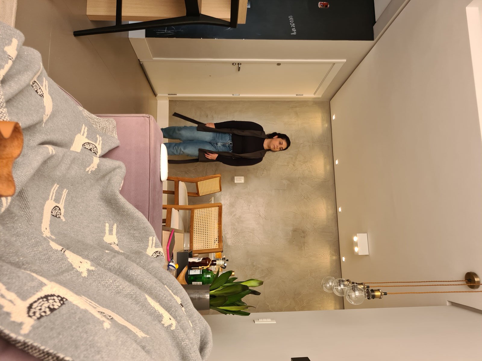Além da parede que recebeu textura de cimento queimado, um rasgo no forro de gesso também foi revestido com a mesma textura, criando continuidade e profundidade ao ambiente. Com uma base neutra, as cores surgiram nos detalhes: o azul vibrante do armário aéreo da cozinha foi escolhido com cuidado para equilibrar com o tampo e o balcão pretos.