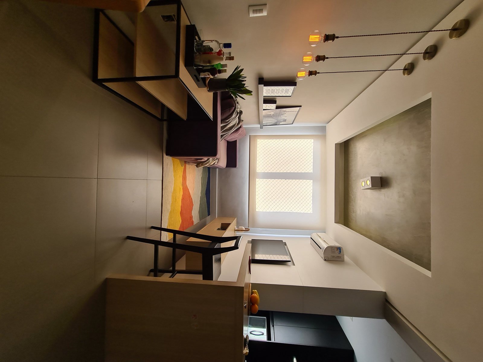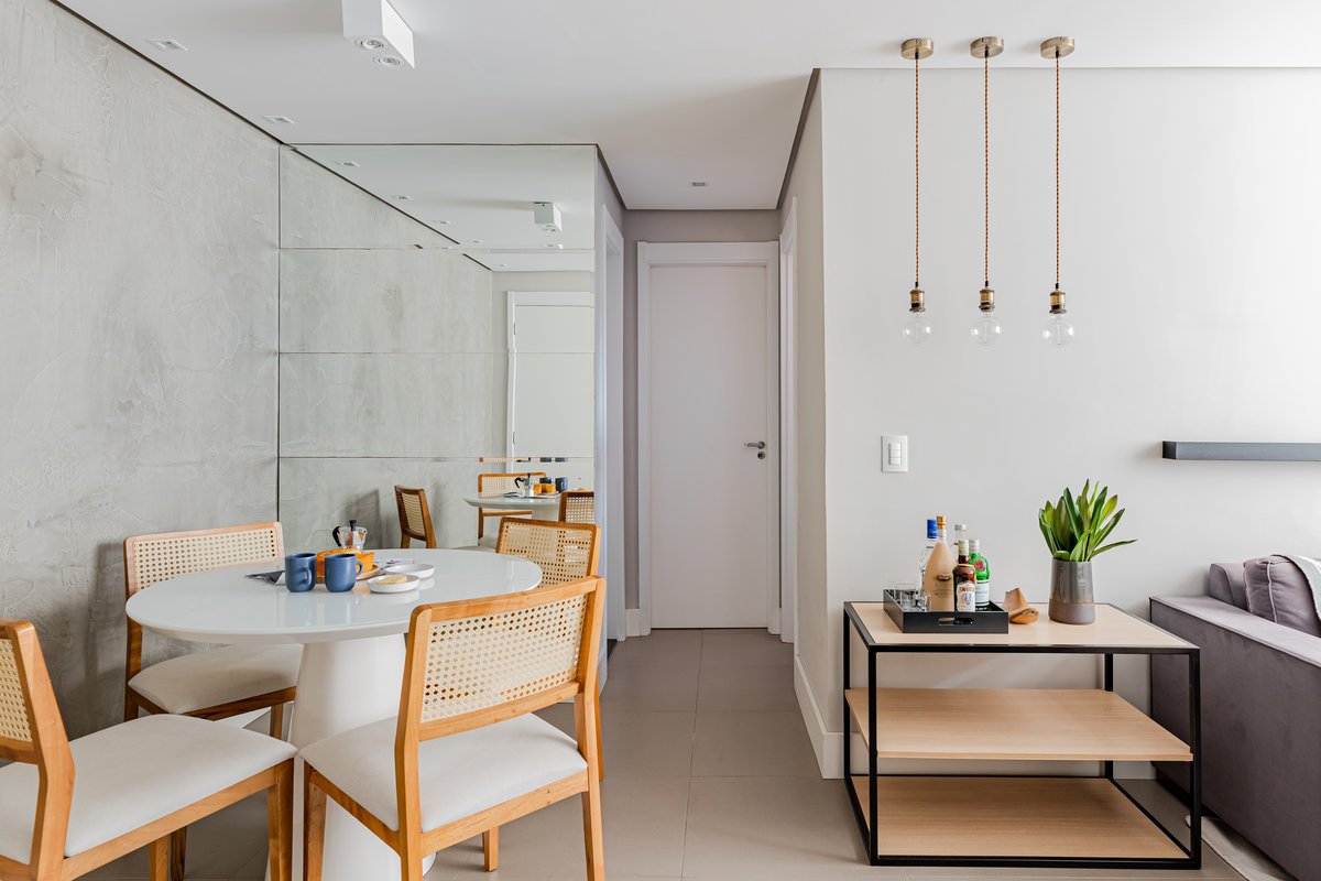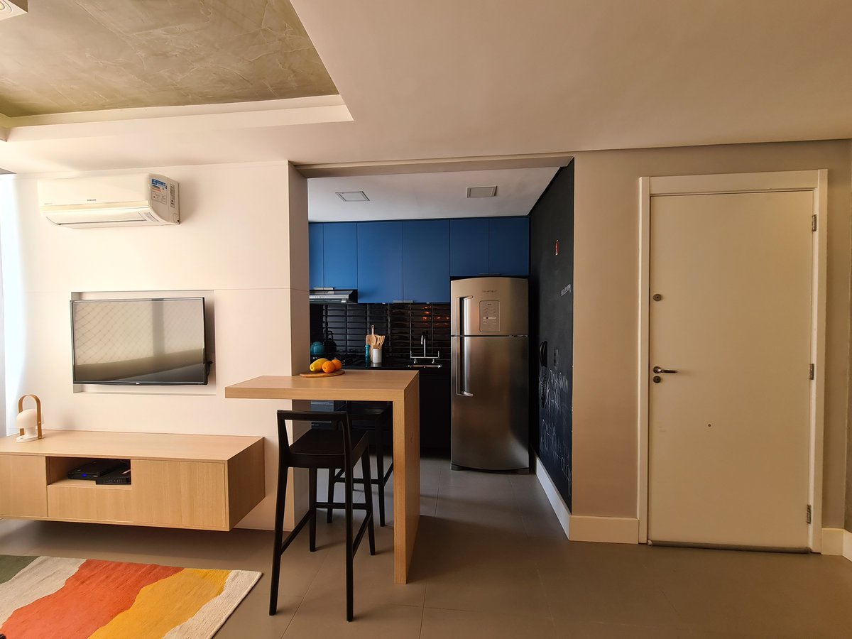 Um apartamento de planta padrão, com aproximadamente 50 m², ganhou cores nada convencionais. Sendo o primeiro apartamento do morador, o pedido era que o espaço tivesse personalidade, mas que não ficasse datado com o tempo.