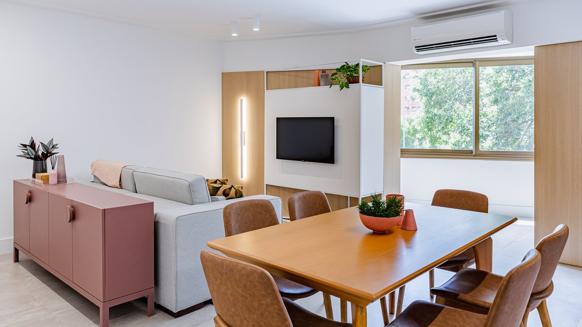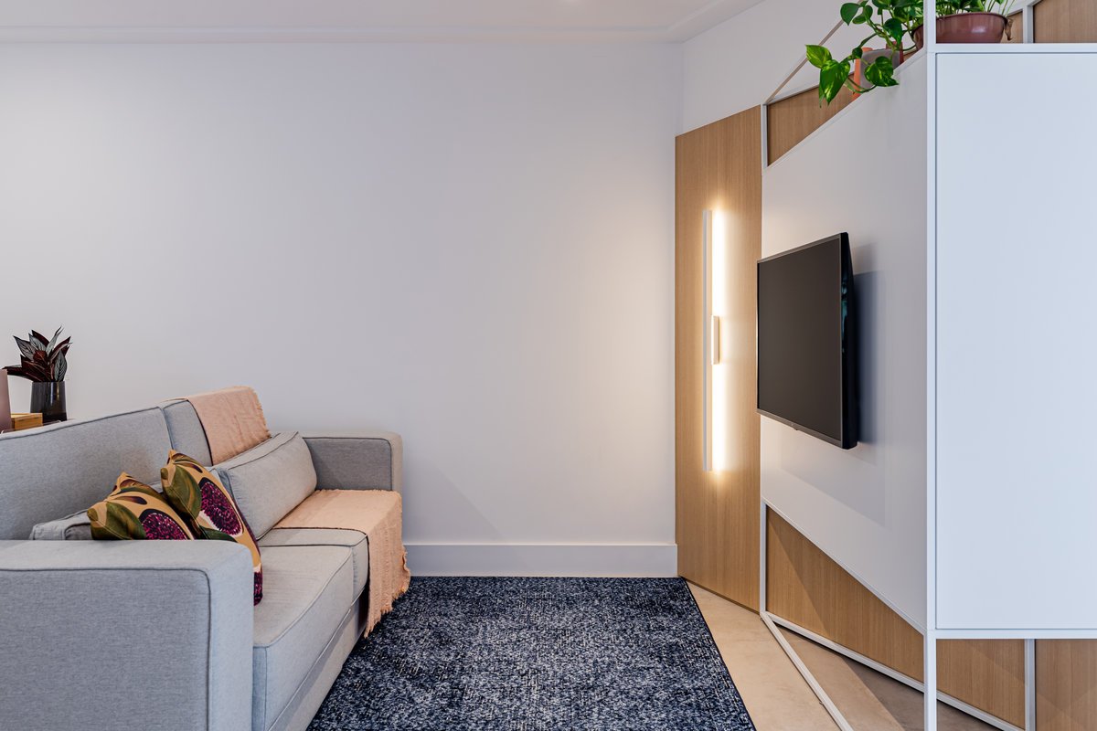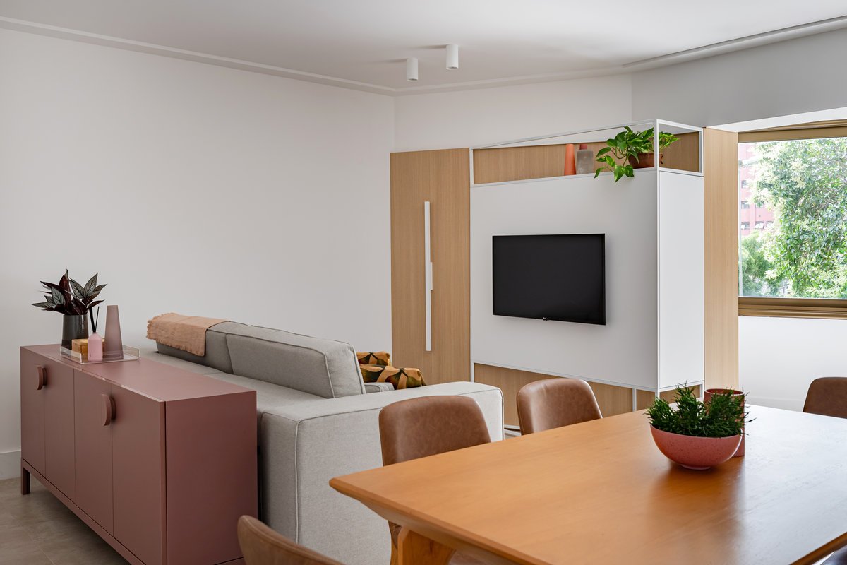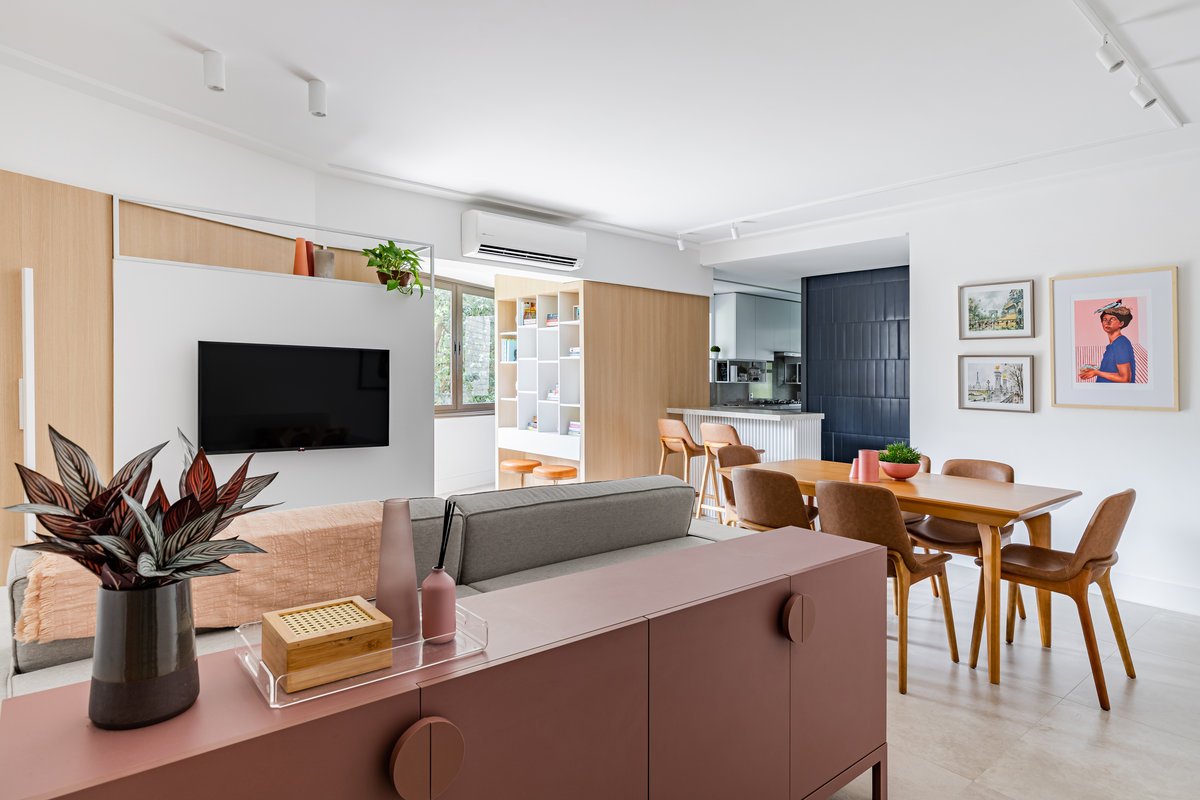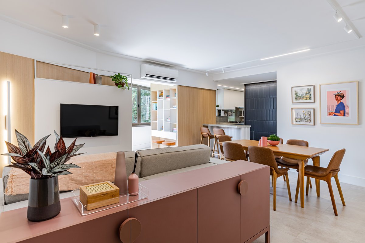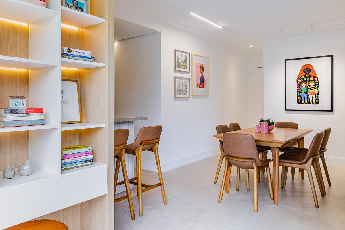 A cozinha foi integrada à sala, numa intervenção que exigiu reforço estrutural, mas que trouxe uma enorme diferença para a funcionalidade e fluidez do espaço no dia a dia. O layout representou um pequeno desafio devido às paredes em ângulo, mas, após estudos cuidadosos para a disposição do mobiliário e com o uso de marcenaria feita por medida, a solução foi encontrada com elegância.