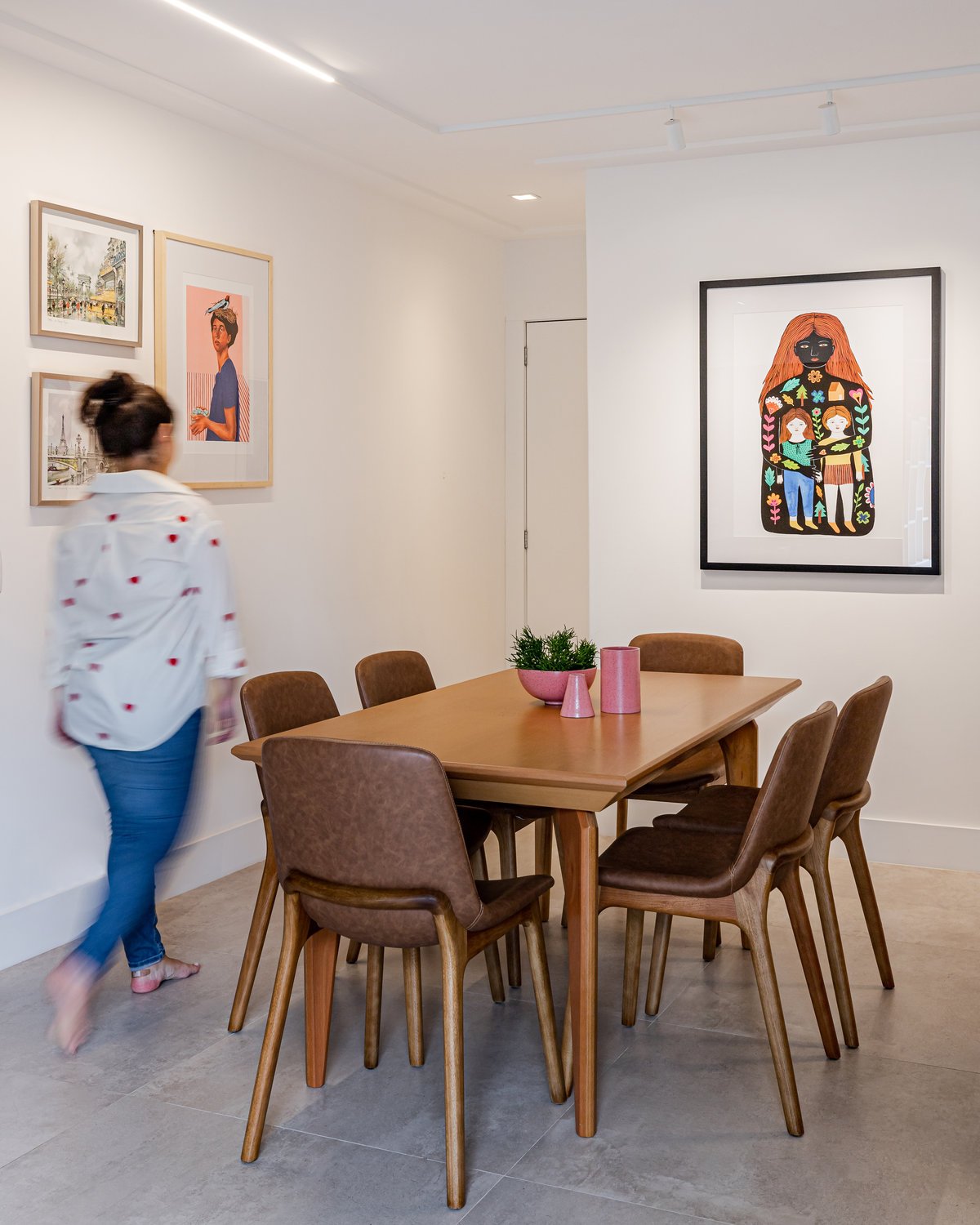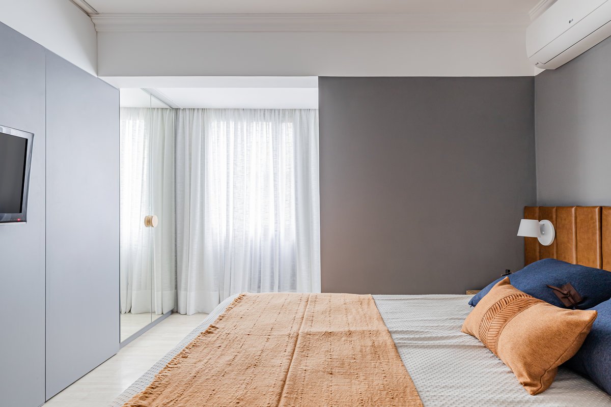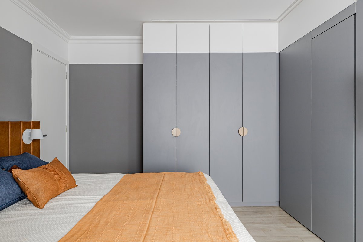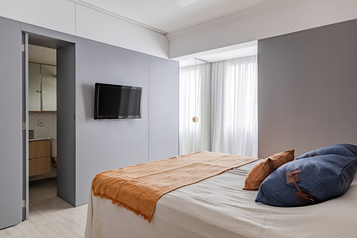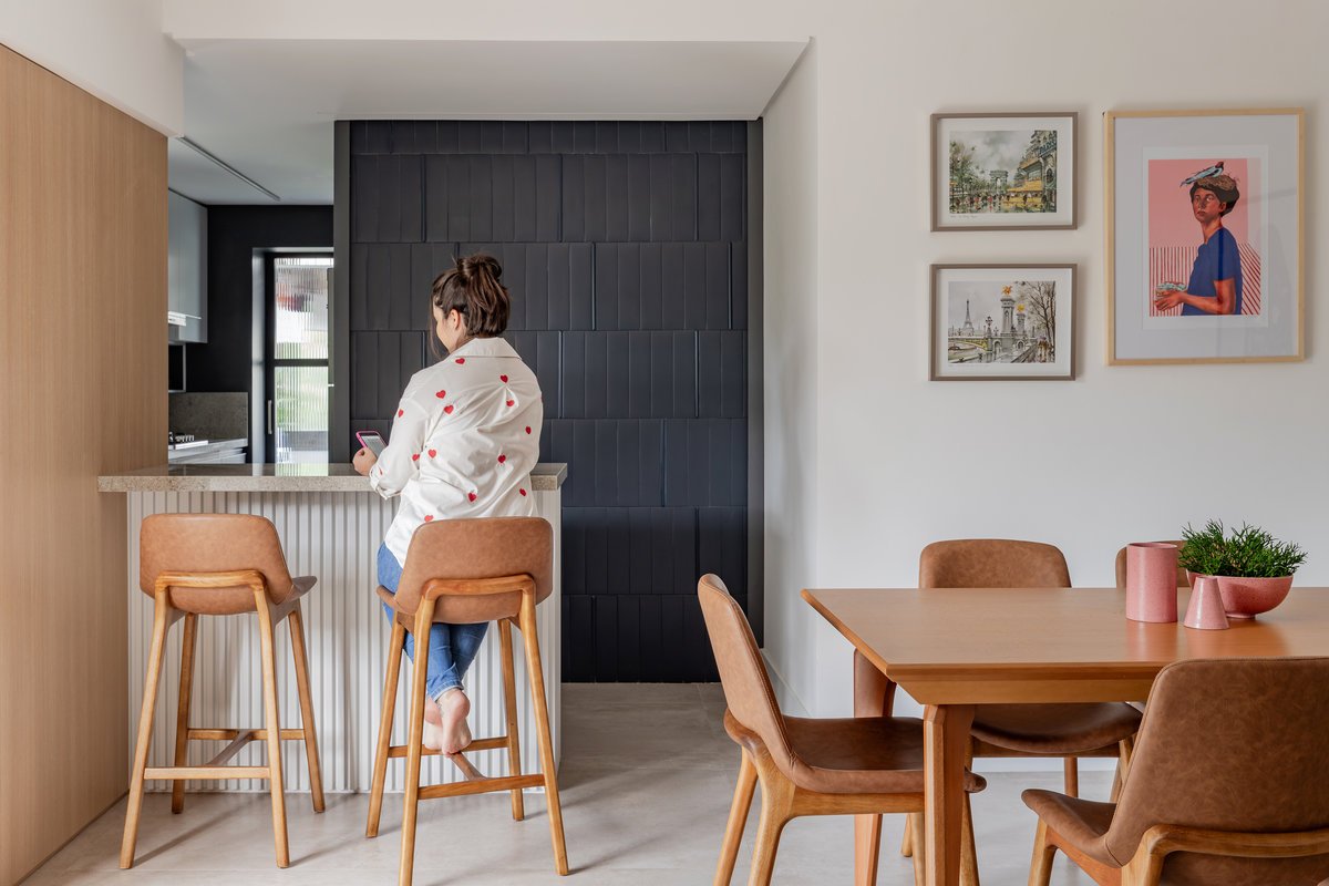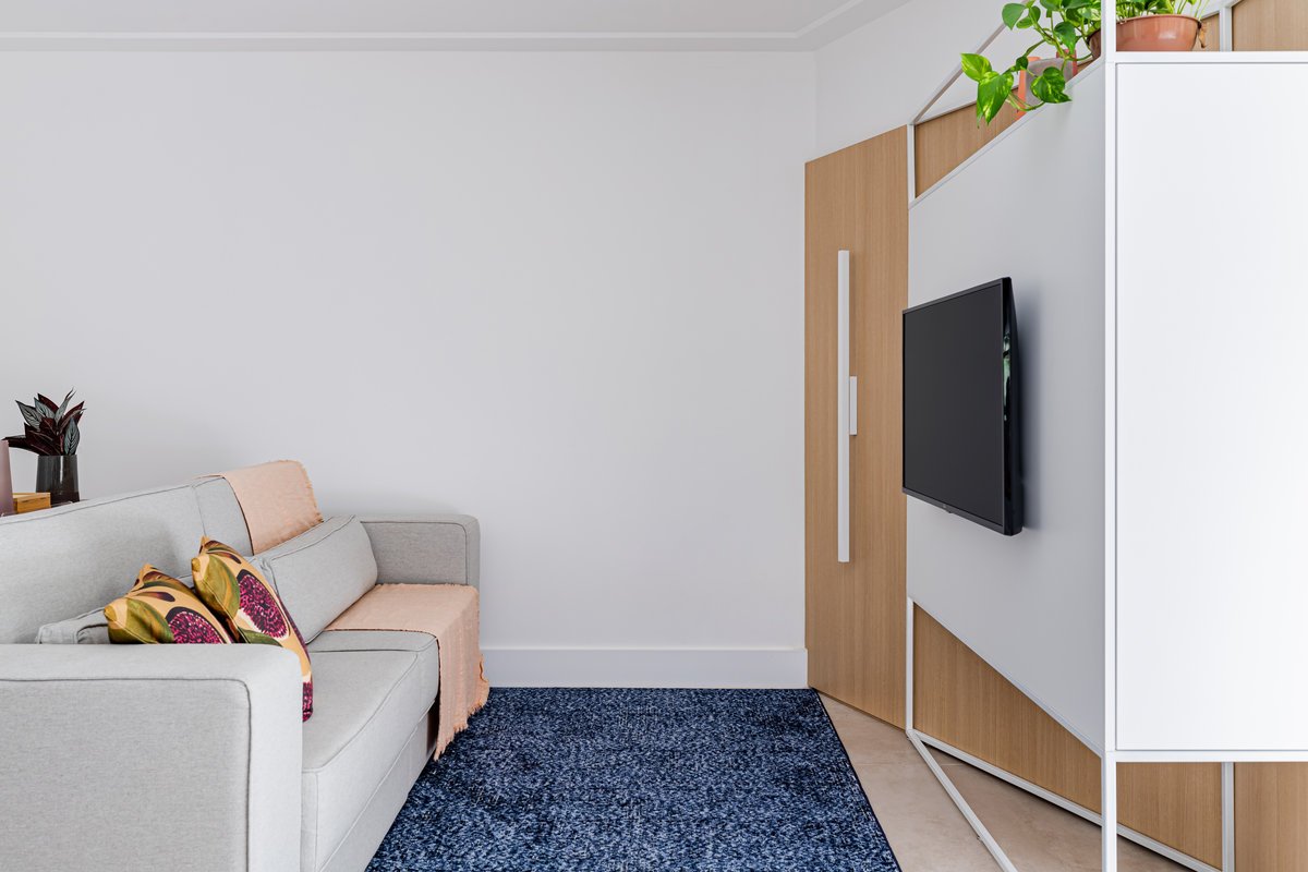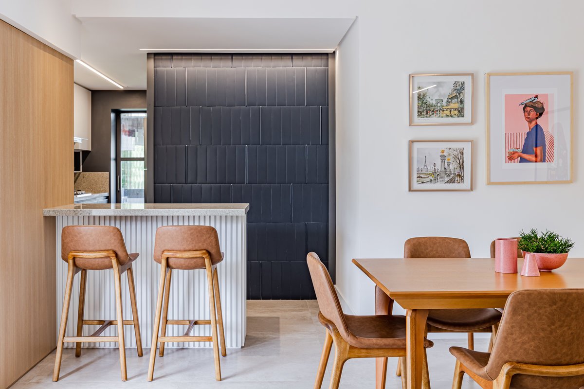 A cozinha foi integrada à sala, numa intervenção que exigiu reforço estrutural, mas que trouxe uma enorme diferença para a funcionalidade e fluidez do espaço no dia a dia. O layout representou um pequeno desafio devido às paredes em ângulo, mas, após estudos cuidadosos para a disposição do mobiliário e com o uso de marcenaria feita por medida, a solução foi encontrada com elegância.