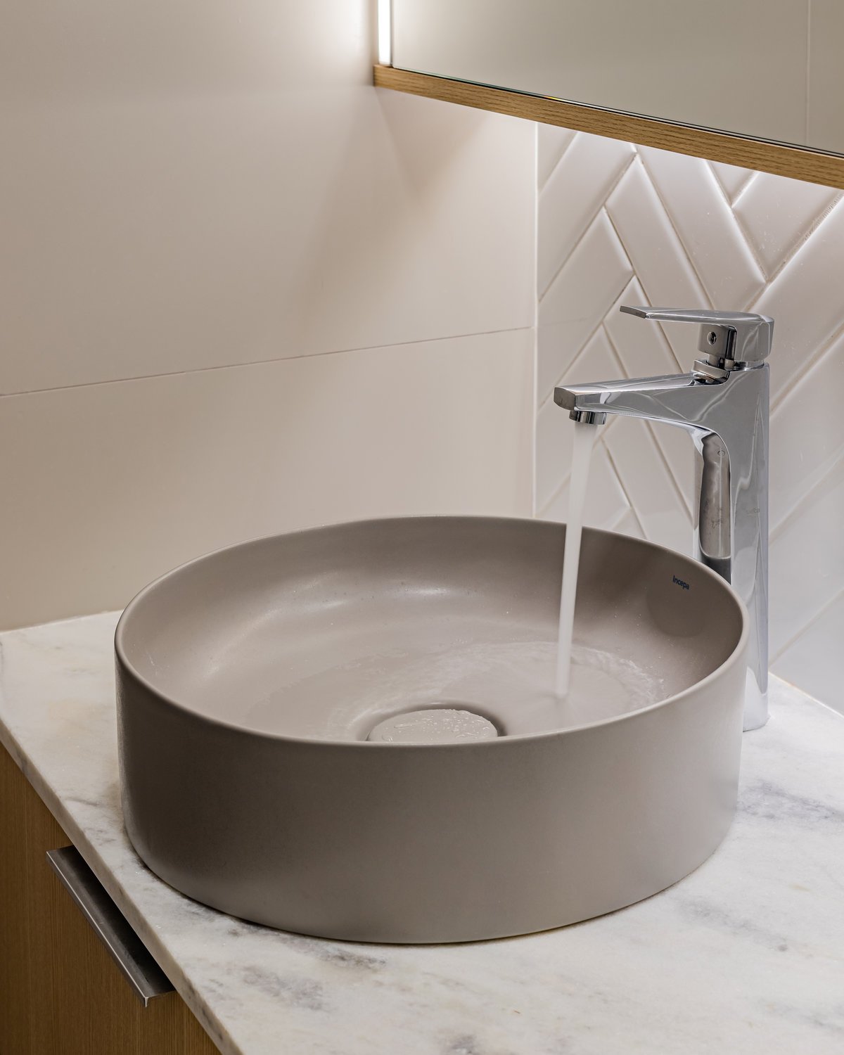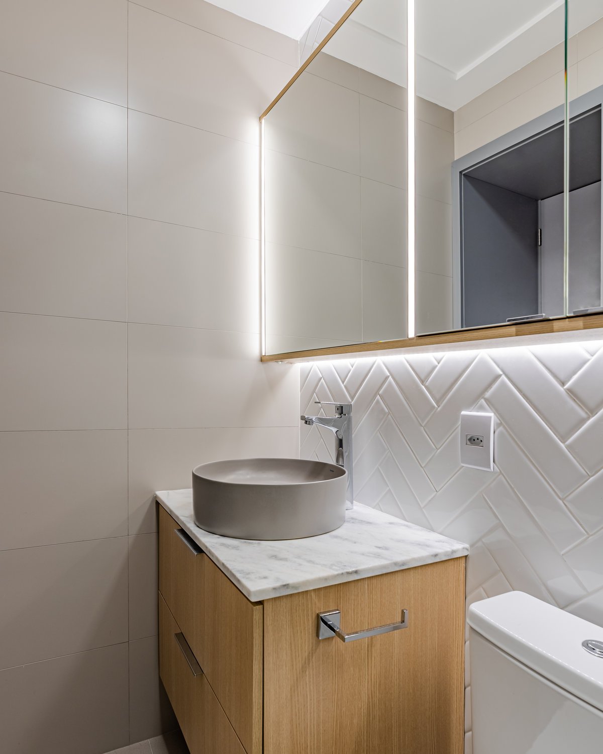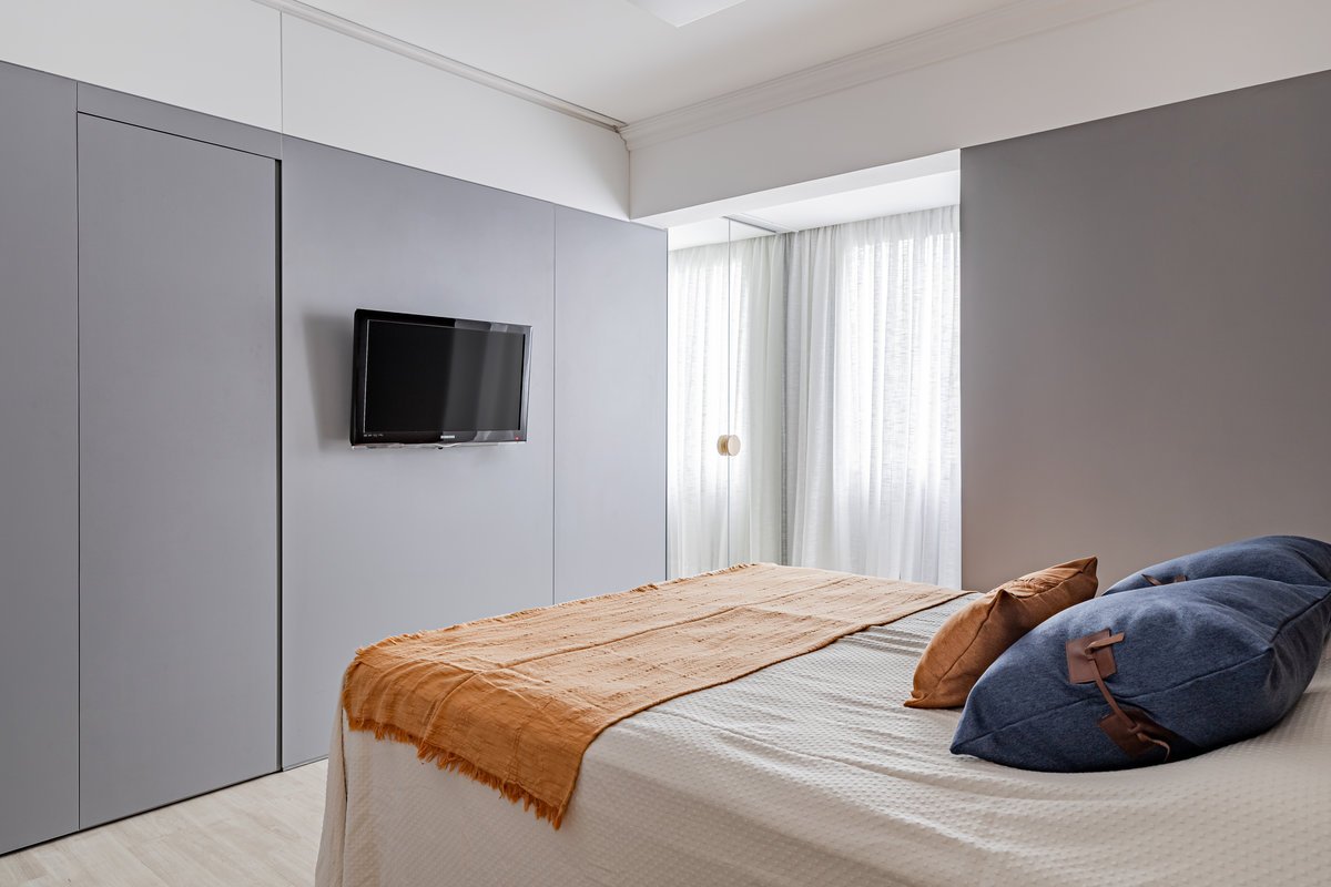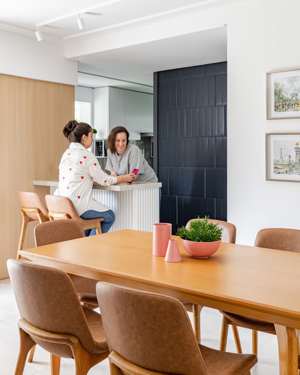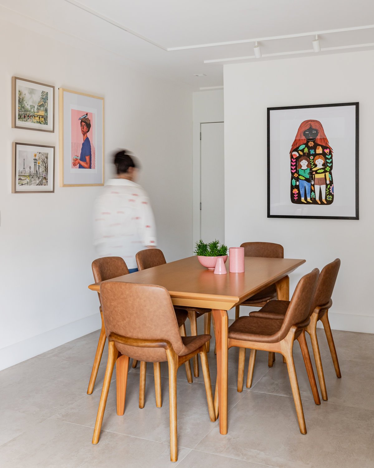 A cozinha foi integrada à sala, numa intervenção que exigiu reforço estrutural, mas que trouxe uma enorme diferença para a funcionalidade e fluidez do espaço no dia a dia. O layout representou um pequeno desafio devido às paredes em ângulo, mas, após estudos cuidadosos para a disposição do mobiliário e com o uso de marcenaria feita por medida, a solução foi encontrada com elegância.