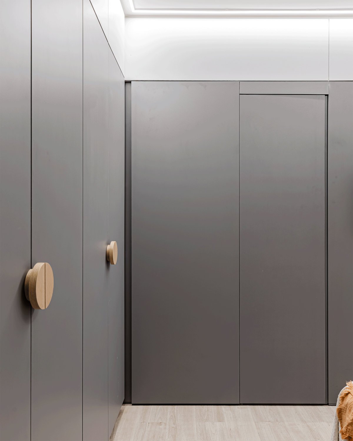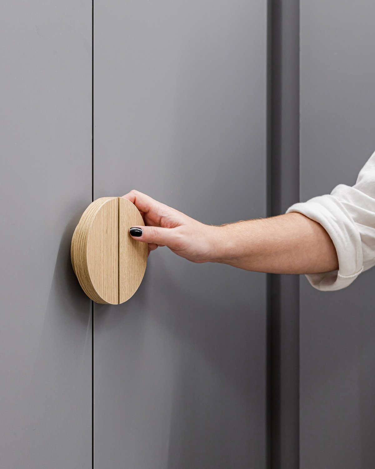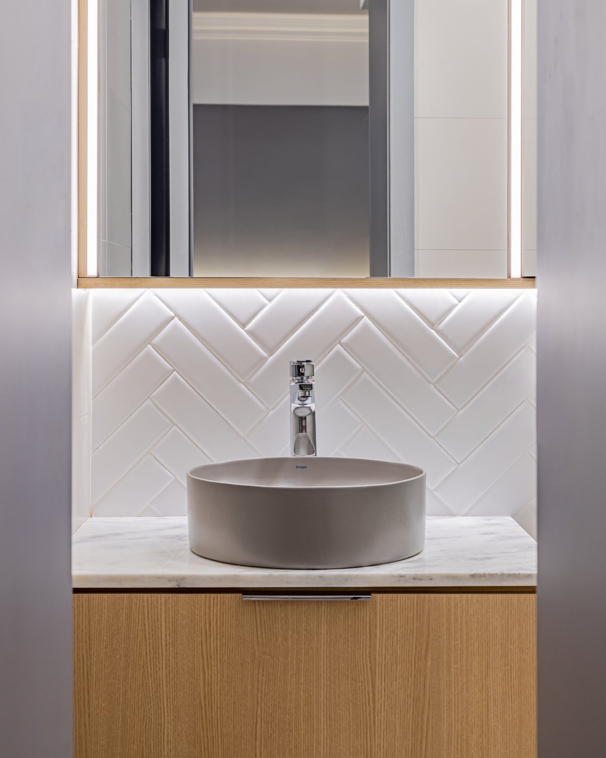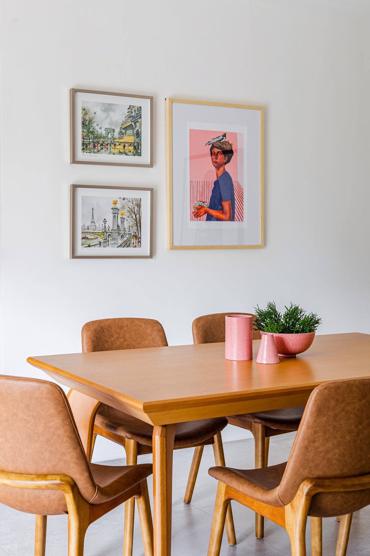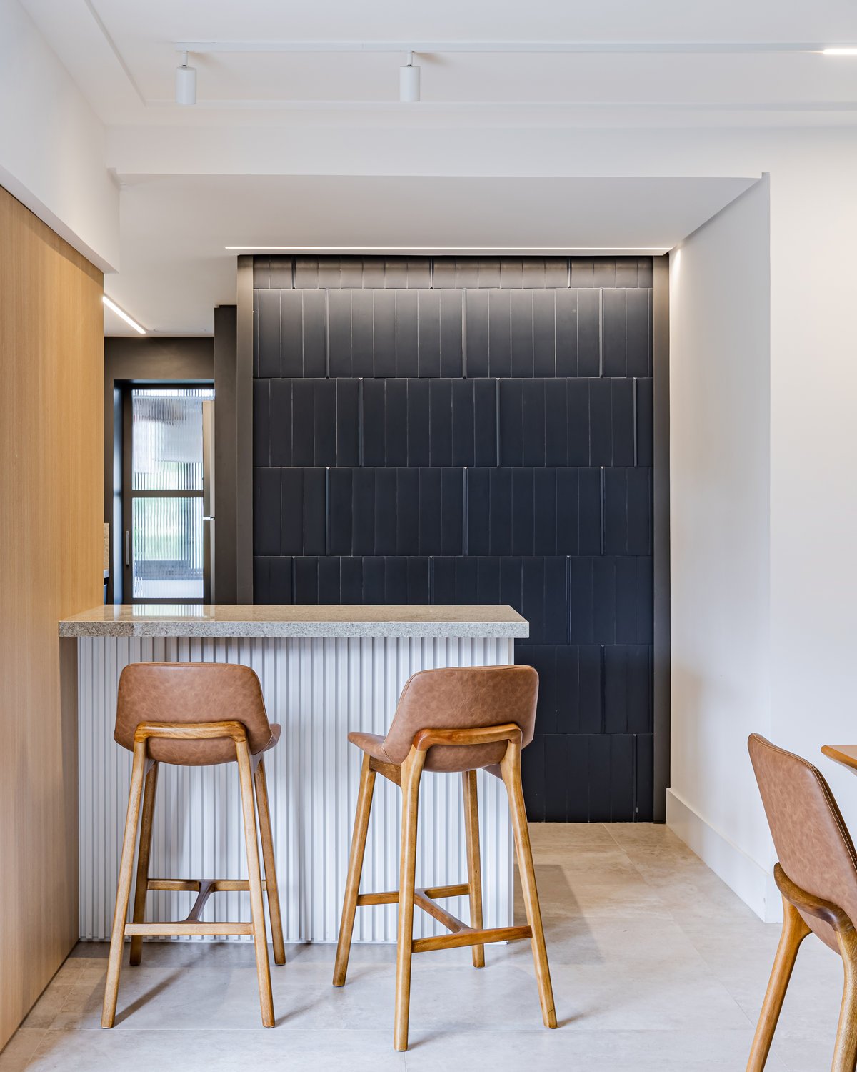 A cozinha foi integrada à sala, numa intervenção que exigiu reforço estrutural, mas que trouxe uma enorme diferença para a funcionalidade e fluidez do espaço no dia a dia. O layout representou um pequeno desafio devido às paredes em ângulo, mas, após estudos cuidadosos para a disposição do mobiliário e com o uso de marcenaria feita por medida, a solução foi encontrada com elegância.