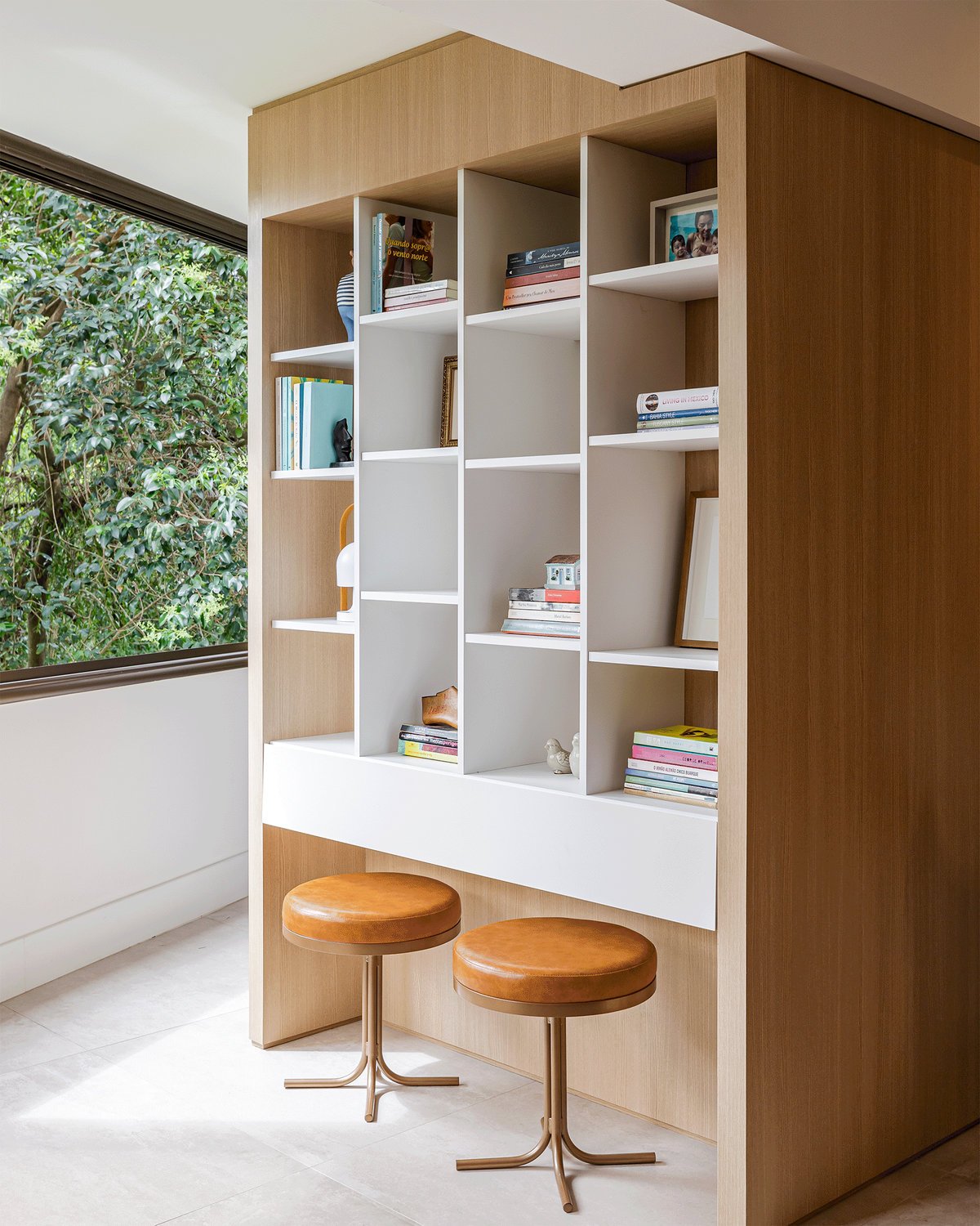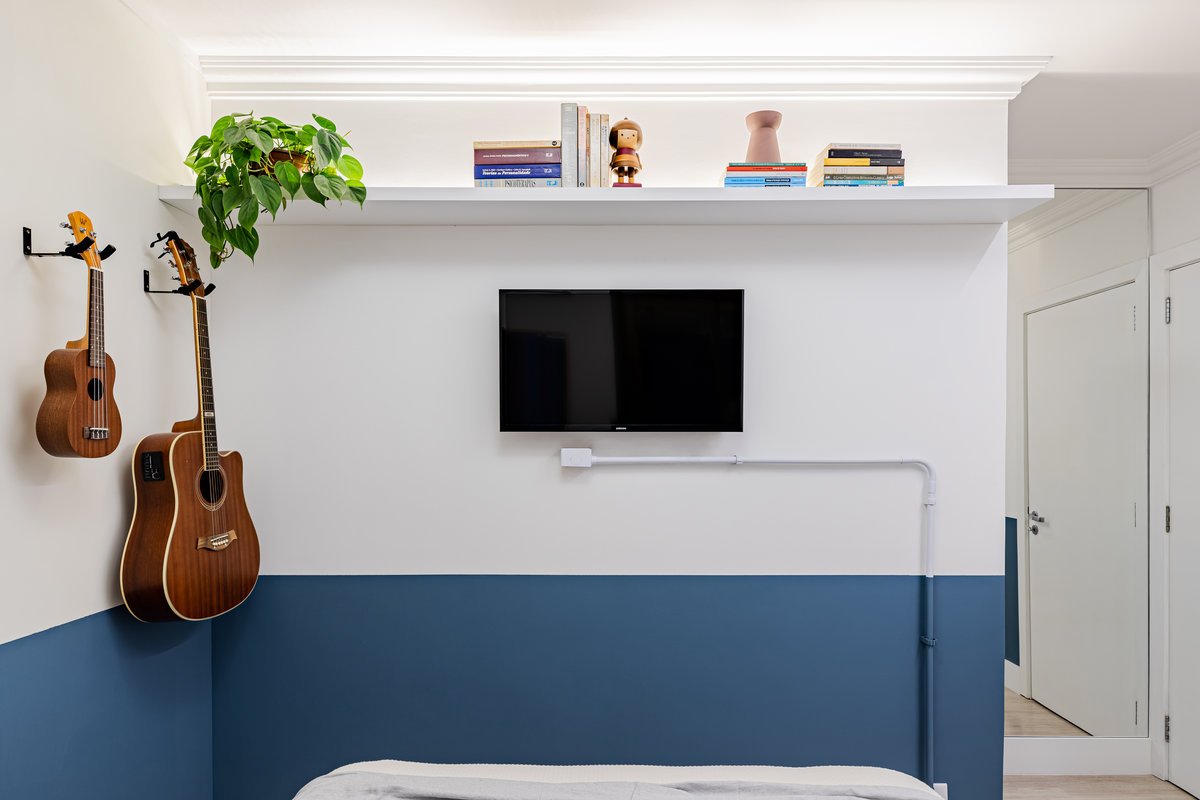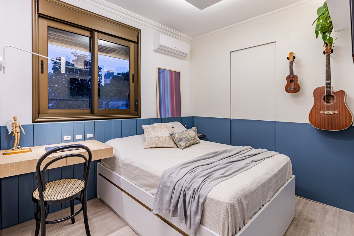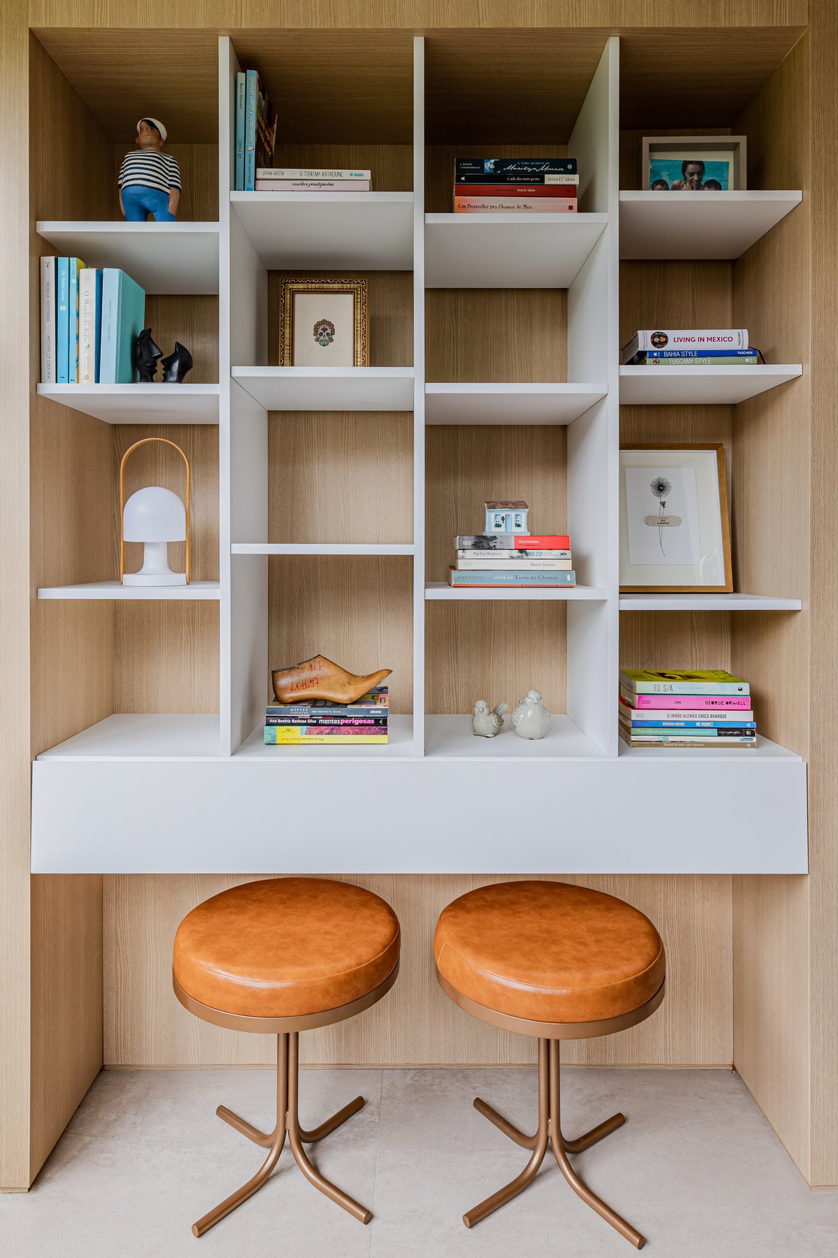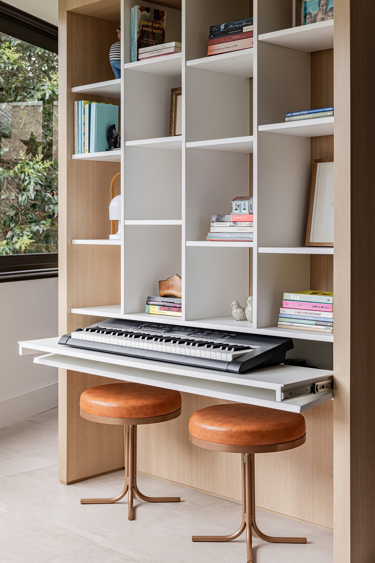 Destaque para a estante multiusos: nela, livros e recordações de viagem partilham espaço com um teclado retrátil, pronto para os momentos dedicados à música.