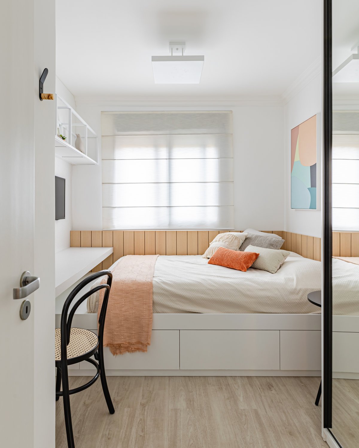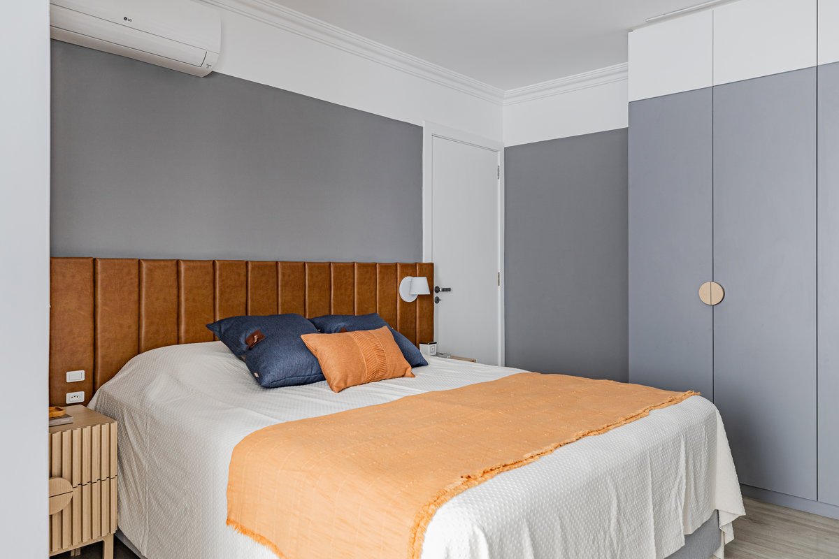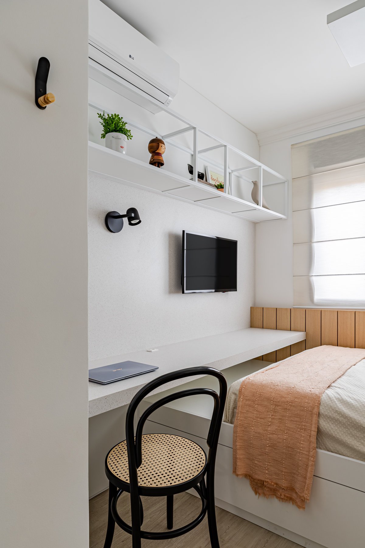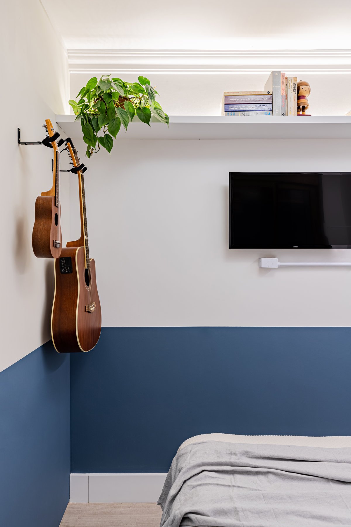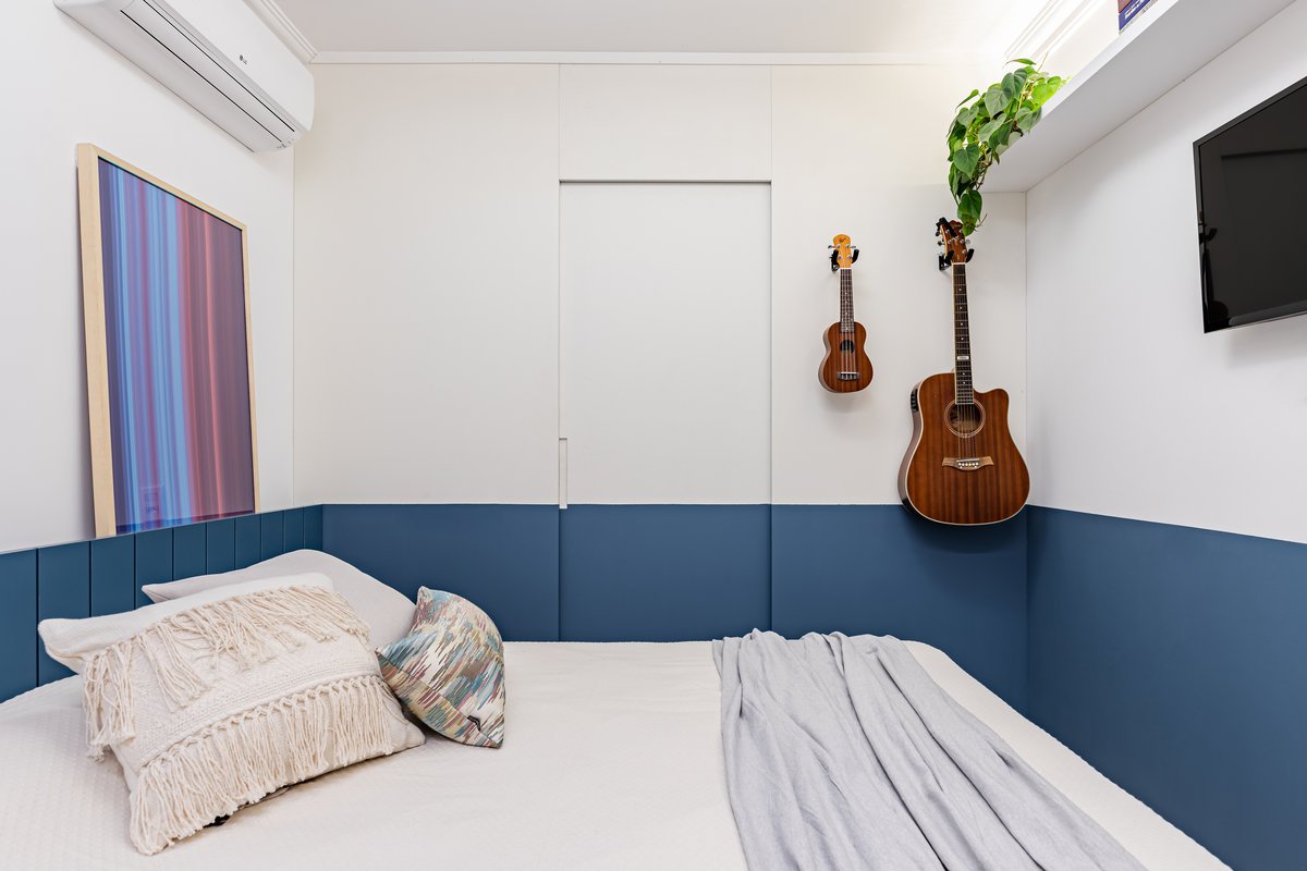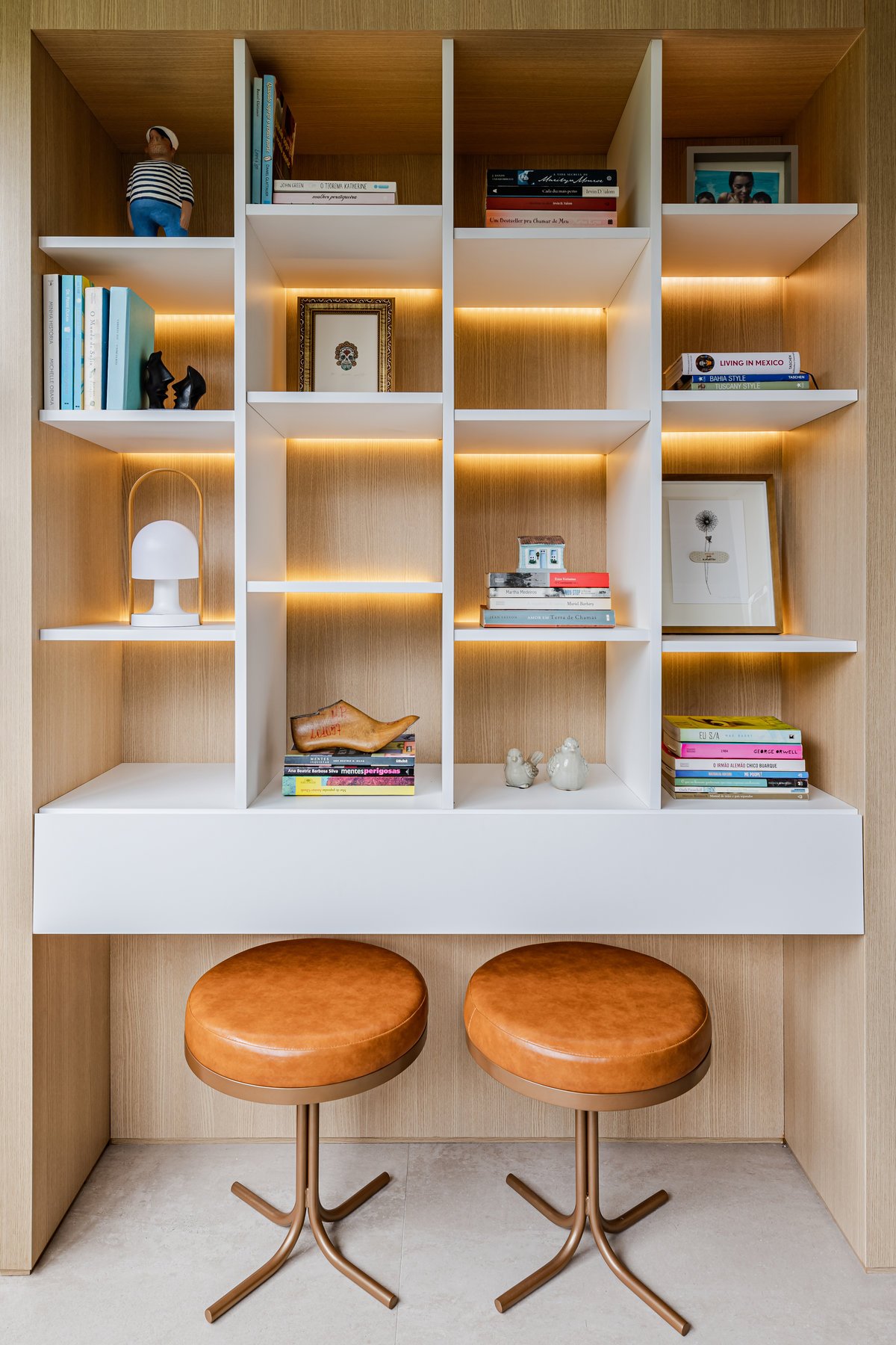 Destaque para a estante multiusos: nela, livros e recordações de viagem partilham espaço com um teclado retrátil, pronto para os momentos dedicados à música.