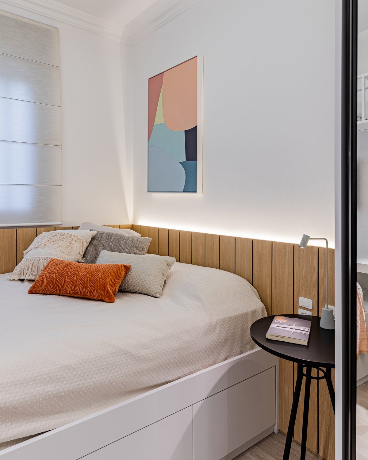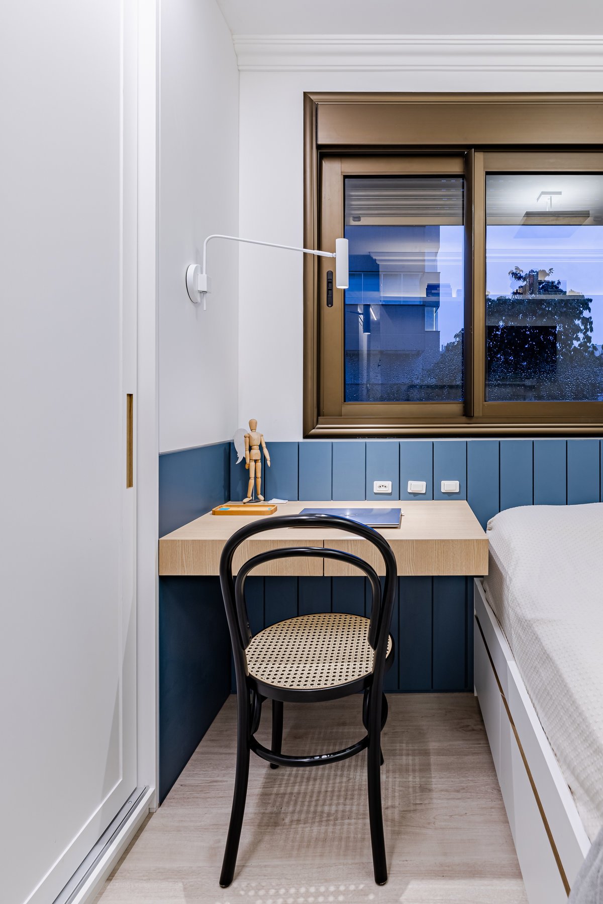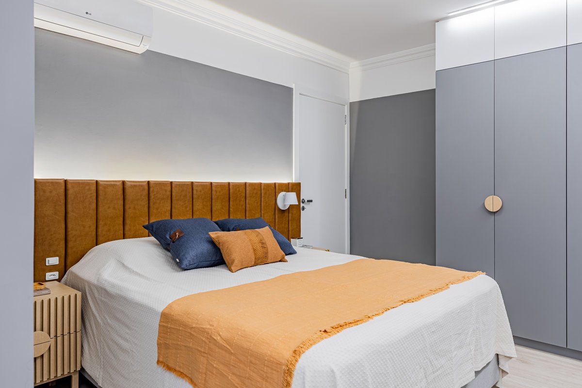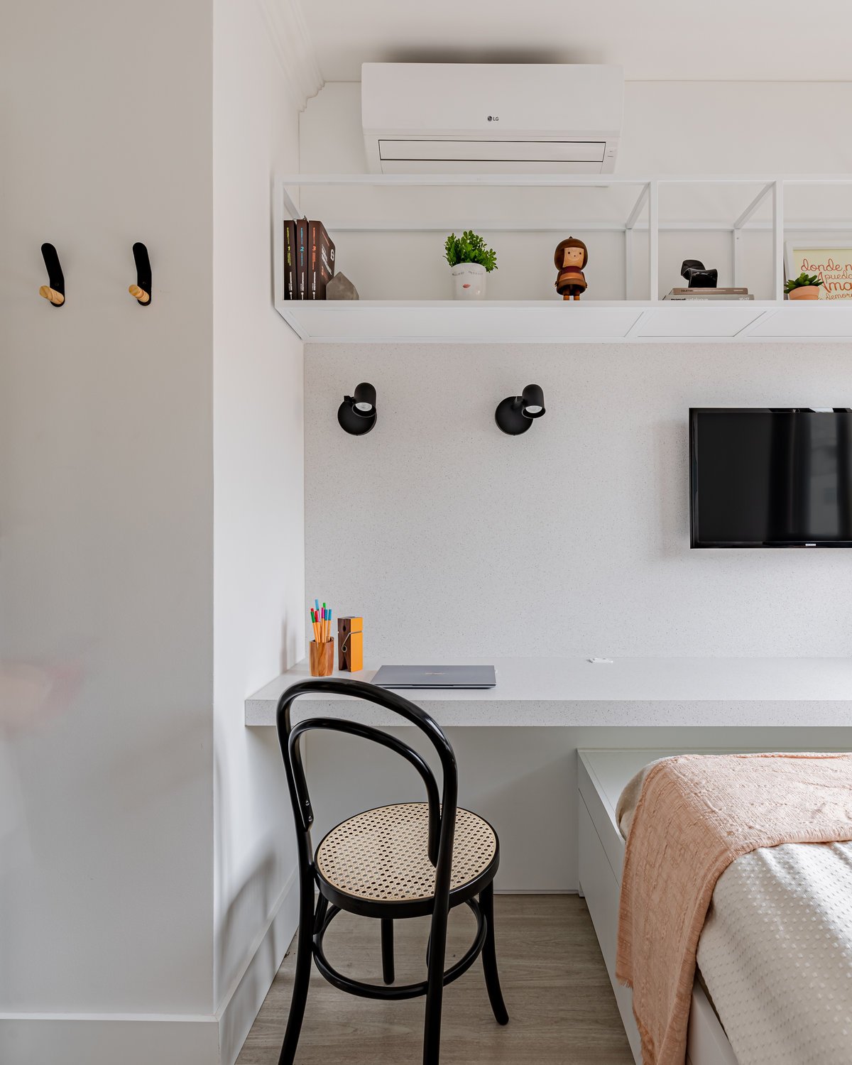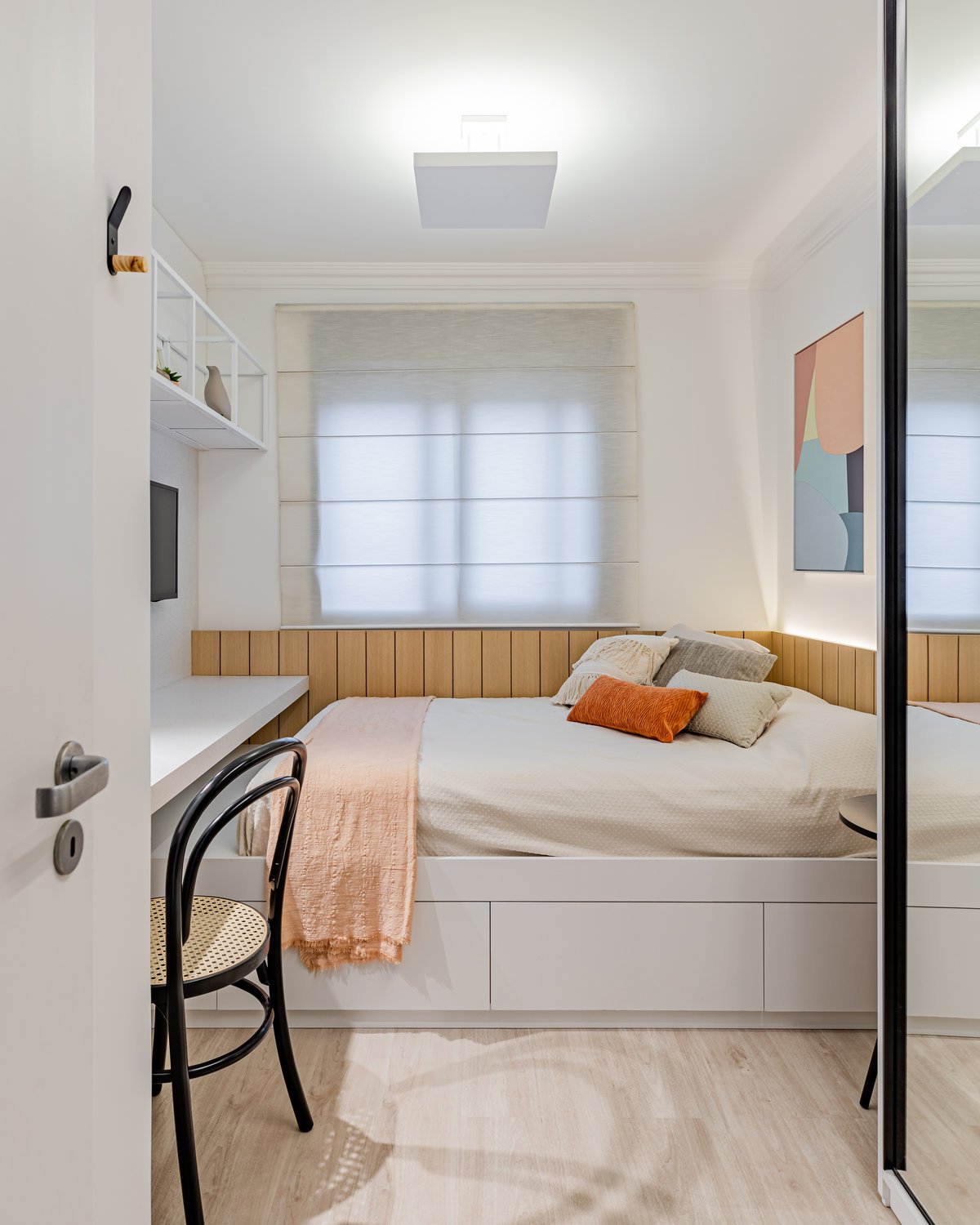 Destaque para a estante multiusos: nela, livros e recordações de viagem partilham espaço com um teclado retrátil, pronto para os momentos dedicados à música.