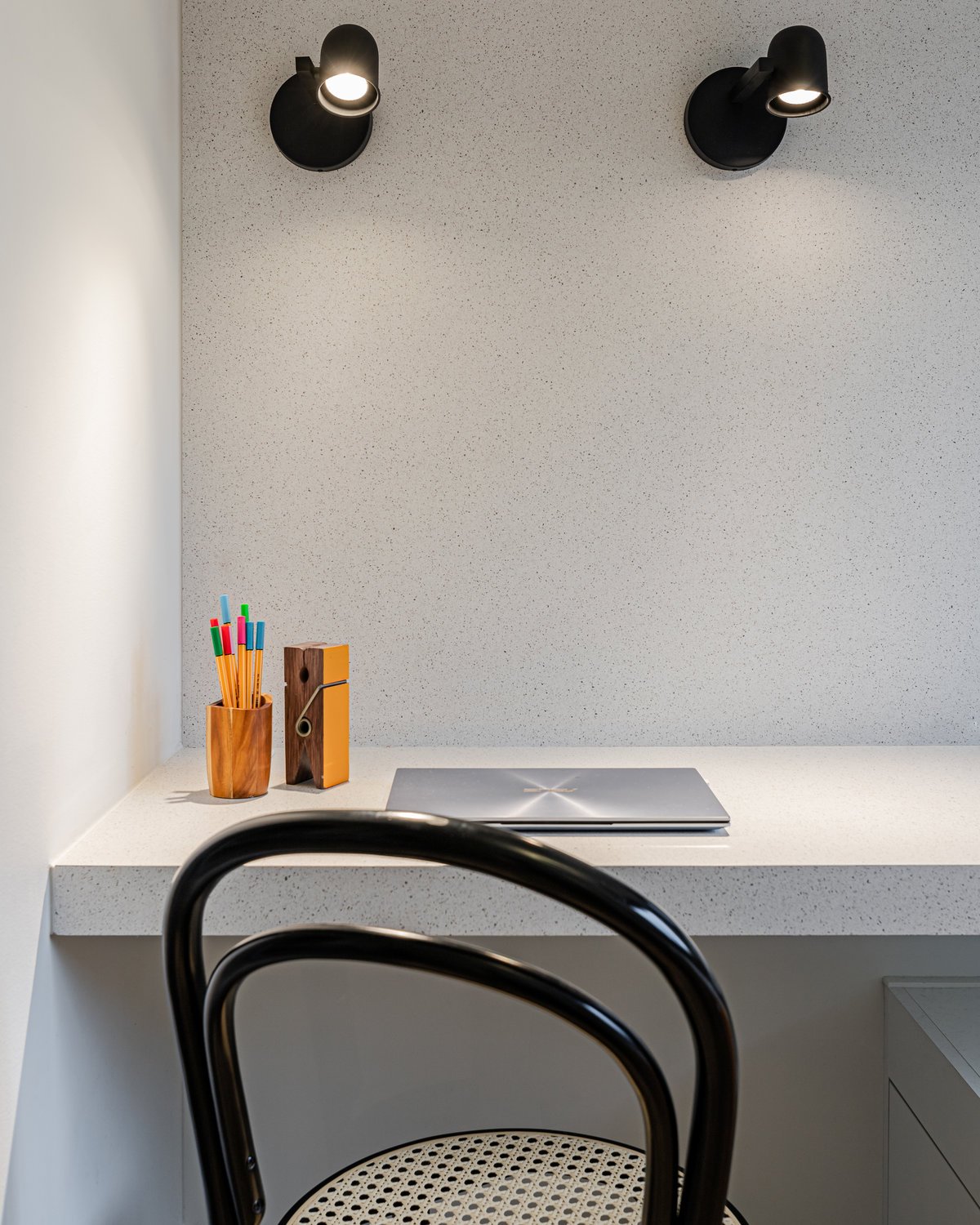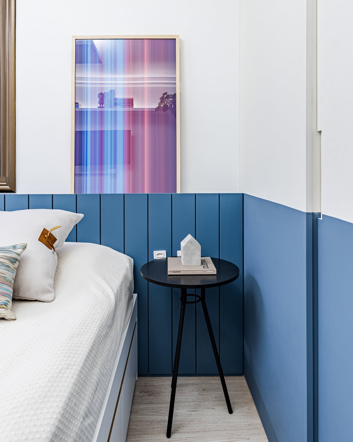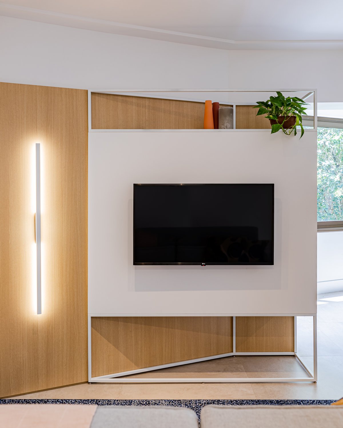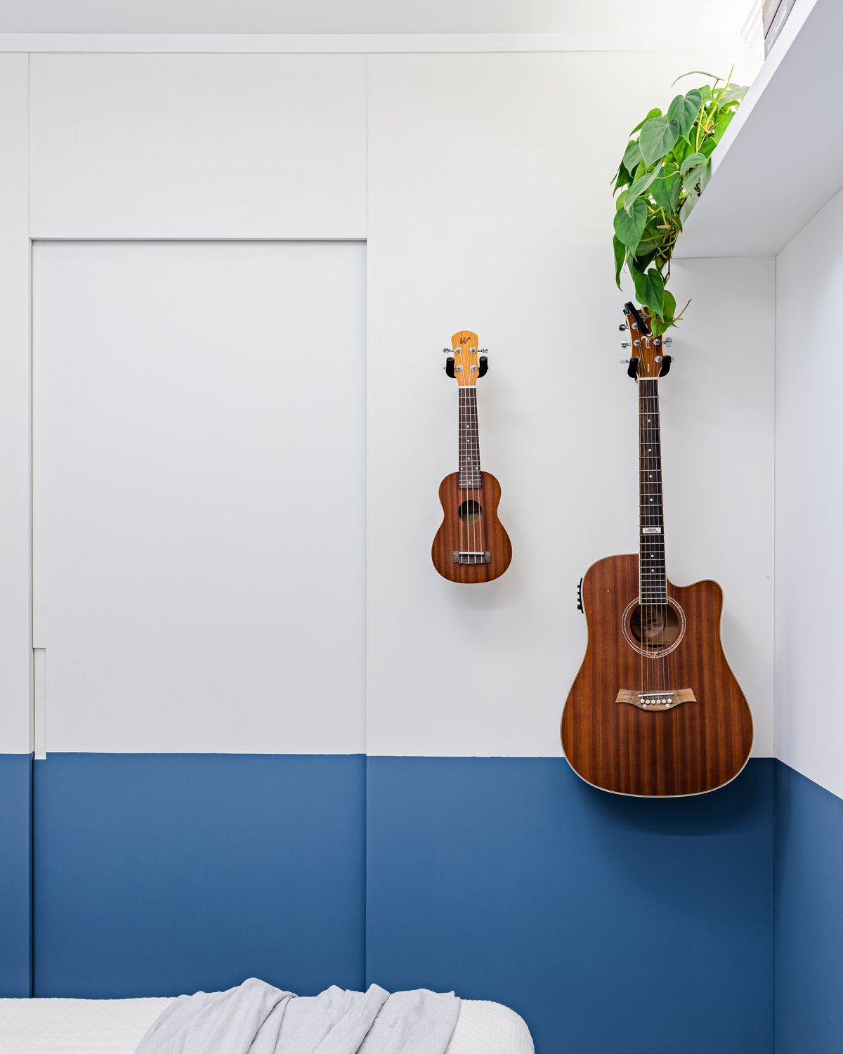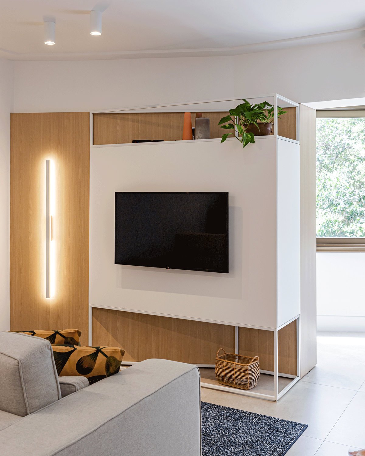 Destaque para a estante multiusos: nela, livros e recordações de viagem partilham espaço com um teclado retrátil, pronto para os momentos dedicados à música.