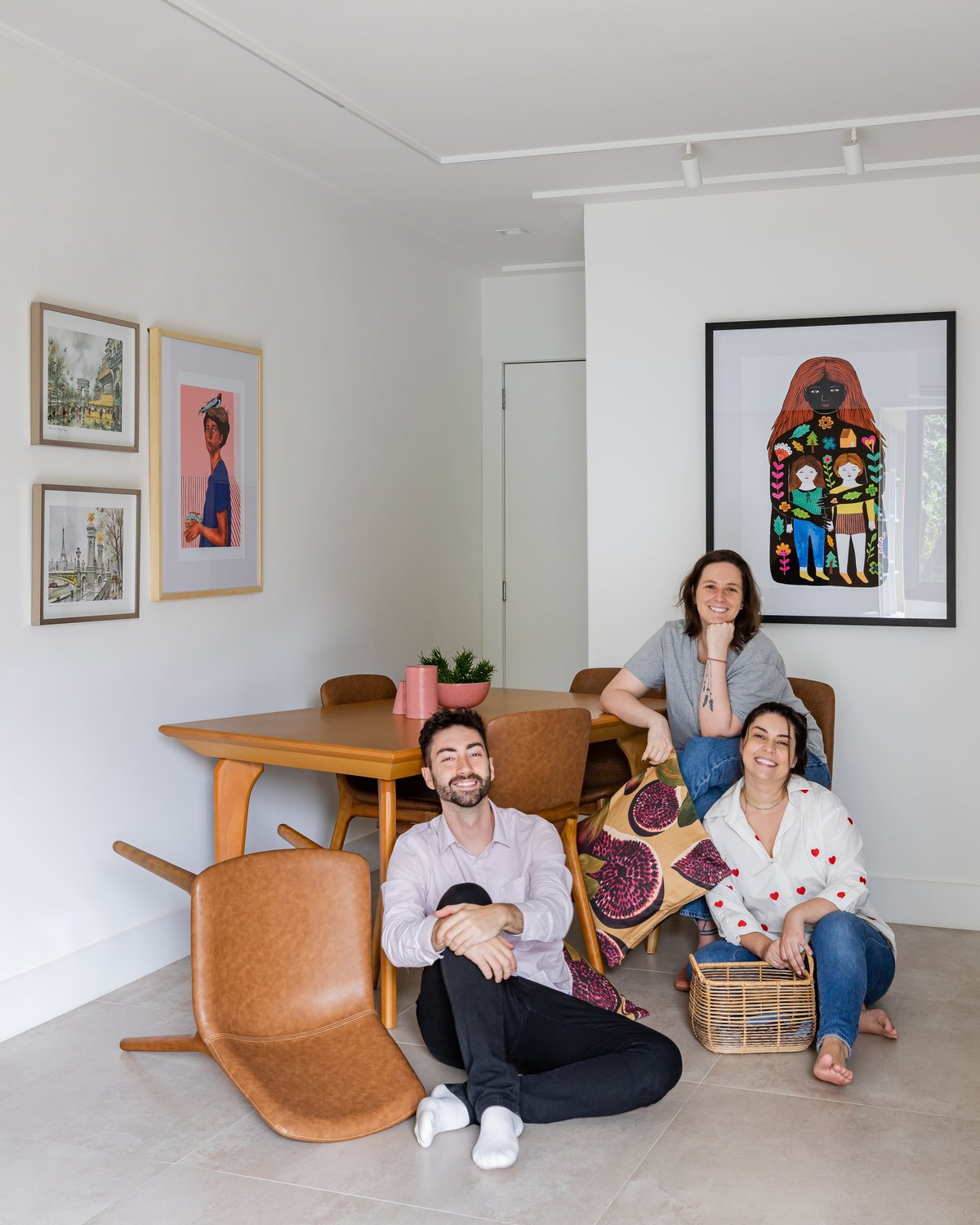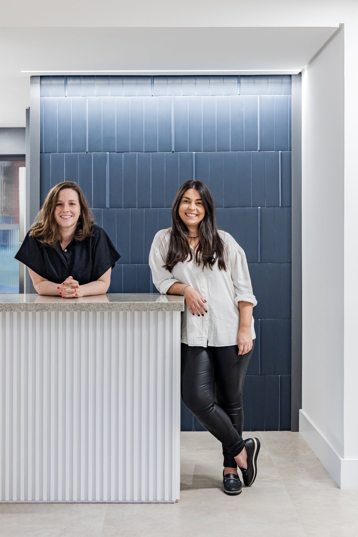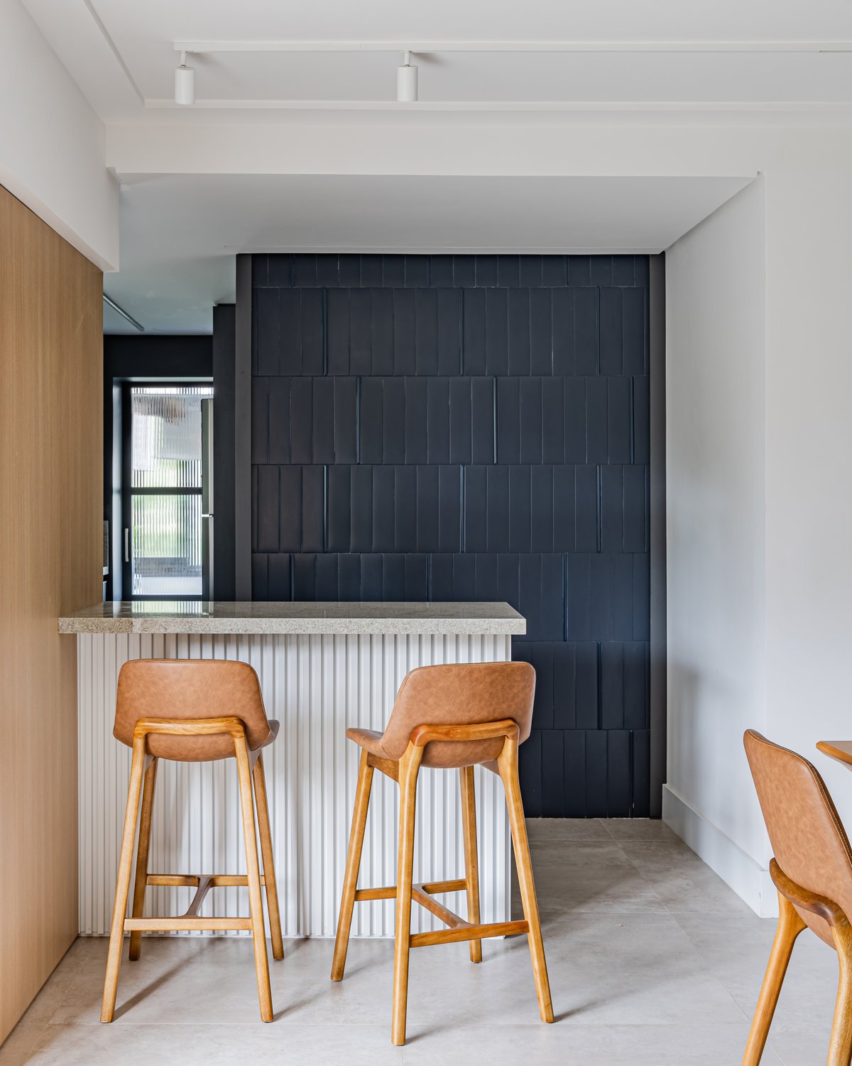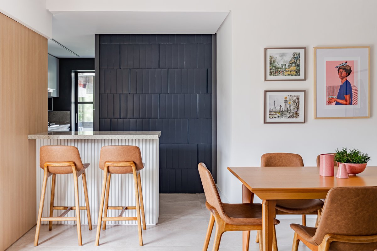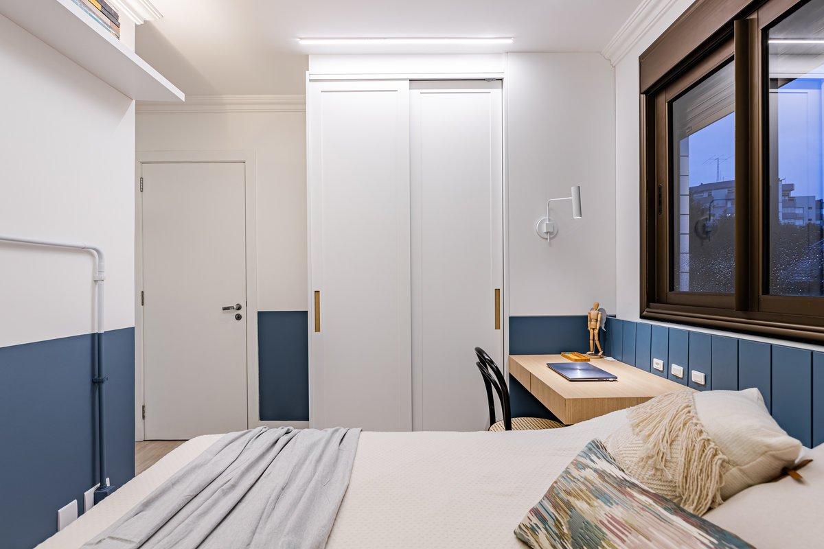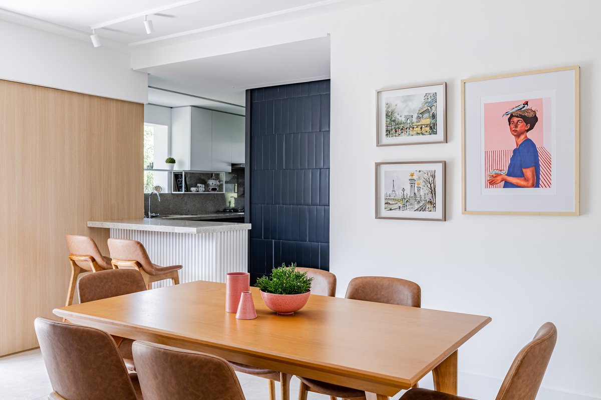 ‘Um apartamento dominado por mulheres: a mãe e as suas duas filhas universitárias são as moradoras deste lar. A pedido delas, o projeto deveria refletir um estilo clean, mas sem abdicar da personalidade. O azul, cor favorita de todas, destacou-se no revestimento entre a sala e a cozinha, criando um belíssimo contraponto com o aparador em rosa queimado, desenhado pelo nosso escritório.