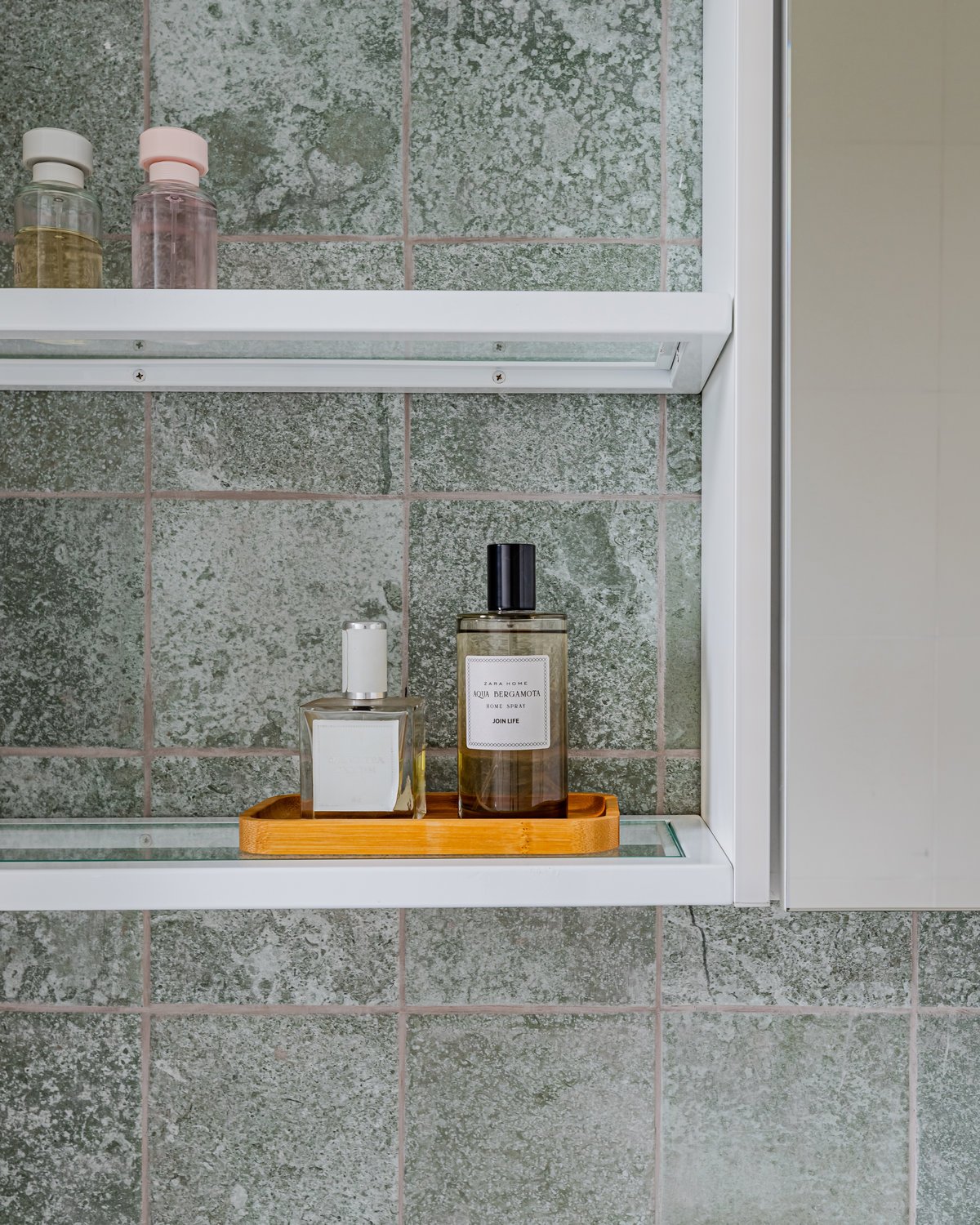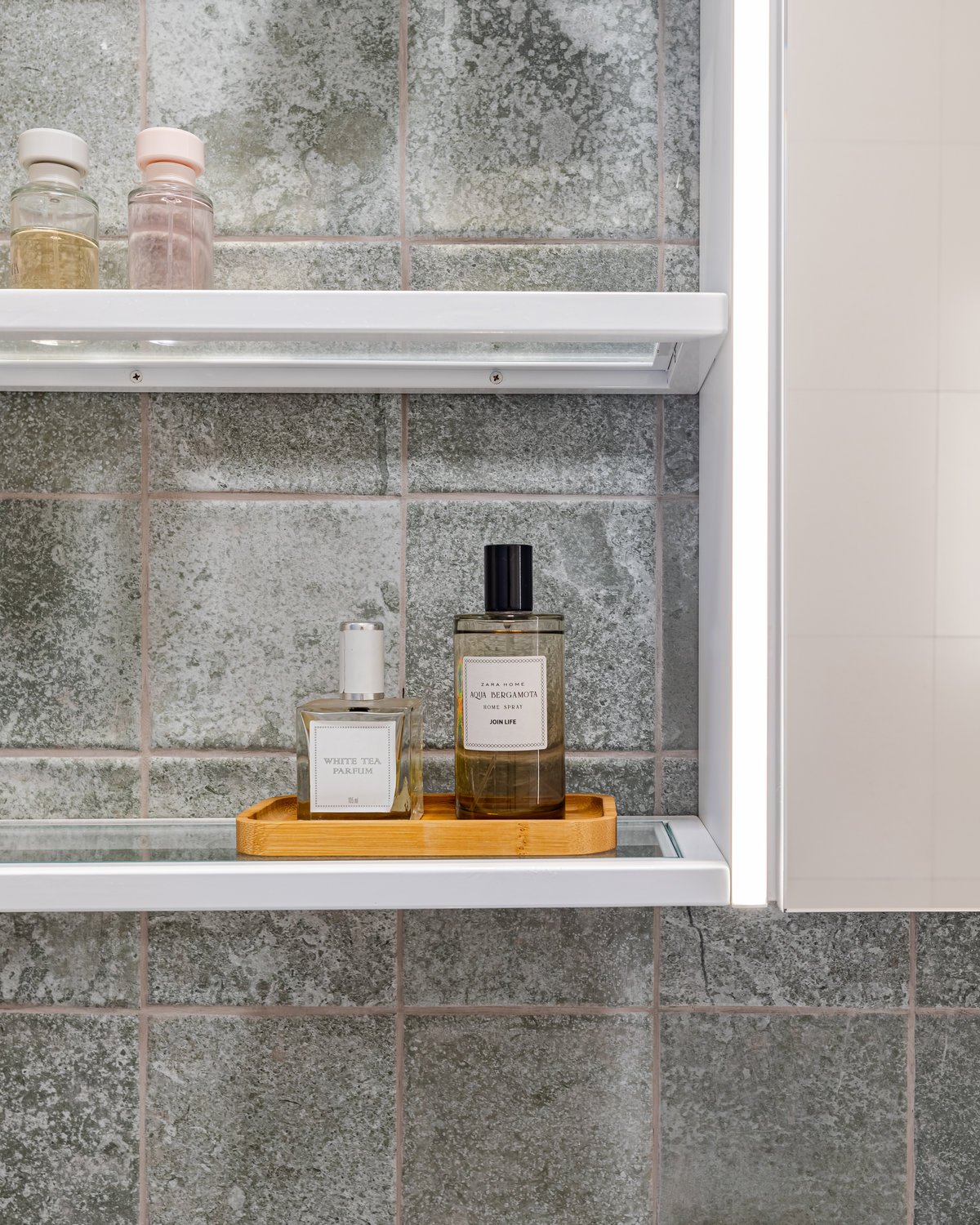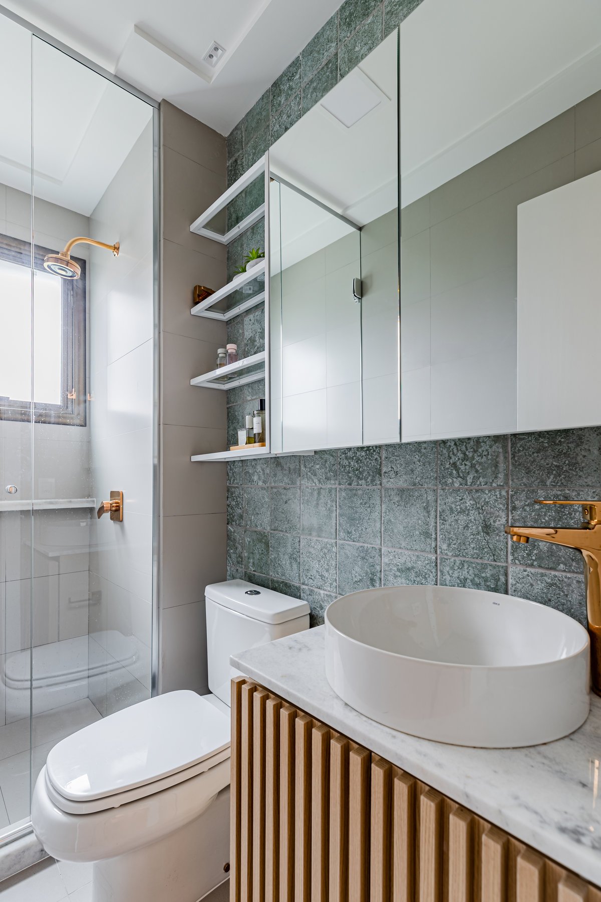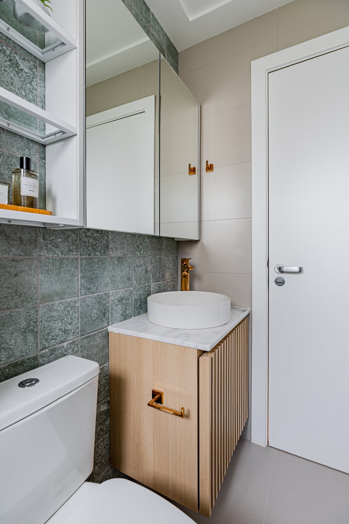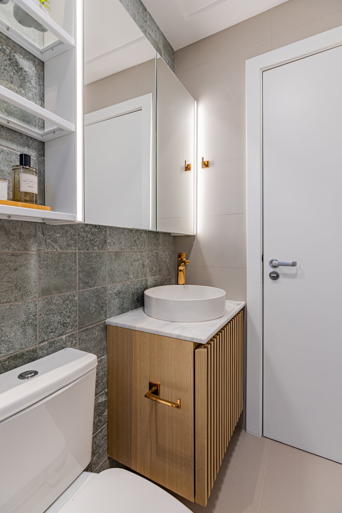 ‘Um apartamento dominado por mulheres: a mãe e as suas duas filhas universitárias são as moradoras deste lar. A pedido delas, o projeto deveria refletir um estilo clean, mas sem abdicar da personalidade. O azul, cor favorita de todas, destacou-se no revestimento entre a sala e a cozinha, criando um belíssimo contraponto com o aparador em rosa queimado, desenhado pelo nosso escritório.