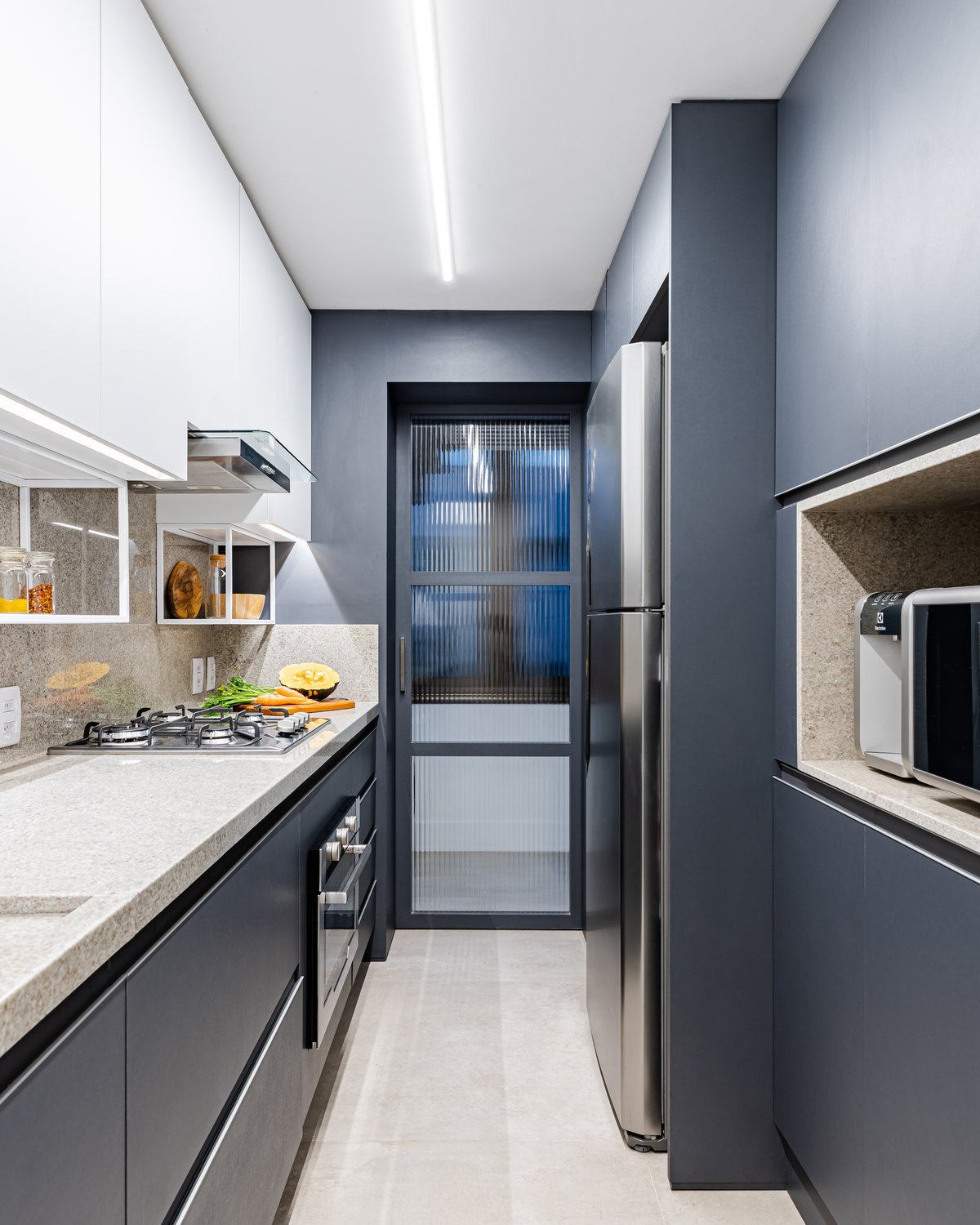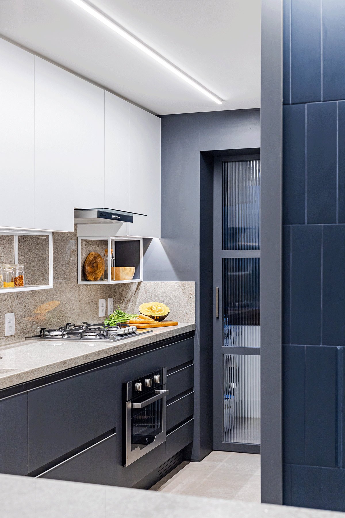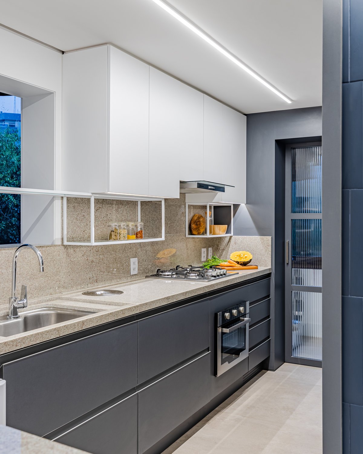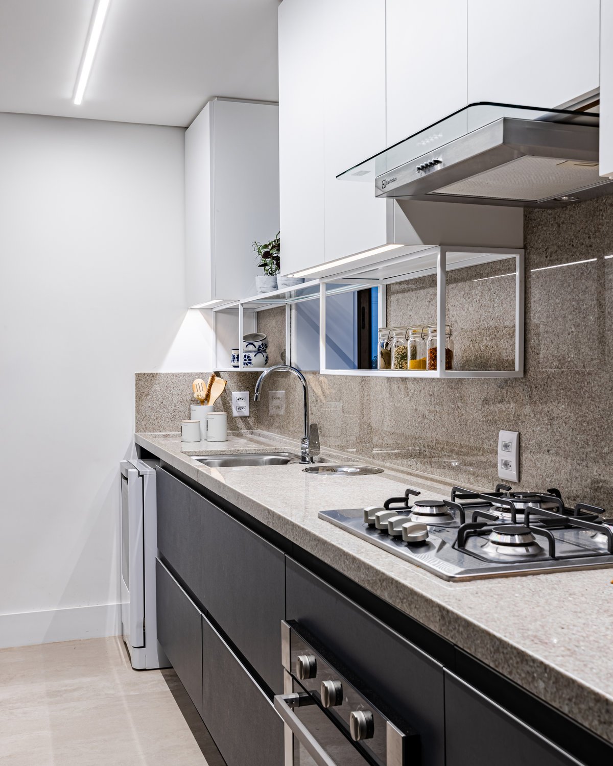 A cozinha recebeu um tampo em granito Branco Itaúnas, complementado pela marcenaria com a combinação de mdf melamínico em tons de cinza e branco. Para acrescentar ainda mais funcionalidade e detalhe ao espaço, foi aplicada uma estrutura metálica para acomodar pequenos utensílios de cozinha. ’