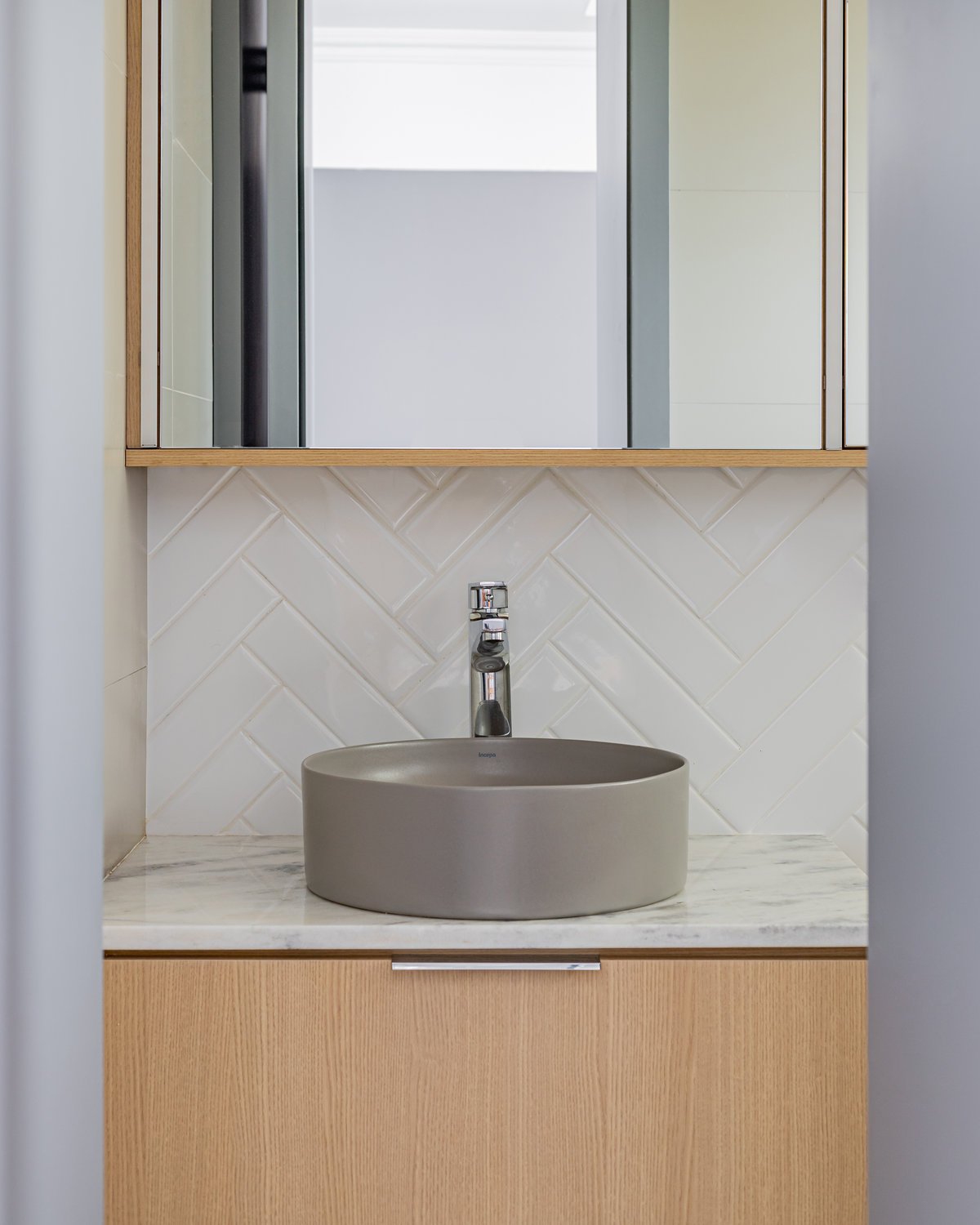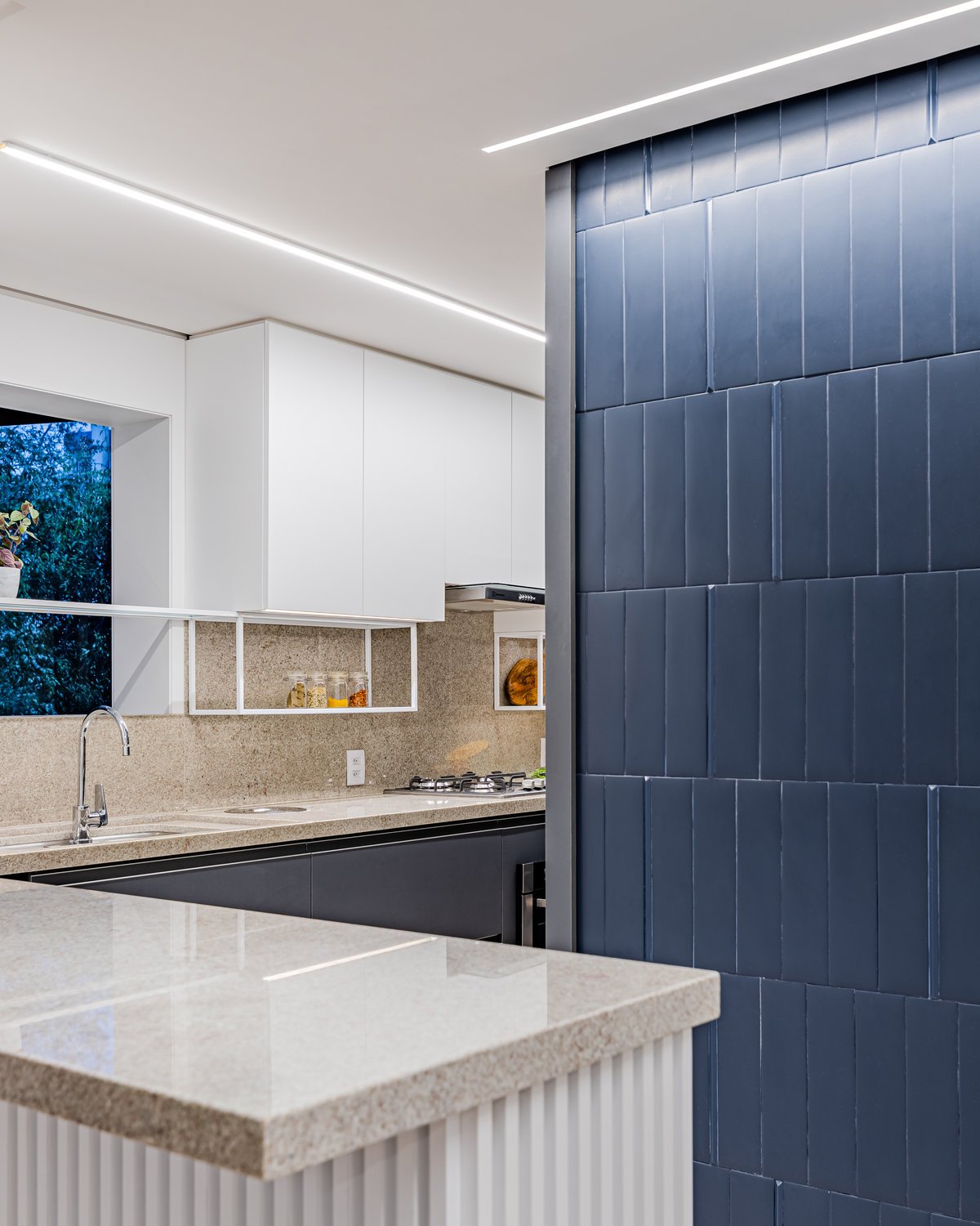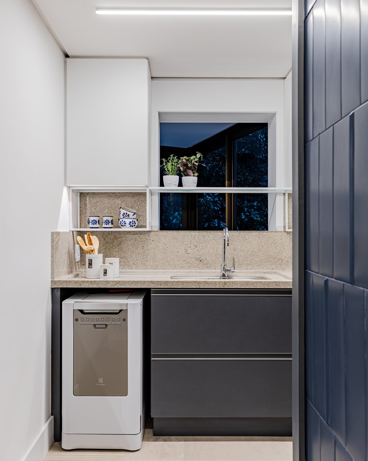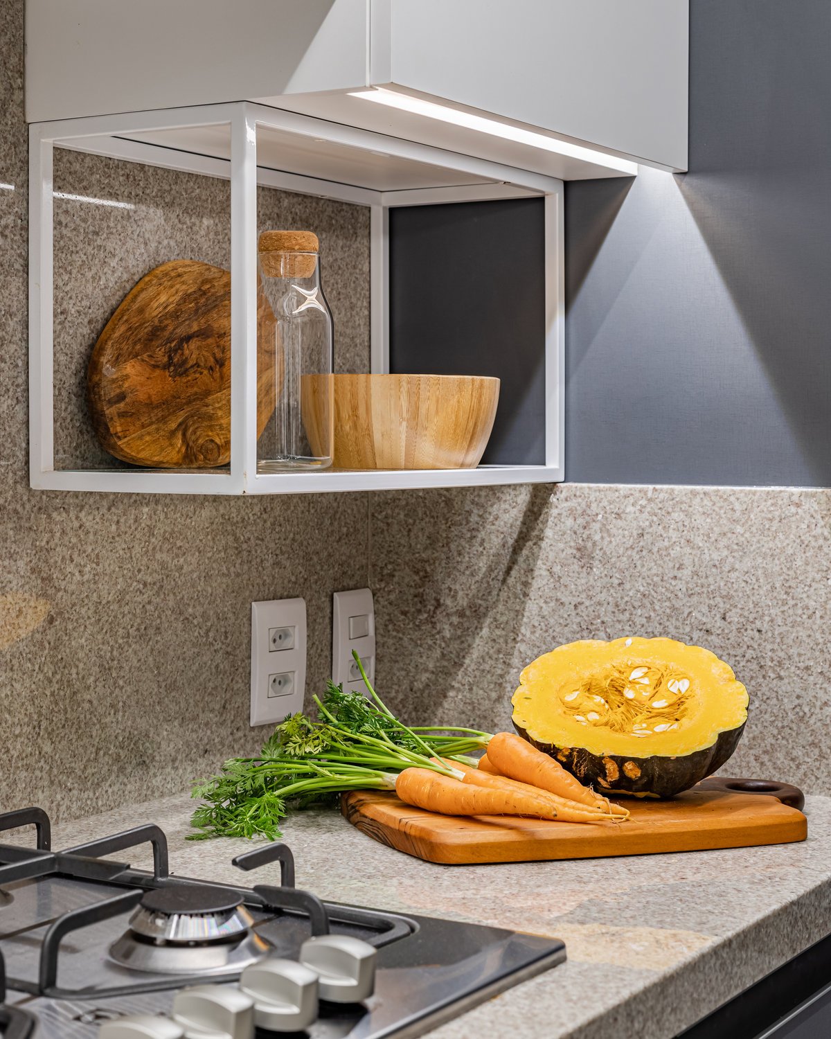 A cozinha recebeu um tampo em granito Branco Itaúnas, complementado pela marcenaria com a combinação de mdf melamínico em tons de cinza e branco. Para acrescentar ainda mais funcionalidade e detalhe ao espaço, foi aplicada uma estrutura metálica para acomodar pequenos utensílios de cozinha. ’