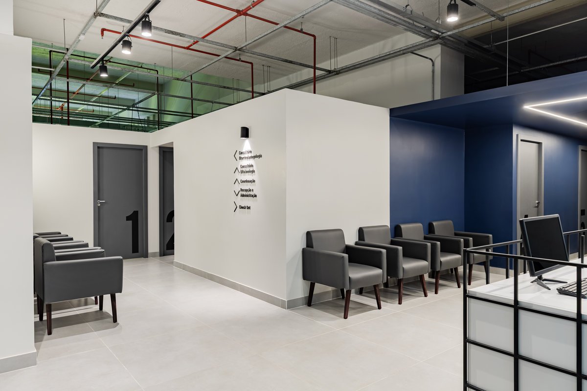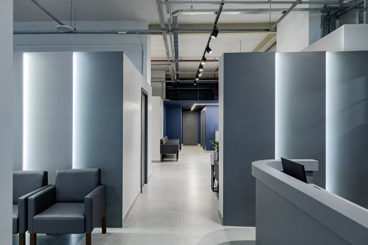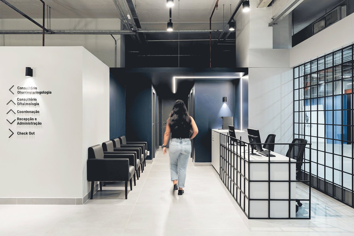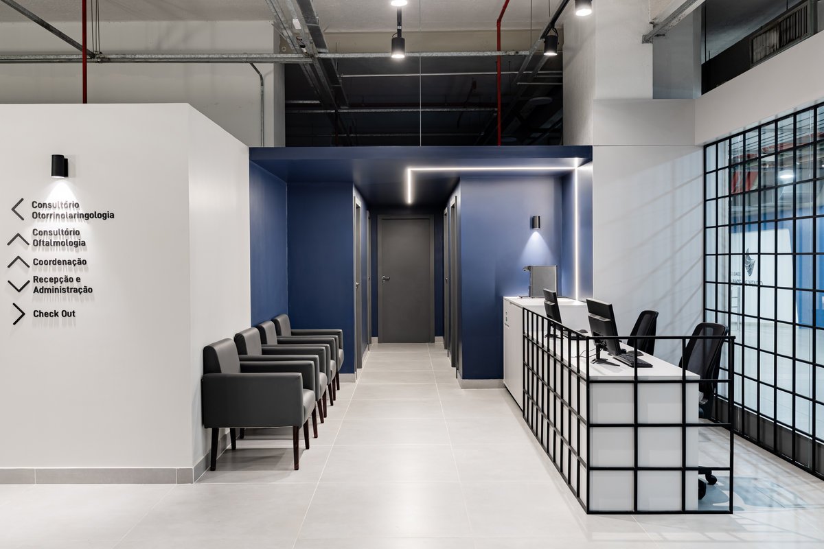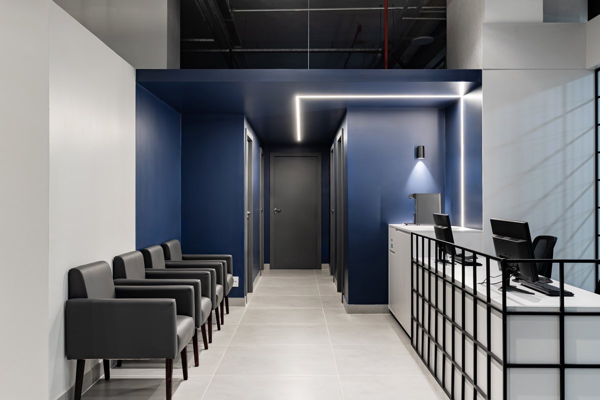 Para destacar a fachada e delimitar a área de recepção, foram criados painéis em tons de cinza que formam um degradê, intercalados com perfis de LED, reforçando o conceito contemporâneo do projeto. A clínica conta com cinco consultórios e, para facilitar a orientação dos pacientes, foi projetado um “túnel azul” que conduz visualmente até essa ala.