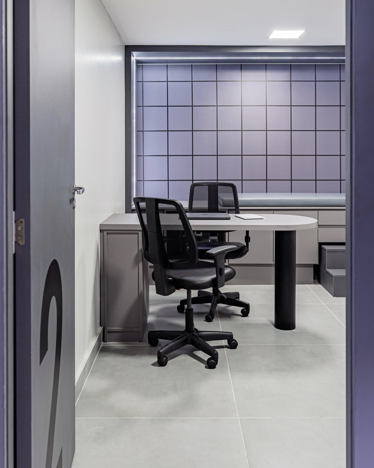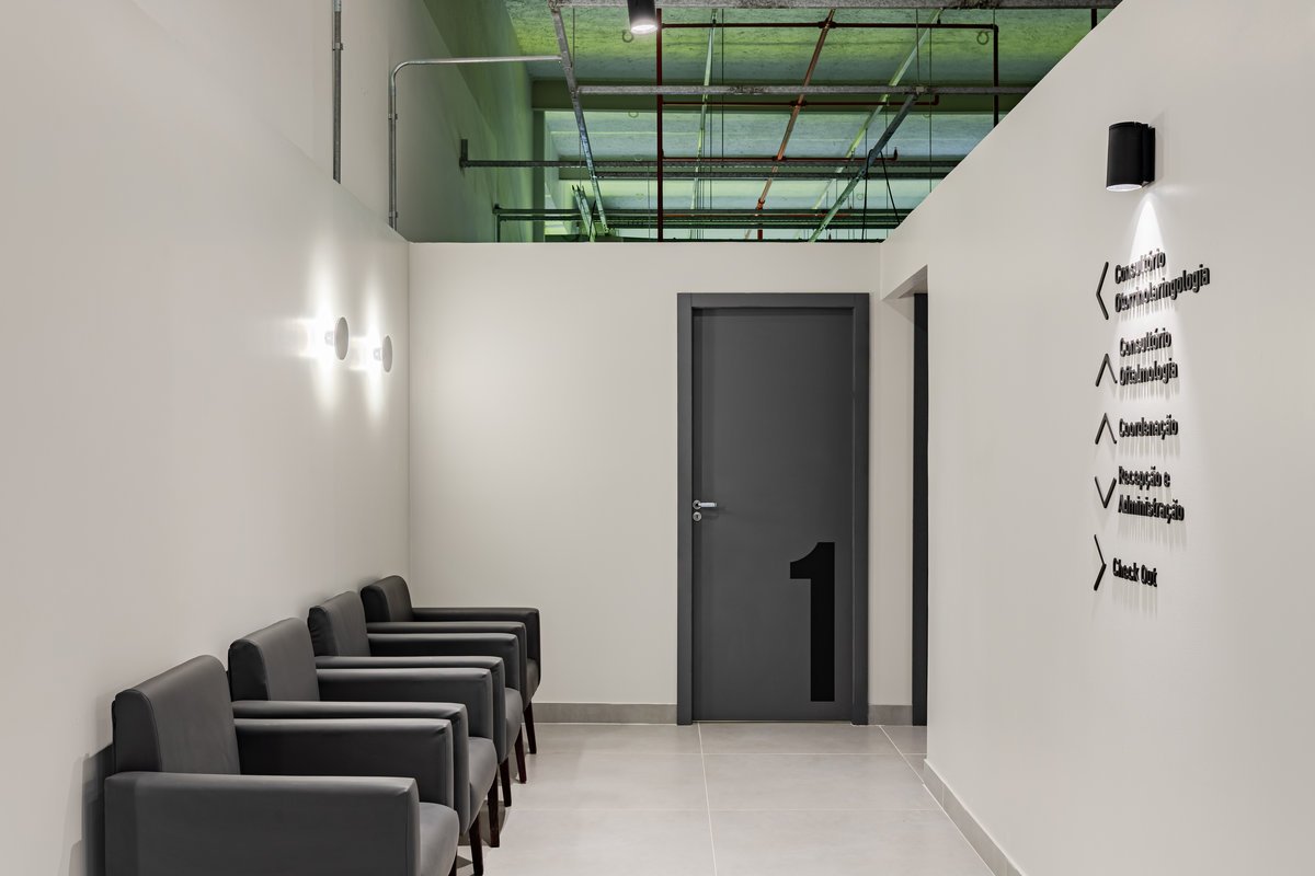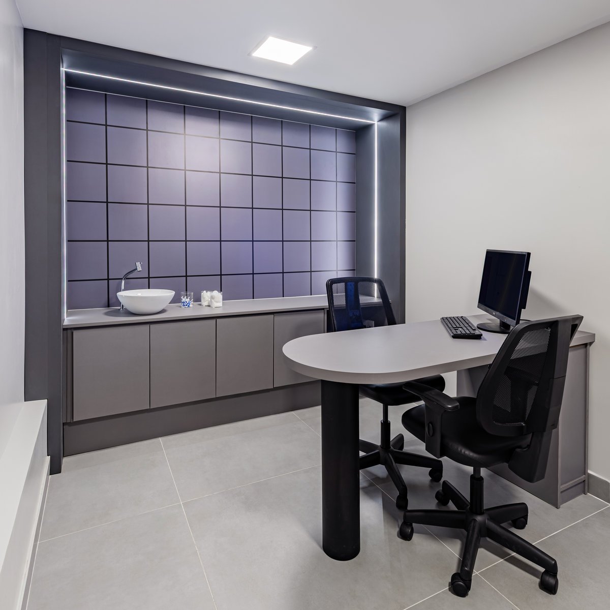 Para destacar a fachada e delimitar a área de recepção, foram criados painéis em tons de cinza que formam um degradê, intercalados com perfis de LED, reforçando o conceito contemporâneo do projeto. A clínica conta com cinco consultórios e, para facilitar a orientação dos pacientes, foi projetado um “túnel azul” que conduz visualmente até essa ala.