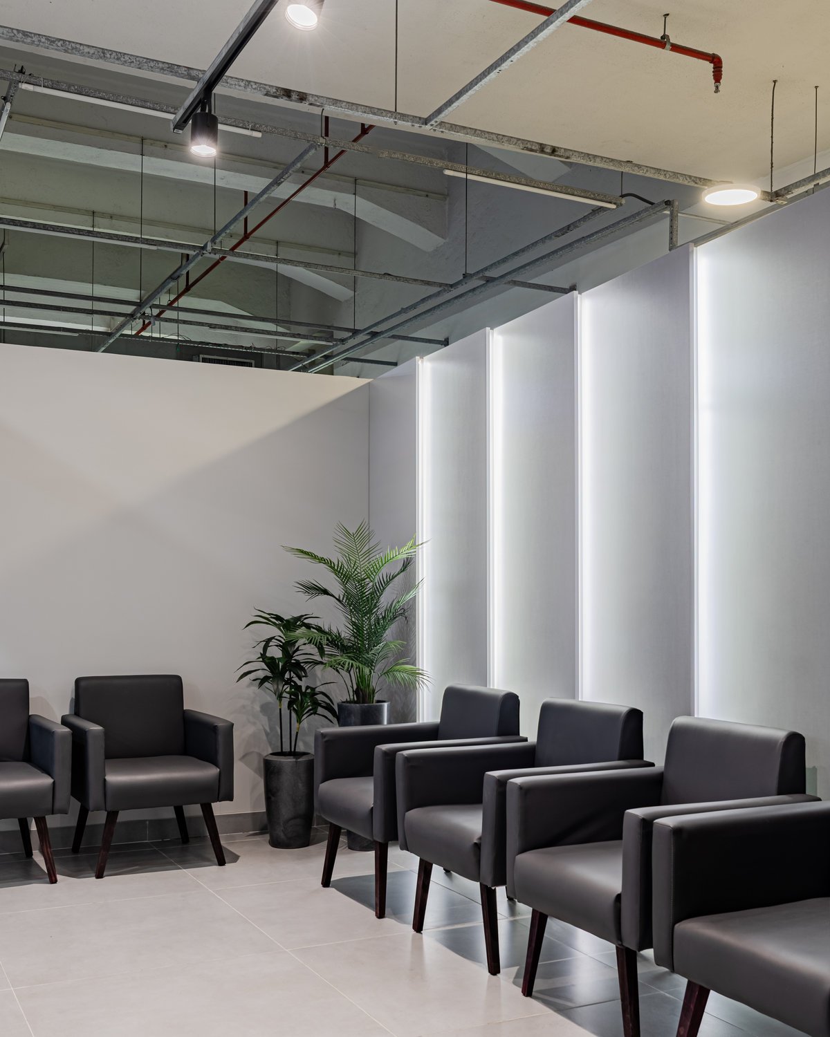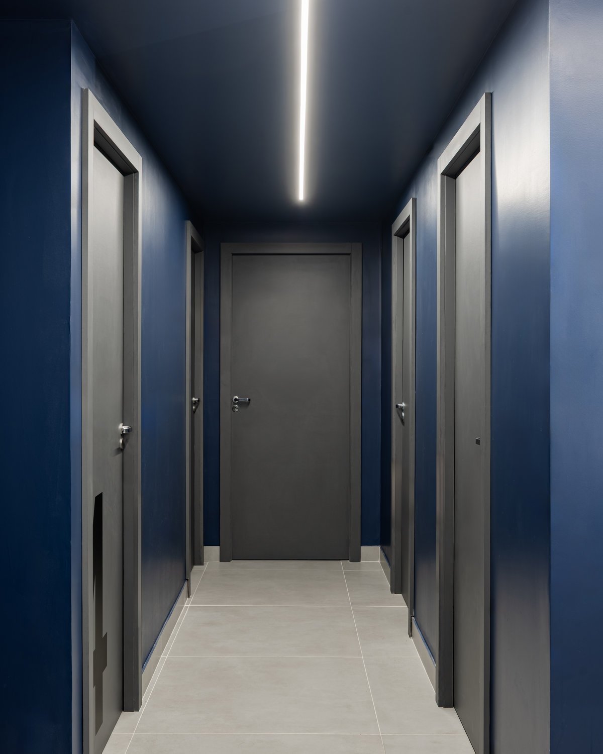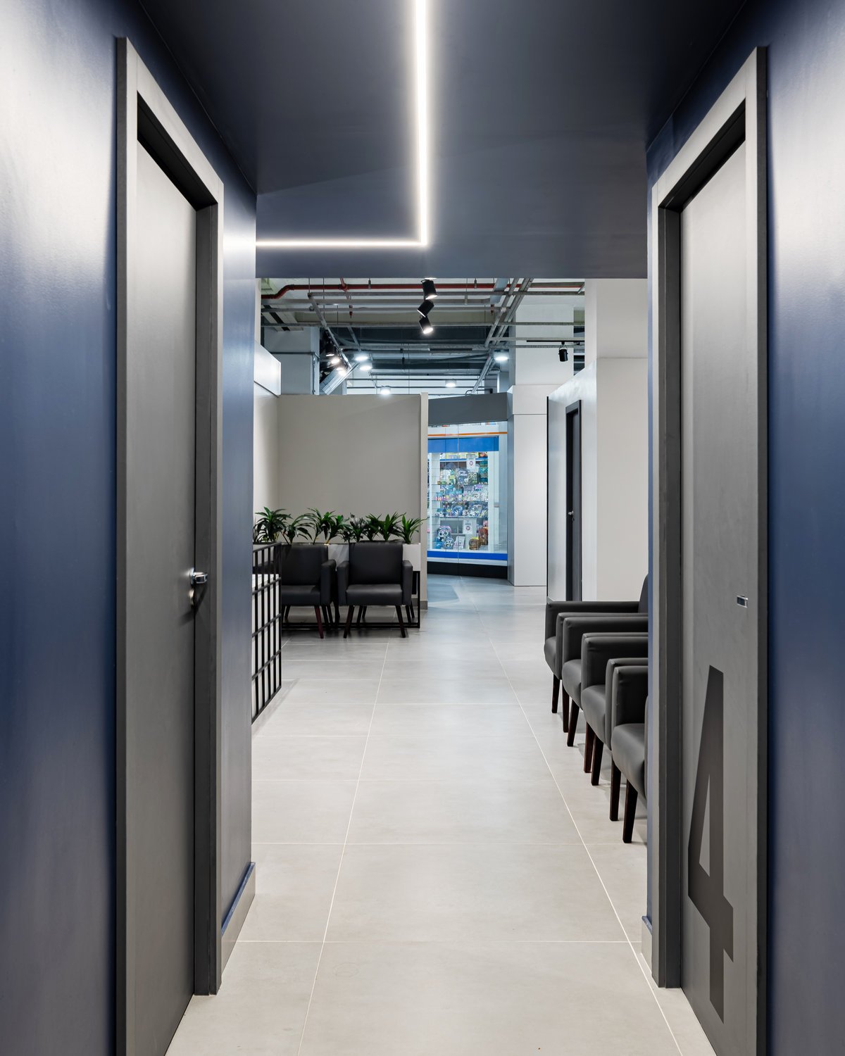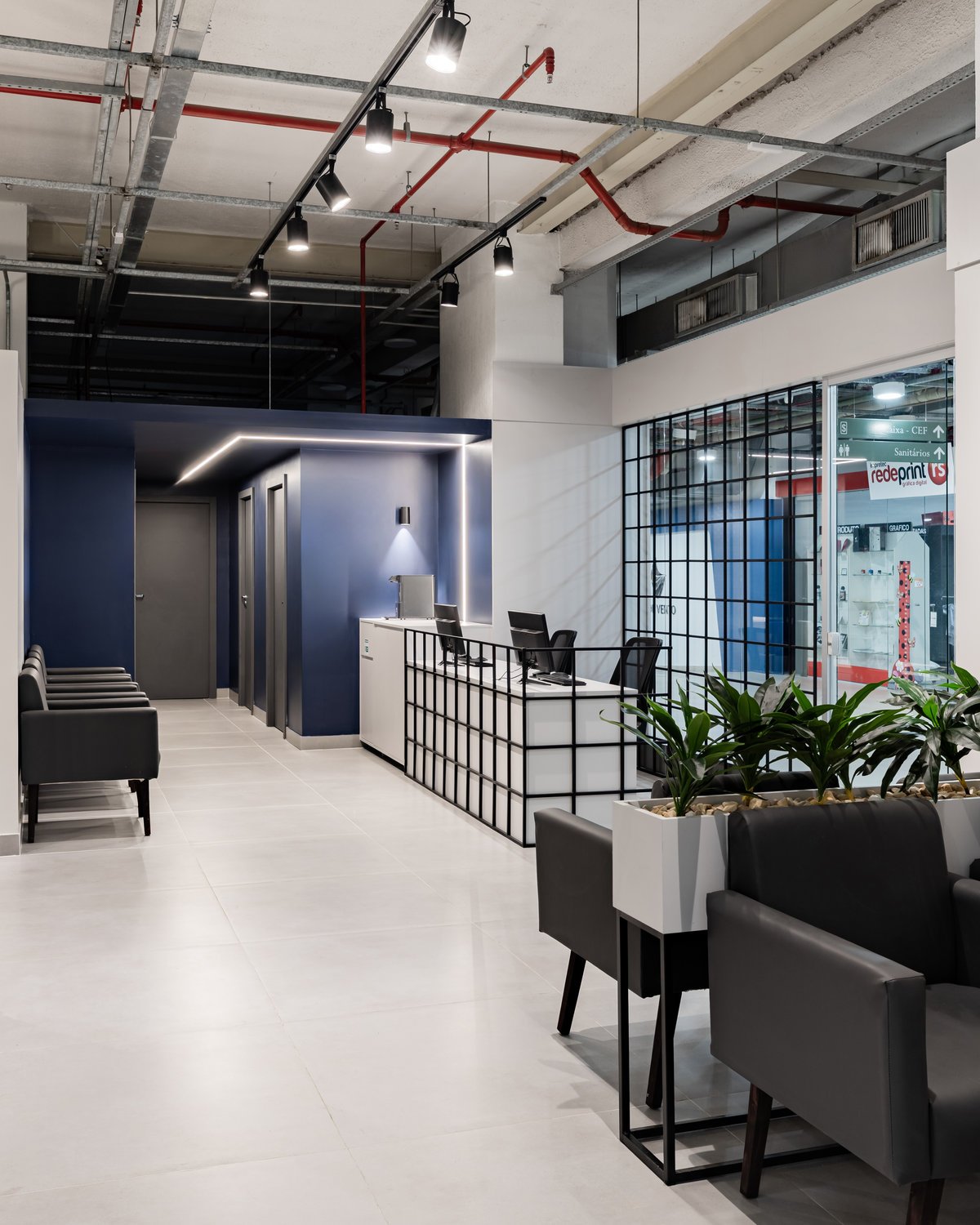 Para destacar a fachada e delimitar a área de recepção, foram criados painéis em tons de cinza que formam um degradê, intercalados com perfis de LED, reforçando o conceito contemporâneo do projeto. A clínica conta com cinco consultórios e, para facilitar a orientação dos pacientes, foi projetado um “túnel azul” que conduz visualmente até essa ala.