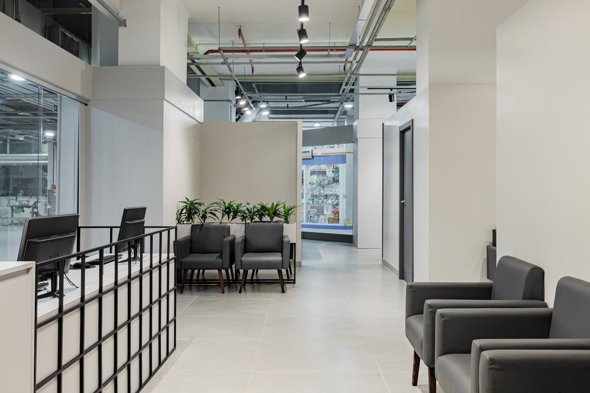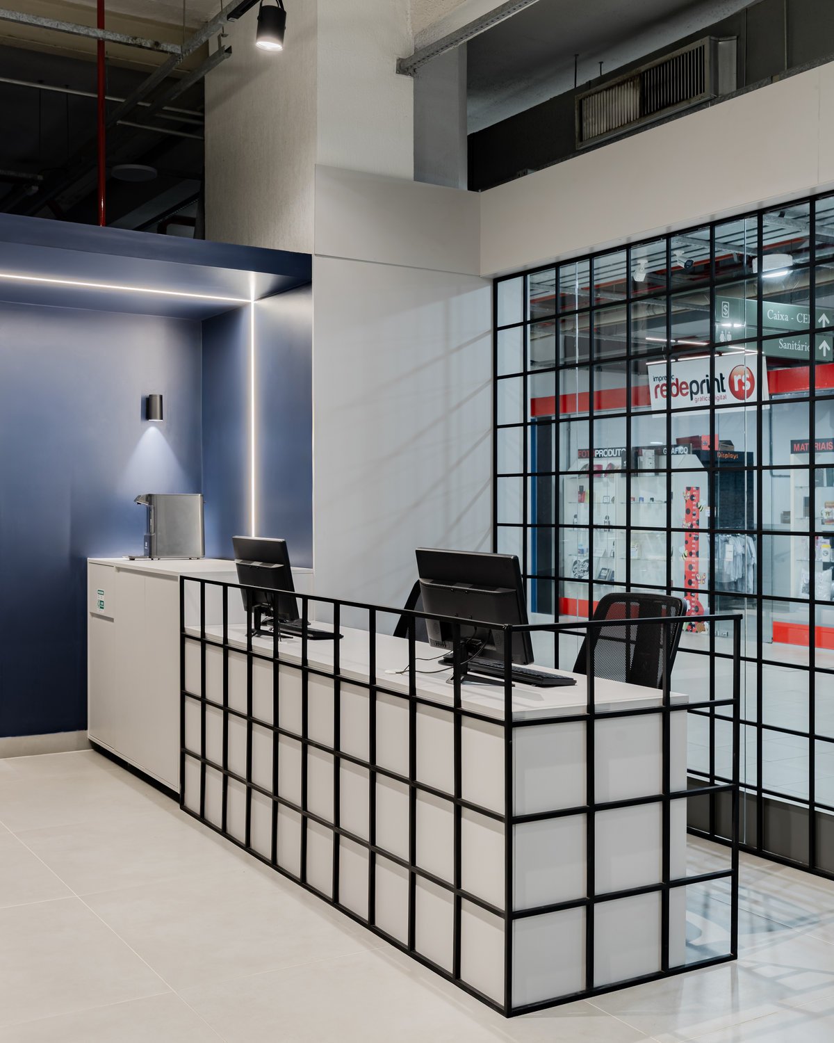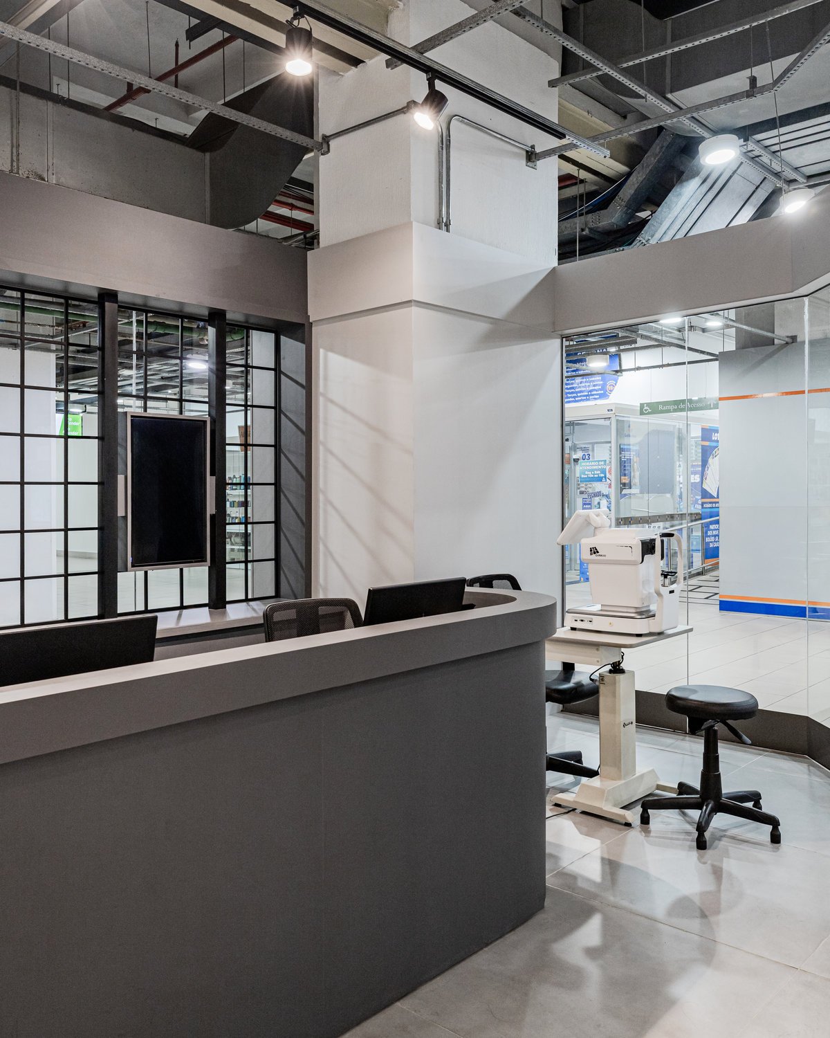 A área de checkout e agendamentos recebeu uma bancada com detalhe em estrutura metálica, que dialoga com o desenho da vitrine e reforça a unidade estética do espaço. Já nos consultórios, foi criado um pórtico com iluminação em LED na área de apoio ao médico, enquanto o fundo recebeu um adesivo com o mesmo padrão das grades metálicas presentes no checkout e na vitrine, garantindo coesão visual em todos os ambientes.