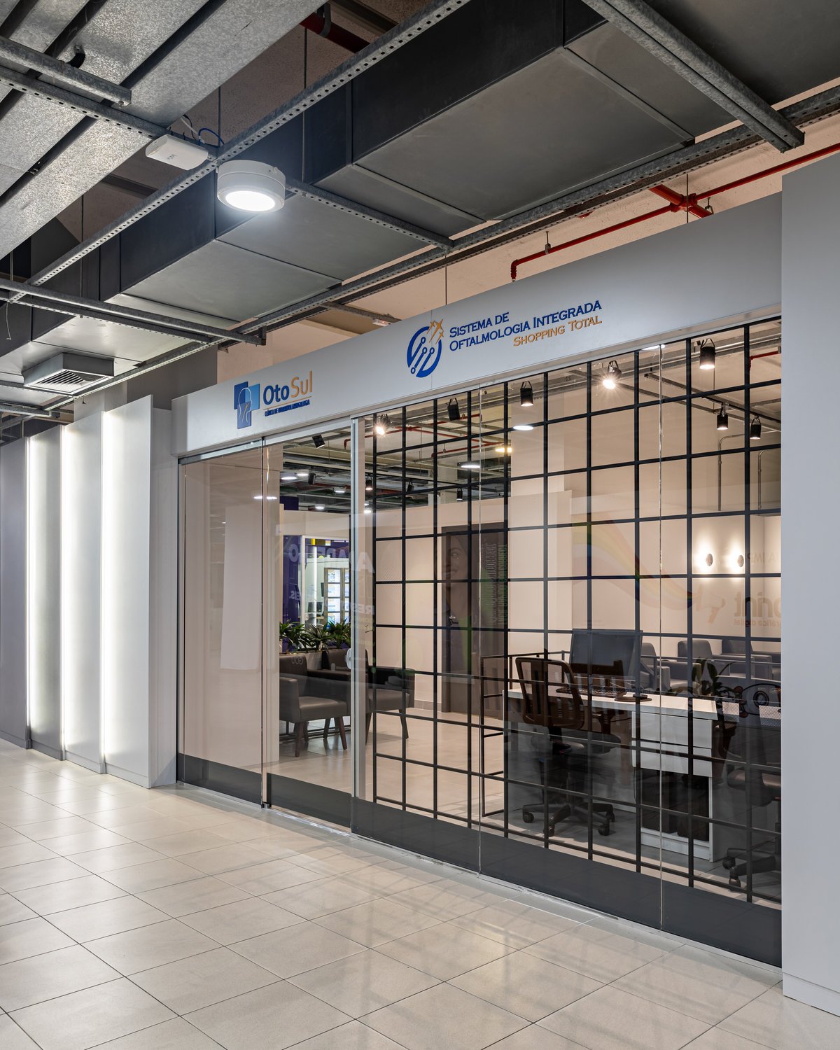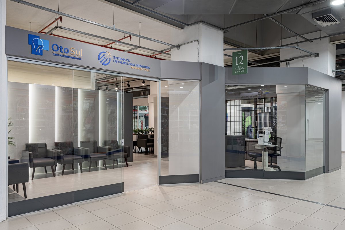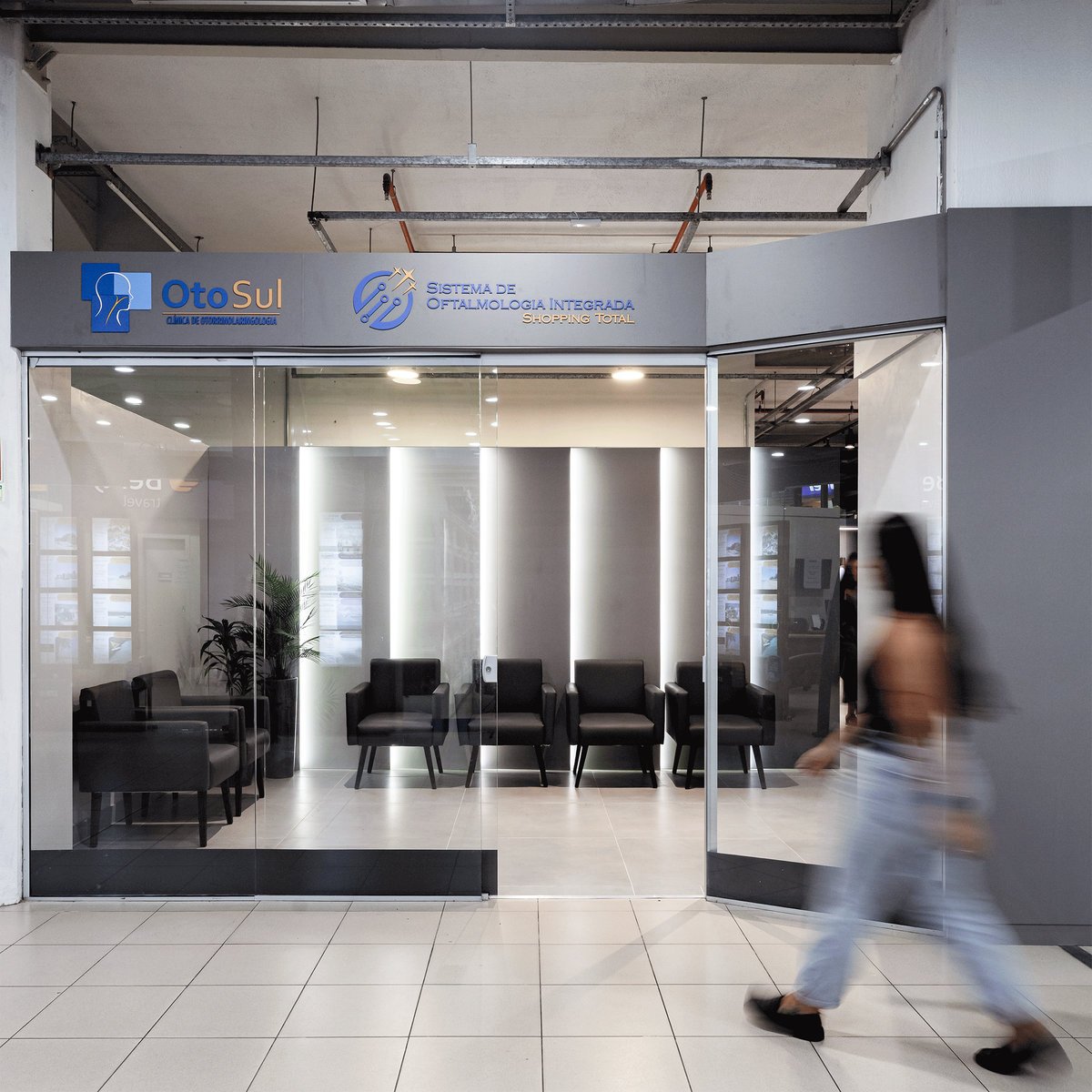 Após desenvolvermos seis projetos para diferentes filiais da clínica de oftalmologia, surgiu o desafio de criar uma nova unidade dentro de um shopping em Porto Alegre — agora incorporando também a especialidade de otorrinolaringologia. A proposta envolvia não apenas a implantação da nova clínica, mas também a reformulação completa da identidade da marca, com uma linguagem mais moderna e tecnológica.